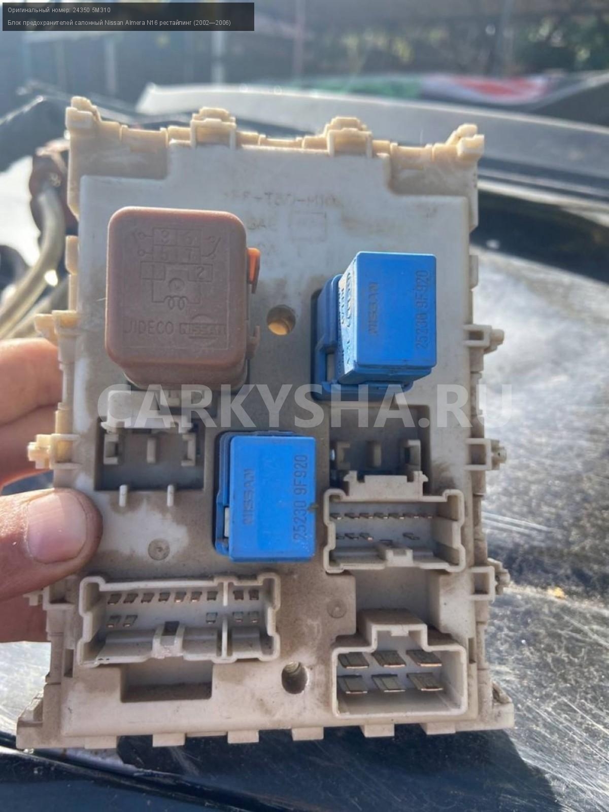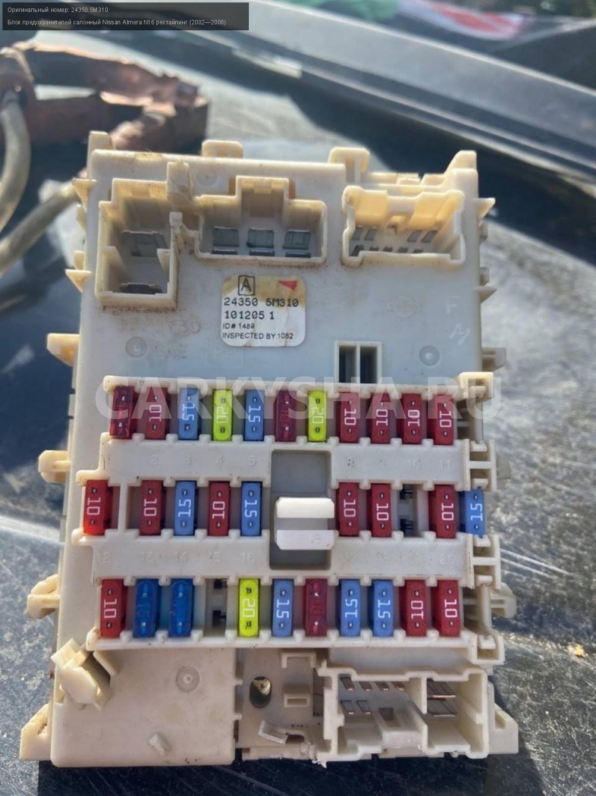 Nissan Almera N16, блок предохранителей салонный\nАртикул: 3247\n\nОриг. номер: 24350 5M310\nПроизводитель: NISSAN\nПримечание:Ниссан Альмера N16, блок предохранителей салонный, б/у\n\nМарка: Nissan\nМодель: Almera N16 рестайлинг (2002—2006)\nГод выпуска: 2005\nКузов тип: Хетчбэк\nДвигатель номер: QG15DE\nМодель двигателя: инжектор\nОбъем: 1.5\nТопливо: Бензин\nКоробка: Механика\nЦвет: Черный\nСовместимости: Nissan Almera N16 рестайлинг (2002—2006) 1.5 MT (98 л.с.)\nСовместимость: