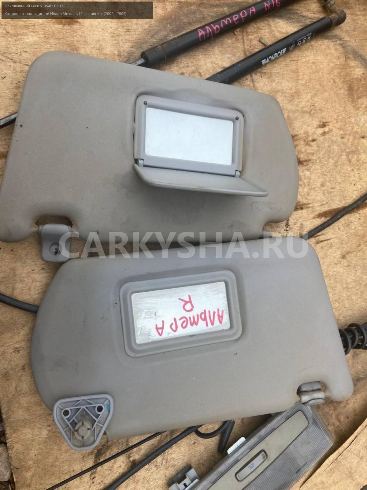 Nissan Almera N16, козырьки солнцезащитные.\nАртикул: 3470\n\nОриг. номер: 96401BN470\nПроизводитель: NISSAN\nПримечание:Ниссан Альмера N16, козырьки солнцезащитные, б/у, цена за пару.\n\nМарка: Nissan\nМодель: Almera N16 рестайлинг (2002—2006)\nГод выпуска: 2005\nКузов тип: Хетчбэк\nДвигатель номер: QG15DE\nМодель двигателя: инжектор\nОбъем: 1.5\nТопливо: Бензин\nКоробка: Механика\nЦвет: Черный\nПраво/Лево: Право/Лево\nСовместимости: Nissan Almera N16 рестайлинг (2002—2006) 1.5 MT (98 л.с.)\nСовместимость: