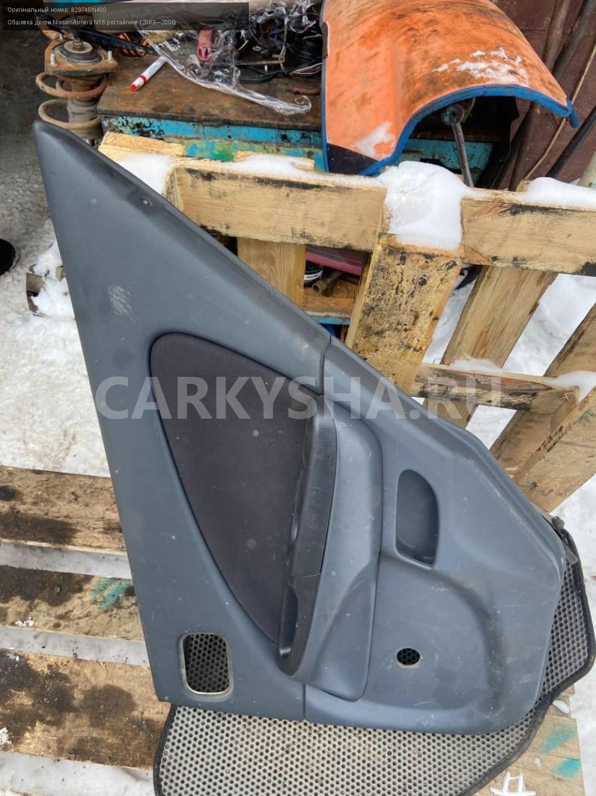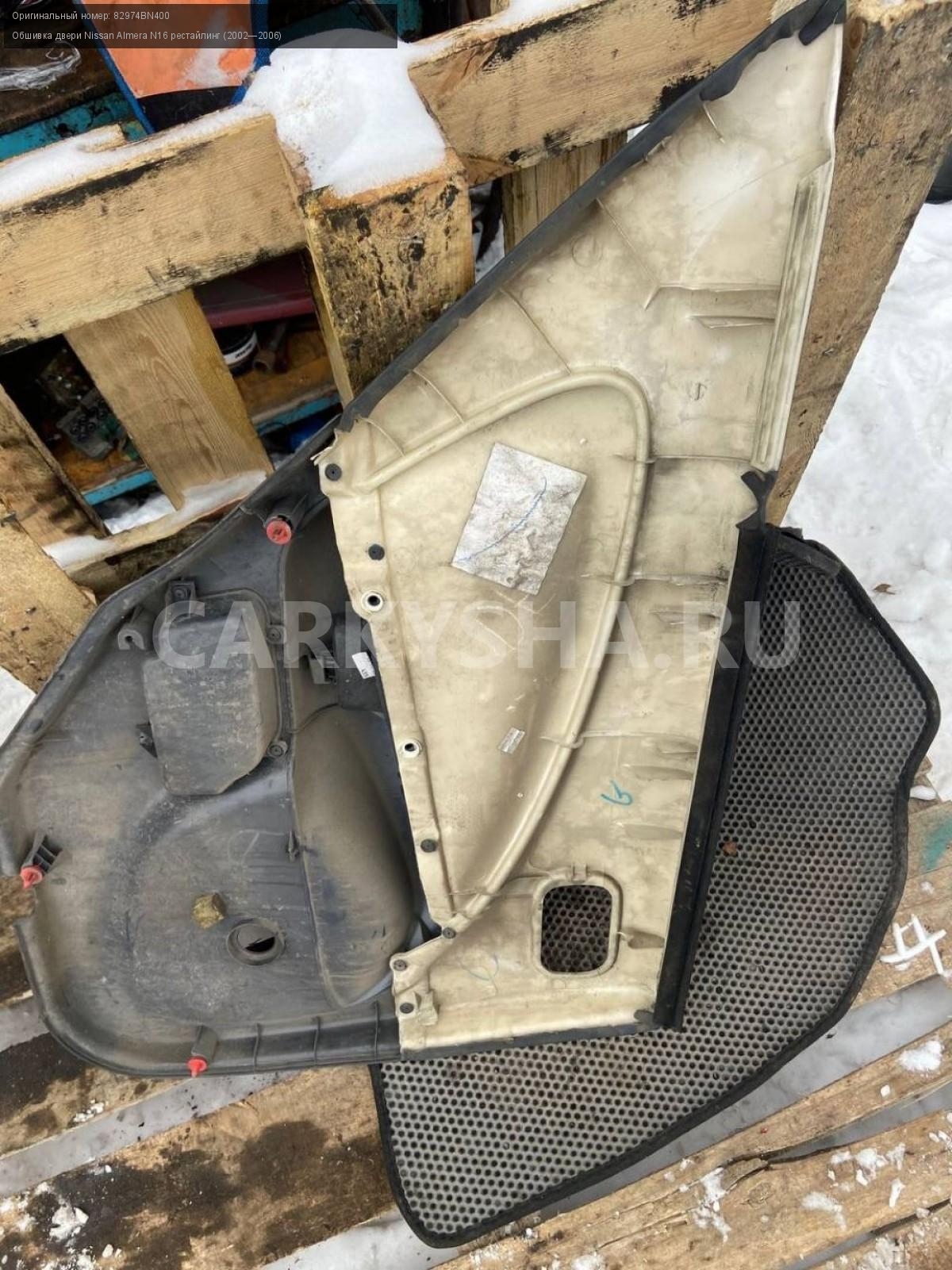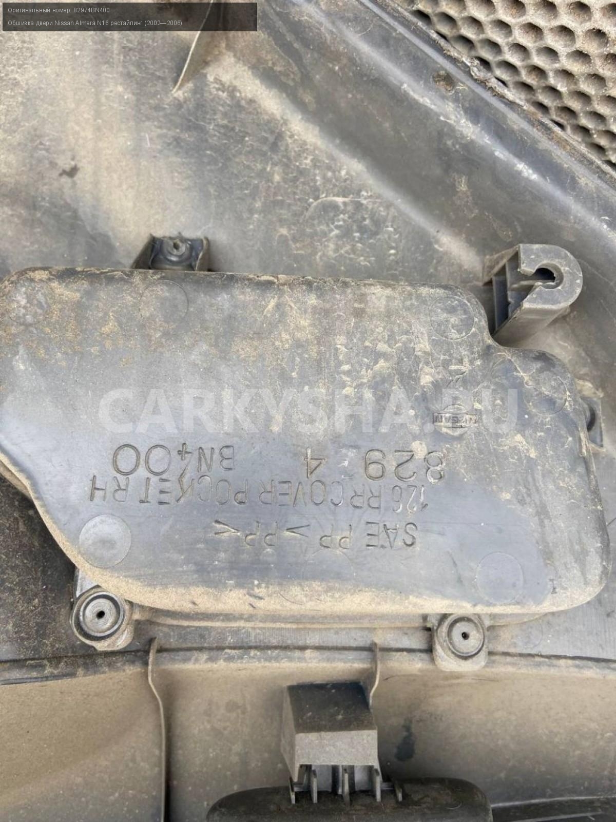 Nissan Almera N16 хэтч. обшивка двери задней прав.\nАртикул: 7155\n\nОриг. номер: 82974BN400\nПроизводитель: NISSAN\nПримечание:Ниссан Альмера N16 хэтчбек, обшивка двери, карта двери задней правой, б/у. \n\nМарка: Nissan\nМодель: Almera N16 рестайлинг (2002—2006)\nГод выпуска: 2004\nКузов тип: Хетчбэк\nДвигатель номер: QG18DE\nМодель двигателя: инжектор\nОбъем: 1.8\nТопливо: Бензин\nКоробка: Механика\nЦвет: Черный\nПраво/Лево: Право\nПеред/Зад: Зад\nСовместимости: Nissan Almera N16 рестайлинг (2002—2006) 1.8 MT (116 л.с.)\nСовместимость: