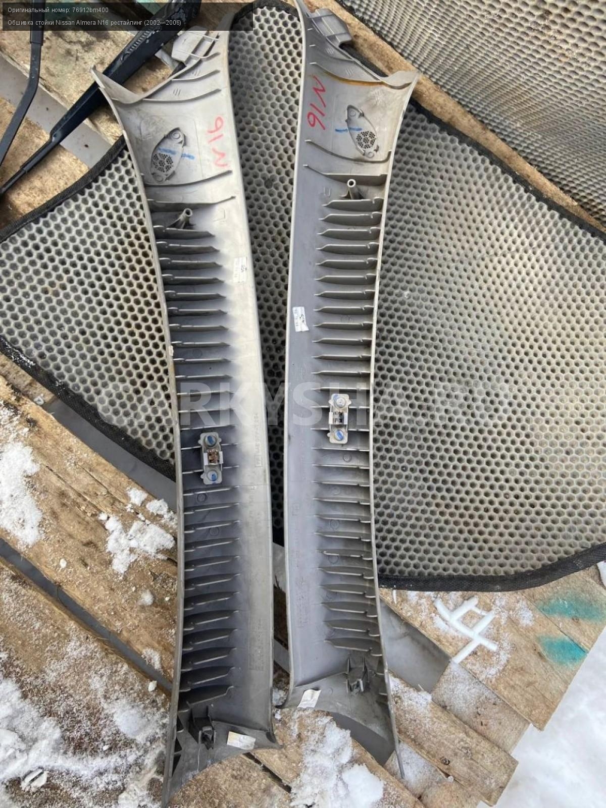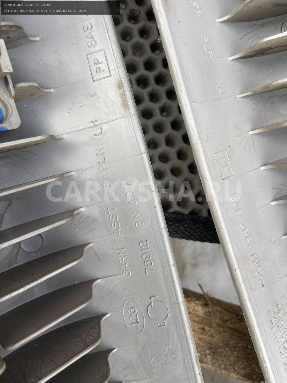 Nissan Almera N16, обшивка стоек лобового стекла.\nАртикул: 7124\n\nОриг. номер: 76912bm400\nПроизводитель: NISSAN\nПримечание:Ниссан Альмера N16, обшивки стоек лобового стекла, цена за пару, б/у. \n\nМарка: Nissan\nМодель: Almera N16 рестайлинг (2002—2006)\nГод выпуска: 2004\nКузов тип: Хетчбэк\nДвигатель номер: QG18DE\nМодель двигателя: инжектор\nОбъем: 1.8\nТопливо: Бензин\nКоробка: Механика\nЦвет: Черный\nПраво/Лево: Право/Лево\nПеред/Зад: Перед\nСовместимости: Nissan Almera N16 рестайлинг (2002—2006) 1.8 MT (116 л.с.)\nСовместимость: