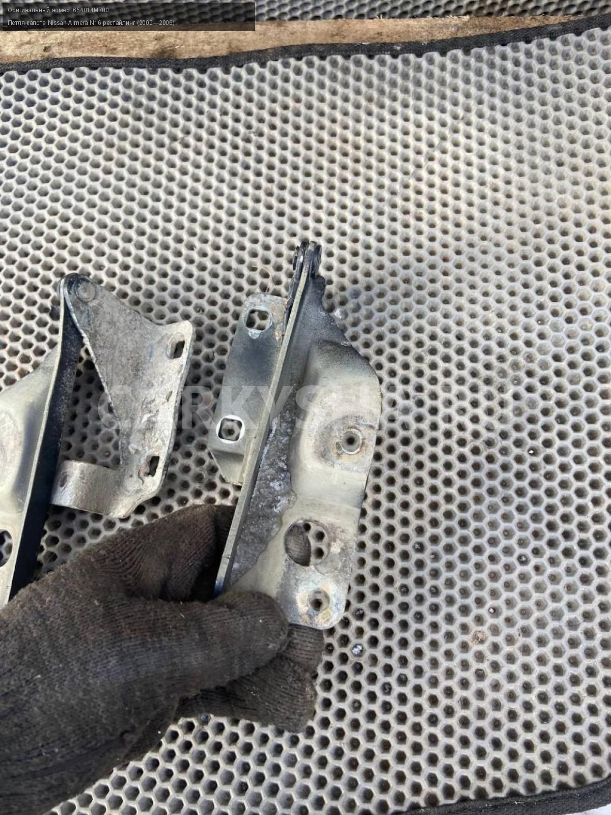 Nissan Almera N16 , Петли капота, пара.\nАртикул: 7121\n\nОриг. номер: 654014M700\nПроизводитель: NISSAN\nПримечание:Ниссан Альмера N16, петли капота, цена за пару, б/у. \n\nМарка: Nissan\nМодель: Almera N16 рестайлинг (2002—2006)\nГод выпуска: 2004\nКузов тип: Хетчбэк\nДвигатель номер: QG18DE\nМодель двигателя: инжектор\nОбъем: 1.8\nТопливо: Бензин\nКоробка: Механика\nЦвет: Черный\nПраво/Лево: Право/Лево\nСовместимости: Nissan Almera N16 рестайлинг (2002—2006) 1.8 MT (116 л.с.)\nСовместимость:
