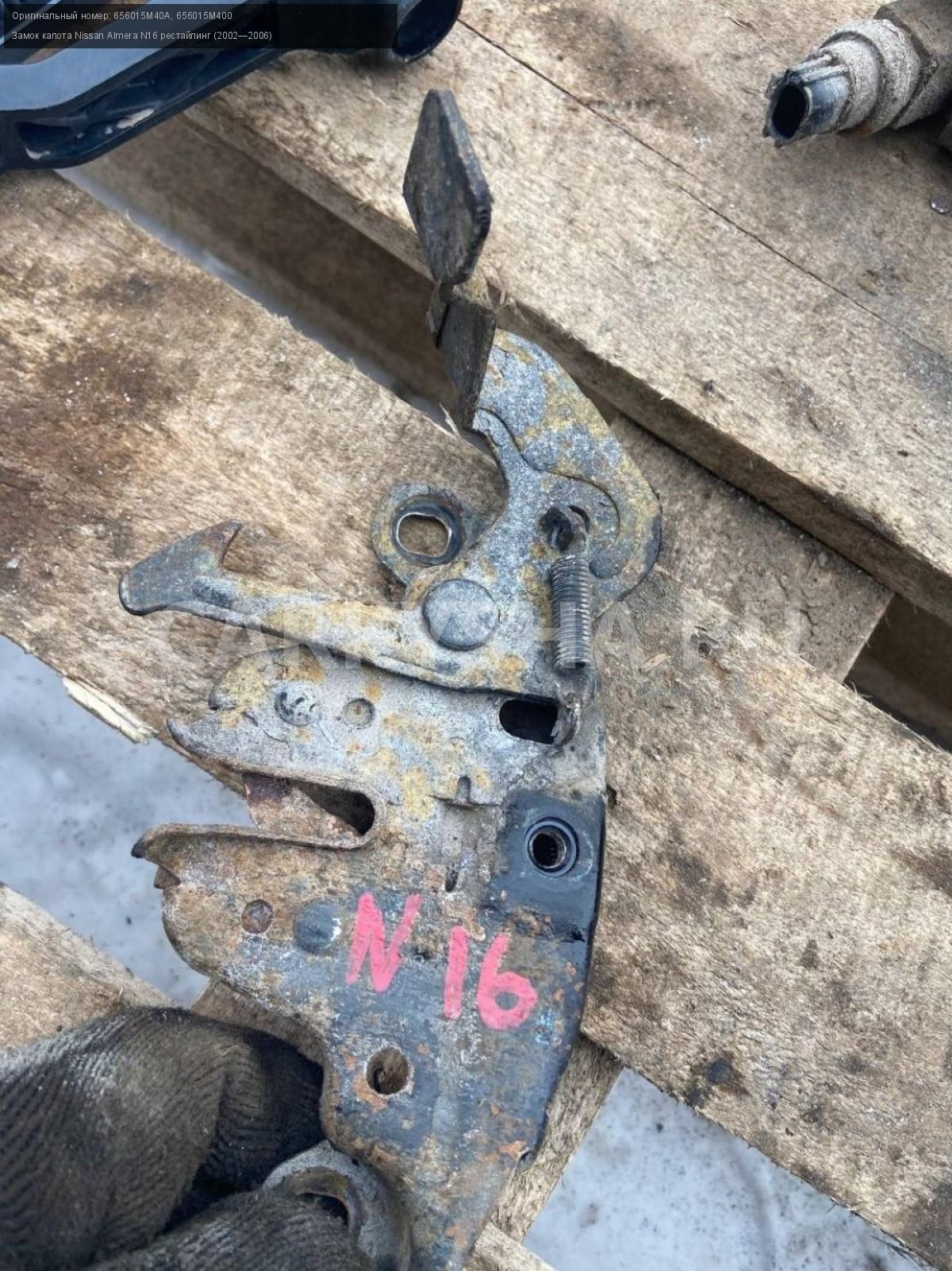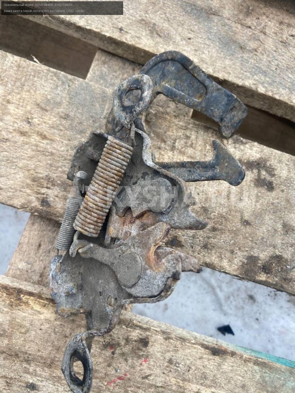 Nissan Almera N16, замок капота\nАртикул: 7090\n\nОриг. номер: 656015M40A\nНомера замен: 656015M400\nПроизводитель: NISSAN\nПримечание:Ниссан Альмера N16, замок капота, б/у. \n\nМарка: Nissan\nМодель: Almera N16 рестайлинг (2002—2006)\nГод выпуска: 2004\nКузов тип: Хетчбэк\nДвигатель номер: QG18DE\nМодель двигателя: инжектор\nОбъем: 1.8\nТопливо: Бензин\nКоробка: Механика\nЦвет: Черный\nСовместимости: Nissan Almera N16 рестайлинг (2002—2006) 1.8 MT (116 л.с.)\nСовместимость: