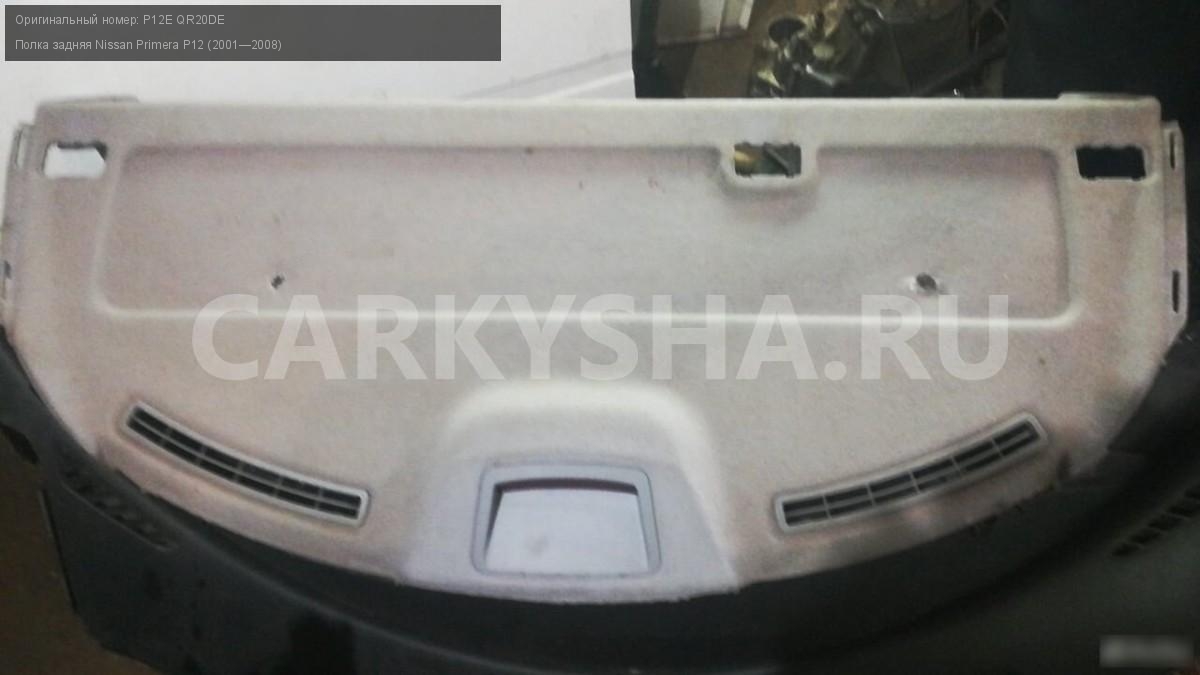 Nissan primera p12 задняя полка\nАртикул: 2081\n\nОриг. номер: P12E QR20DE\nПроизводитель: NISSAN\nПримечание:Nissan primera p12 задняя полка.НАЛИЧИЕ ЗАПЧАСТИ УТОЧНИТЕ ПО ТЕЛЕФОНУ ИЛИ В СООБЩЕНИЯХ,б/у, а так же множество авто в разборе, работаем с регионами отправка тк, выкуп авто после дтп по всей России, отправка тк осуществляется после 100% оплаты, наложенным платежом не работаем, стоимость доставки не рассчитываем\n\nМарка: Nissan\nМодель: Primera P12 (2001—2008)\nКузов тип: Универсал\nОбъем: 1.6\nТопливо: Бензин\nКоробка: Механика\nСовместимости: Nissan Primera P12 (2001—2008) 1.6 MT (109 л.с.)\nСовместимость: