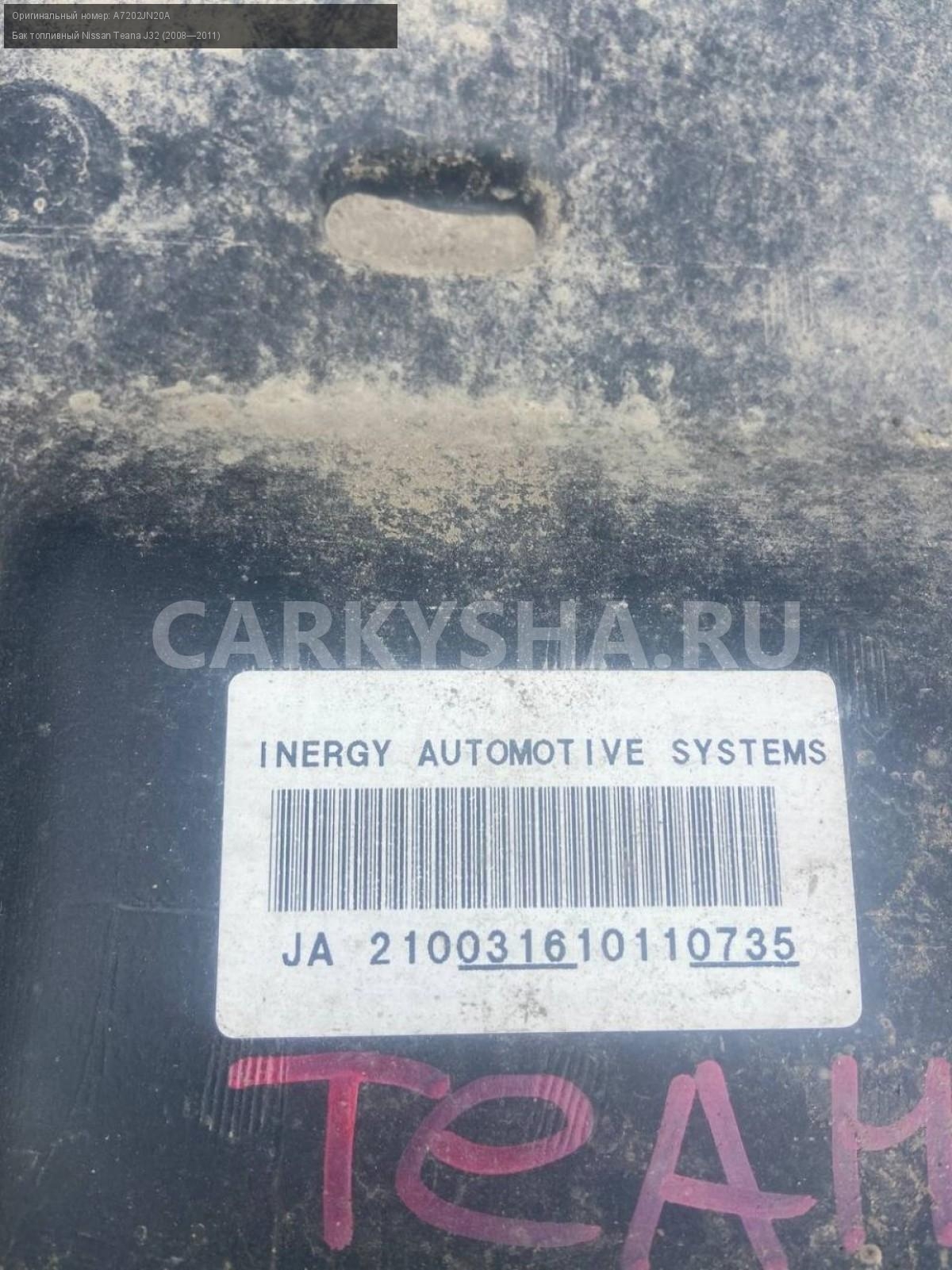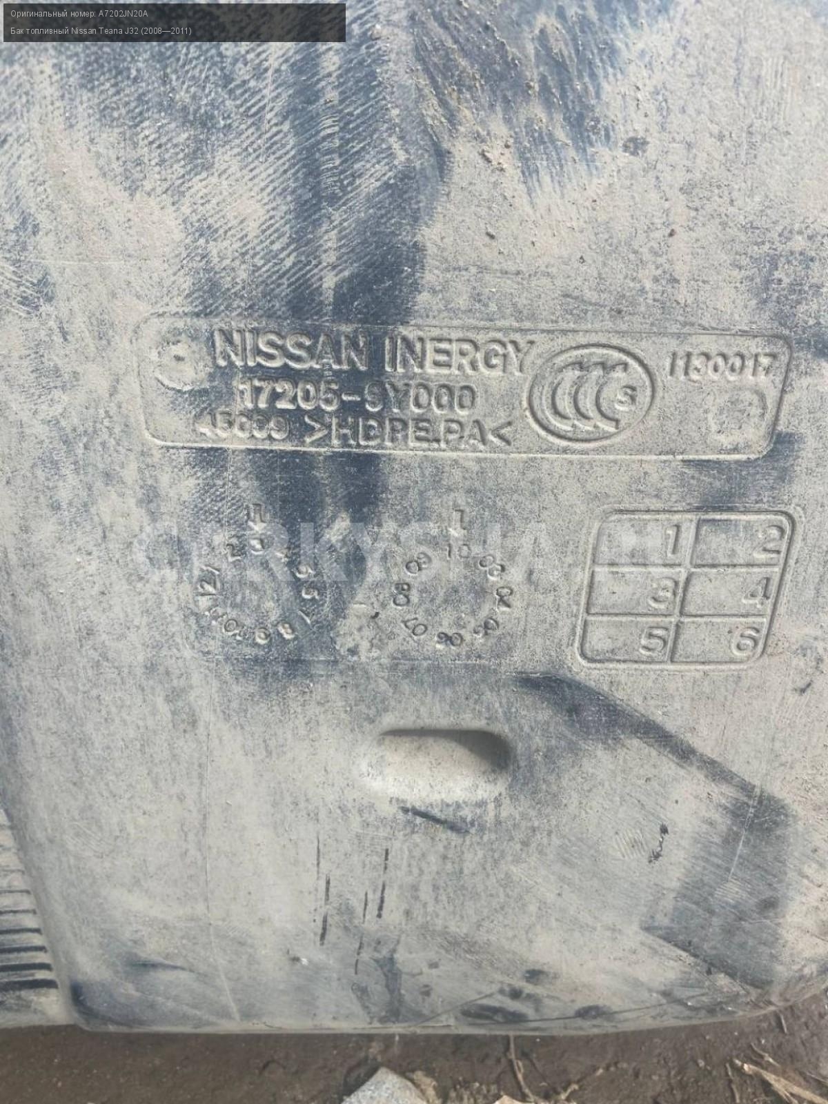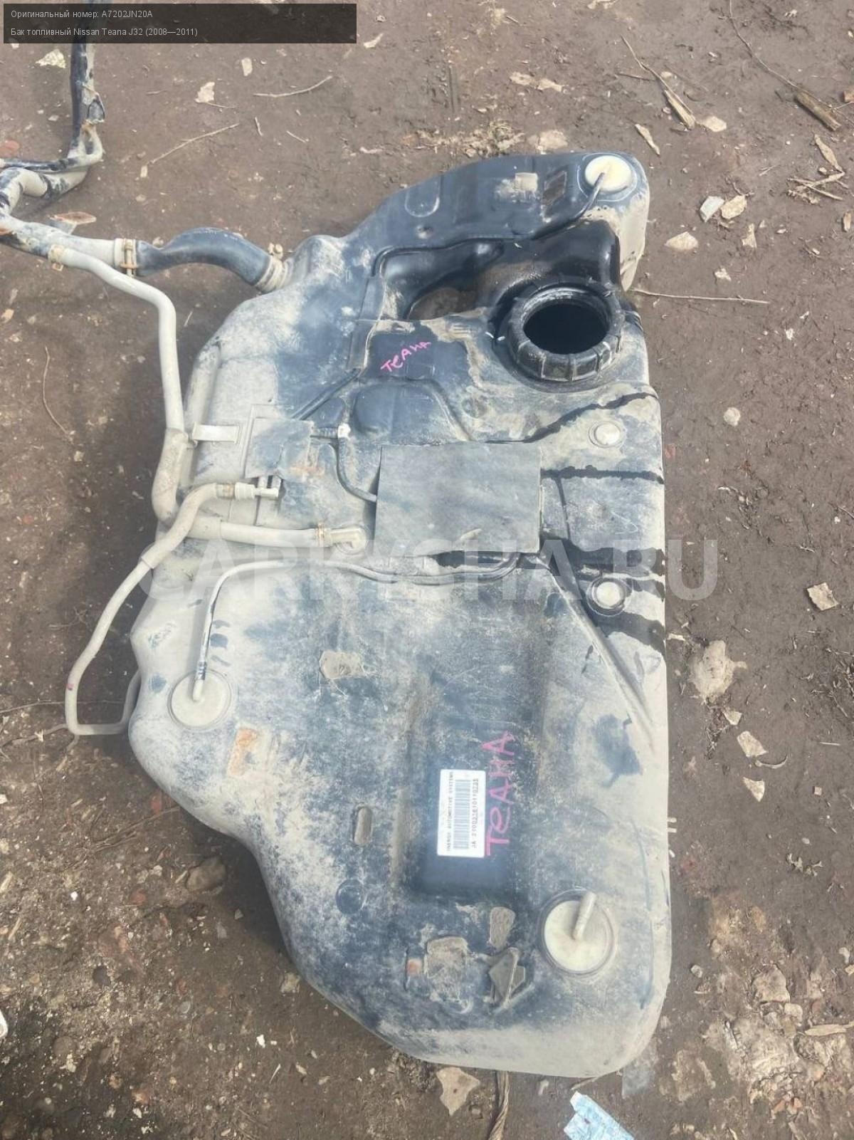 Nissan Teana J32 3.5, бак топливный, бензобак.\nАртикул: 7656\n\nОриг. номер: A7202JN20A\nПроизводитель: NISSAN\nПримечание:Ниссан Теана J32, 3.5 бензобак, бак топливный, бу. \n\nМарка: Nissan\nМодель: Teana J32 (2008—2011)\nГод выпуска: 2010\nКузов тип: Седан\nДвигатель номер: VQ35DE\nМодель двигателя: инжектор\nОбъем: 3.5\nТопливо: Бензин\nКоробка: Вариатор\nЦвет: B20-BLUEISH BLACK\nСовместимости: Nissan Teana J32 (2008—2011) 3.5 CVT (249 л.с.)\nСовместимость: