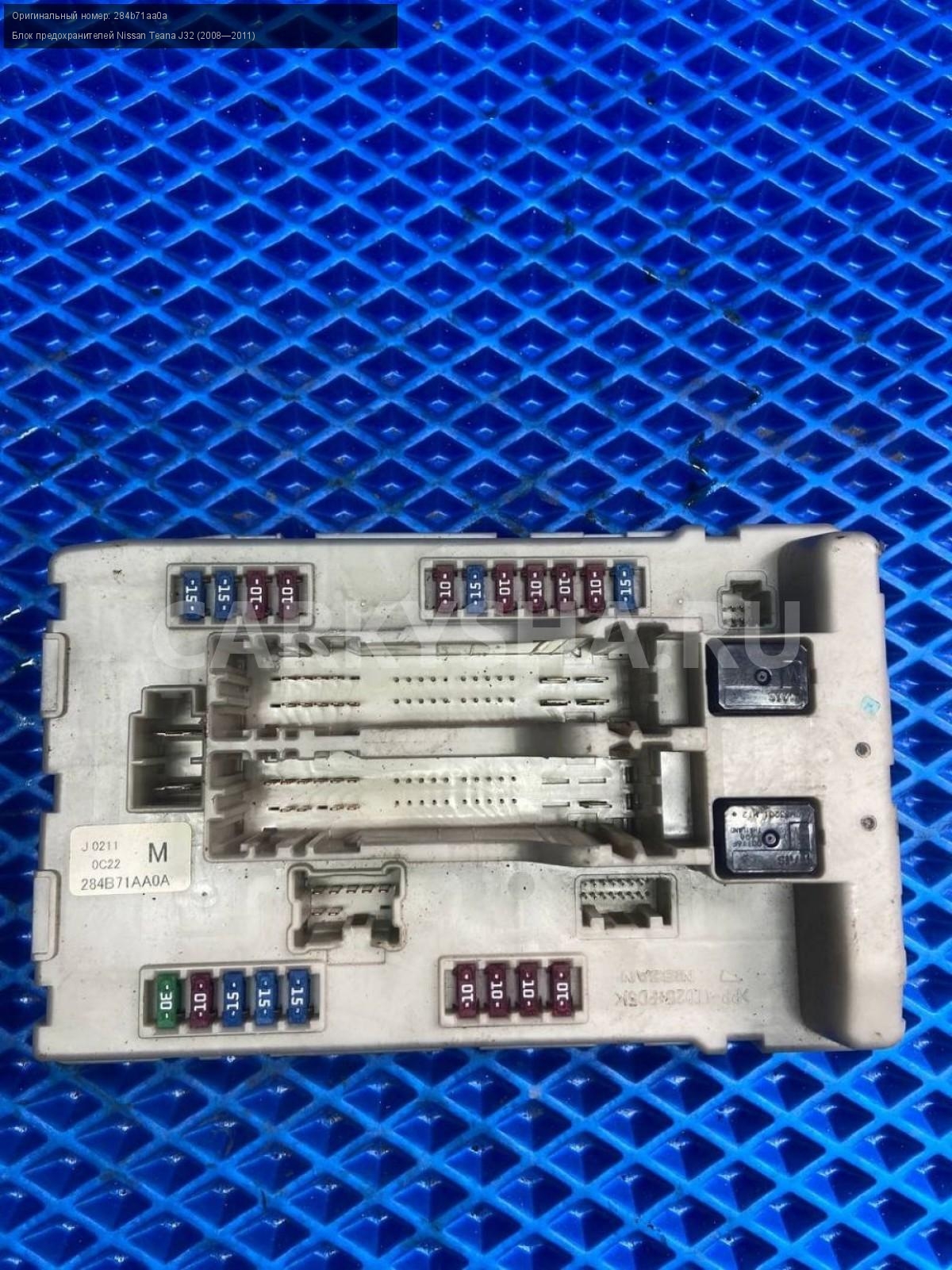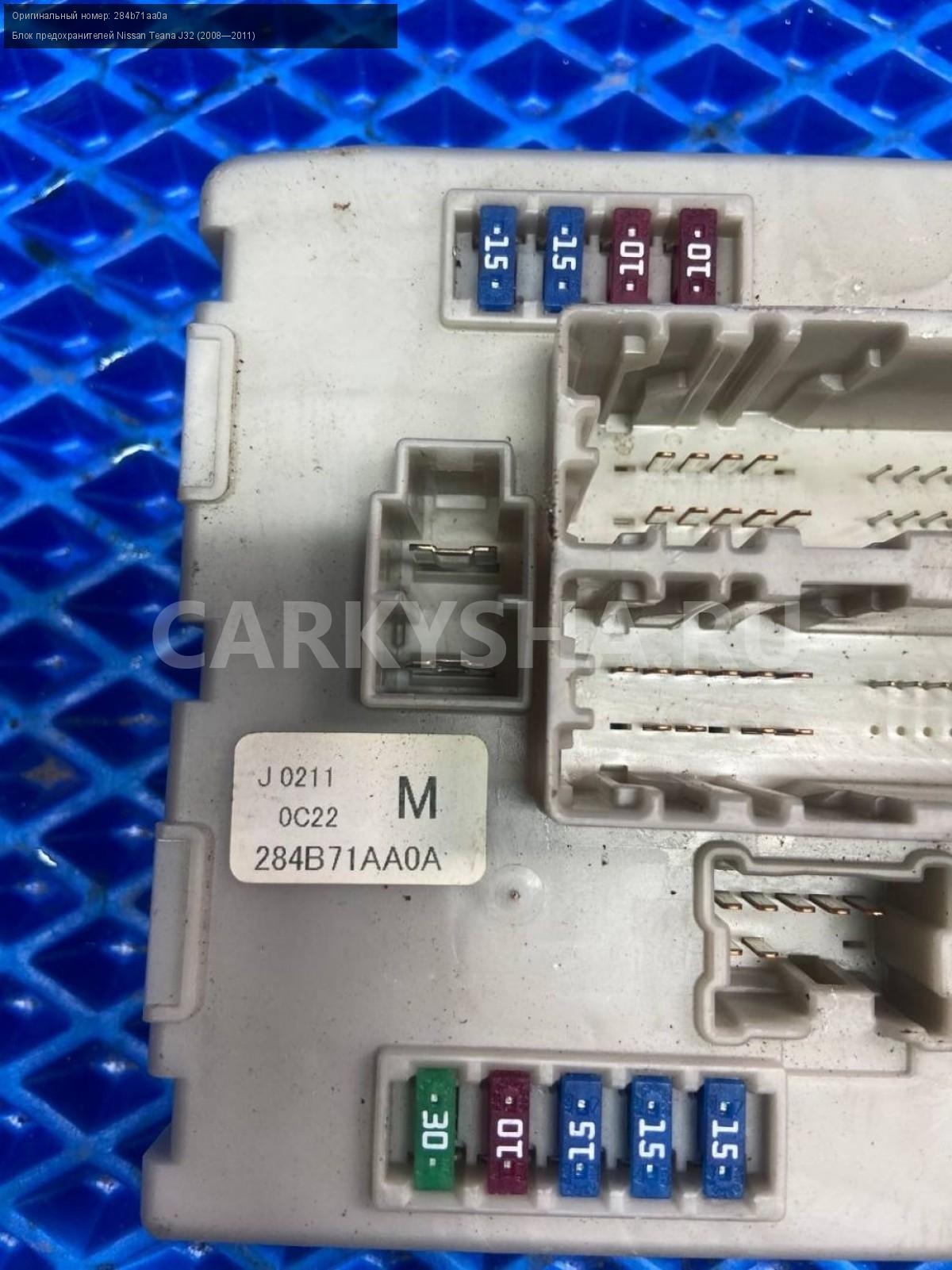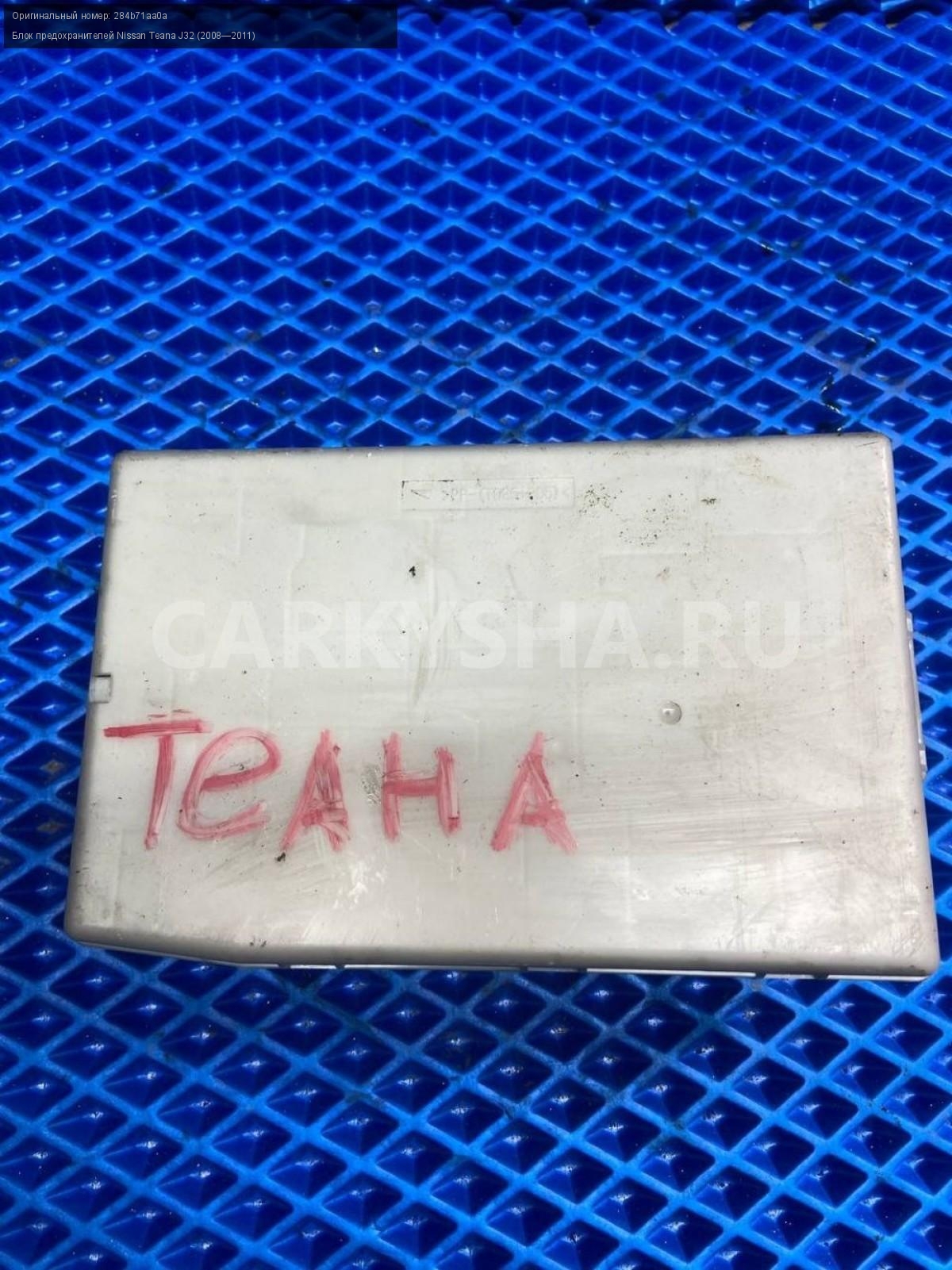 Nissan Teana J32, Блок предохранителей.\nАртикул: 7389\n\nОриг. номер: 284b71aa0a\nПроизводитель: NISSAN\nПримечание:Ниссан Теана H32, блок предохранителей, б/у. \n\nМарка: Nissan\nМодель: Teana J32 (2008—2011)\nГод выпуска: 2010\nКузов тип: Седан\nДвигатель номер: VQ35DE\nМодель двигателя: инжектор\nОбъем: 3.5\nТопливо: Бензин\nКоробка: Вариатор\nЦвет: B20-BLUEISH BLACK\nСовместимости: Nissan Teana J32 (2008—2011) 3.5 CVT (249 л.с.)\nСовместимость: