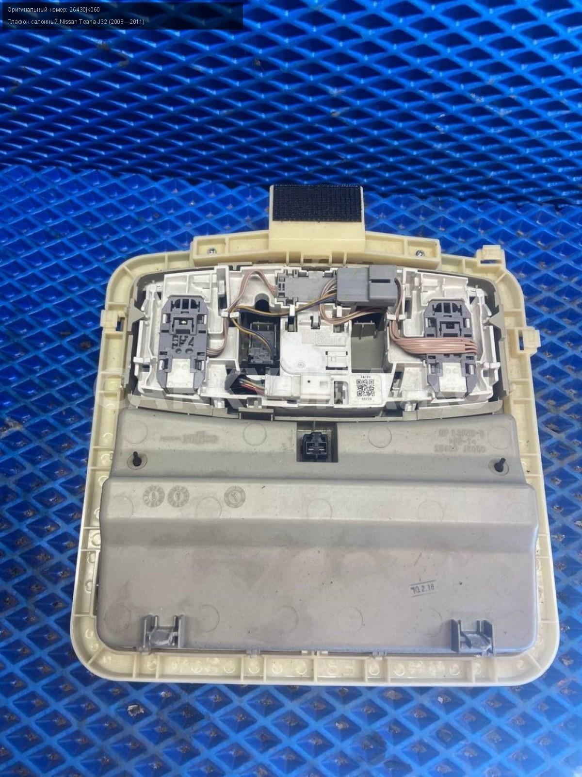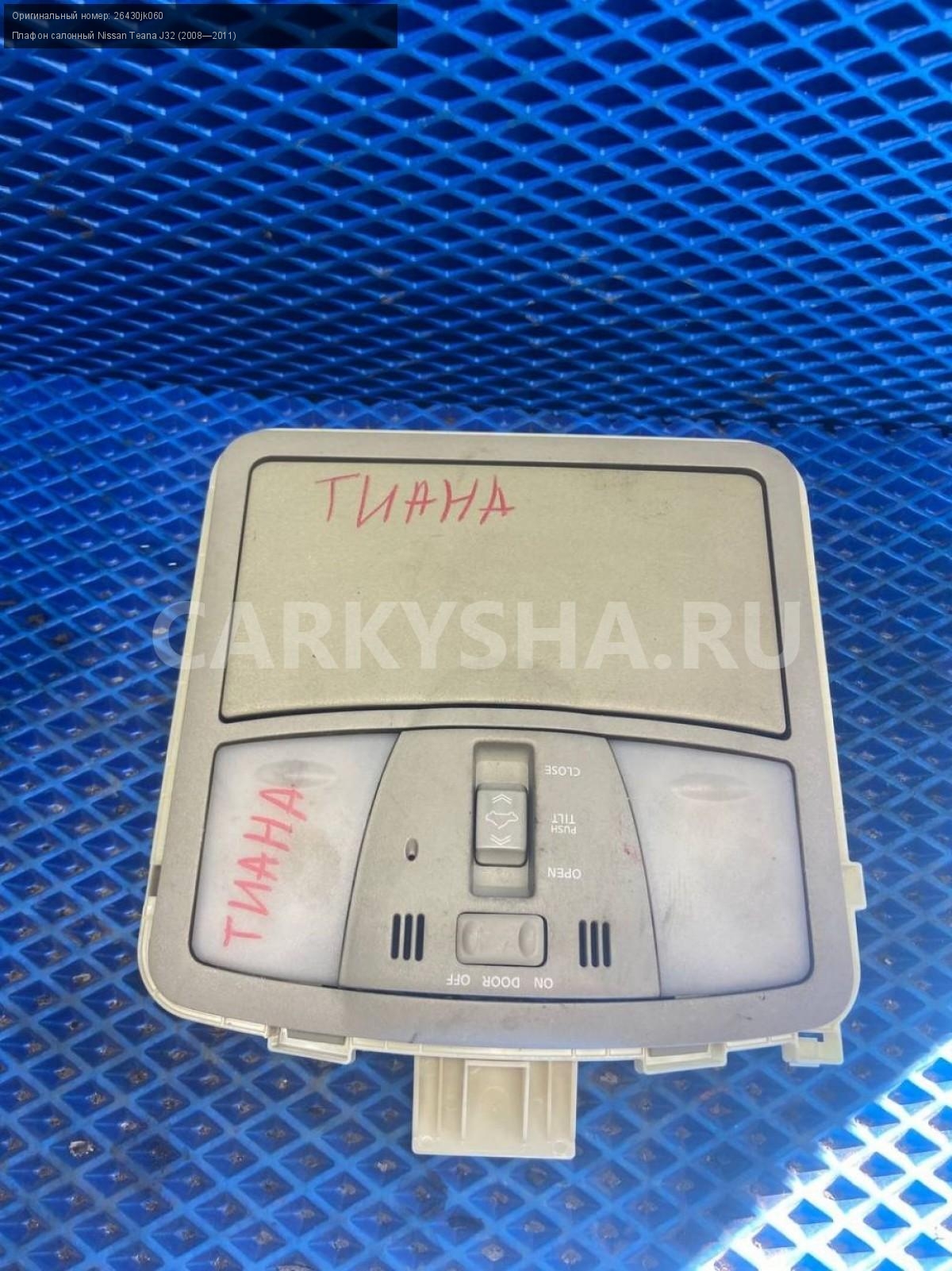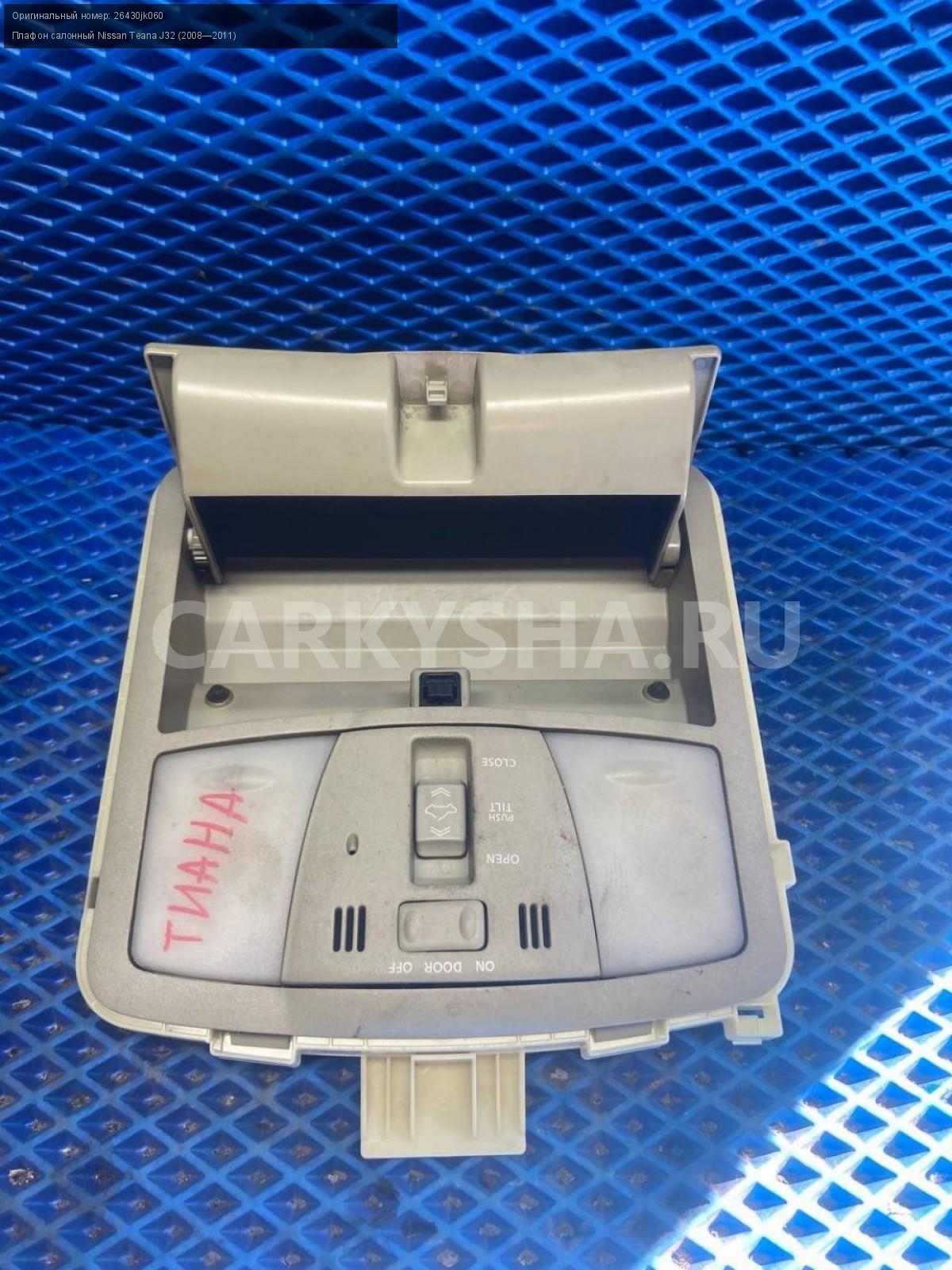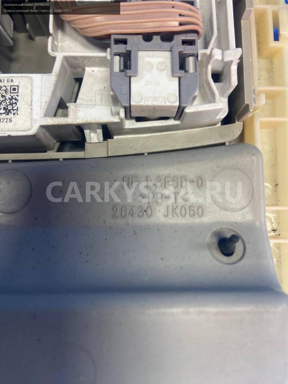 Nissan Teana J32, плафон освещения салона.\nАртикул: 8144\n\nОриг. номер: 26430jk060\nПроизводитель: NISSAN\nПримечание:Ниссан Теана J32, плафон освещения салона, плафон салонный, б/у. \n\nМарка: Nissan\nМодель: Teana J32 (2008—2011)\nГод выпуска: 2010\nКузов тип: Седан\nДвигатель номер: VQ35DE\nМодель двигателя: инжектор\nОбъем: 3.5\nТопливо: Бензин\nКоробка: Вариатор\nЦвет: B20-BLUEISH BLACK\nСовместимости: Nissan Teana J32 (2008—2011) 3.5 CVT (249 л.с.)\nСовместимость: