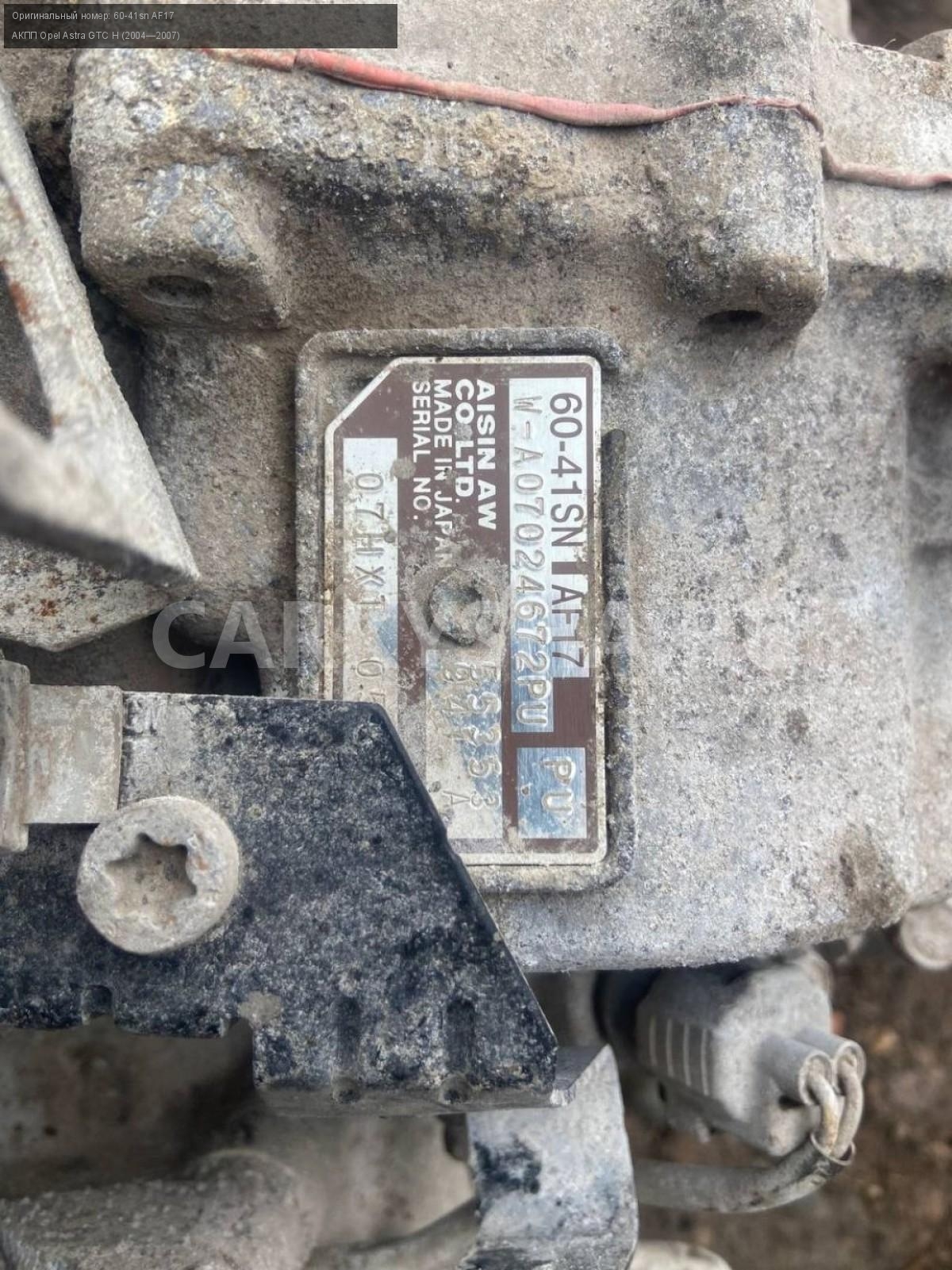 Opel Astra H, 1.8 АКПП AF17.\nАртикул: 8034\n\nОриг. номер: 60-41sn AF17\nПроизводитель: OPEL\nПримечание:Опель Астра Н 1.8 акпп , автоматическая коробка передач AF17 , б/у. \n\nМарка: Opel\nМодель: Astra GTC H (2004—2007)\nГод выпуска: 2007\nКузов тип: Купе\nДвигатель номер: Z18XER\nМодель двигателя: инжектор\nОбъем: 1.8\nТопливо: Бензин\nКоробка: Автомат\nЦвет: Серый\nСовместимости: Opel Astra GTC H (2004—2007) 1.8 AT (140 л.с.)\nСовместимость: