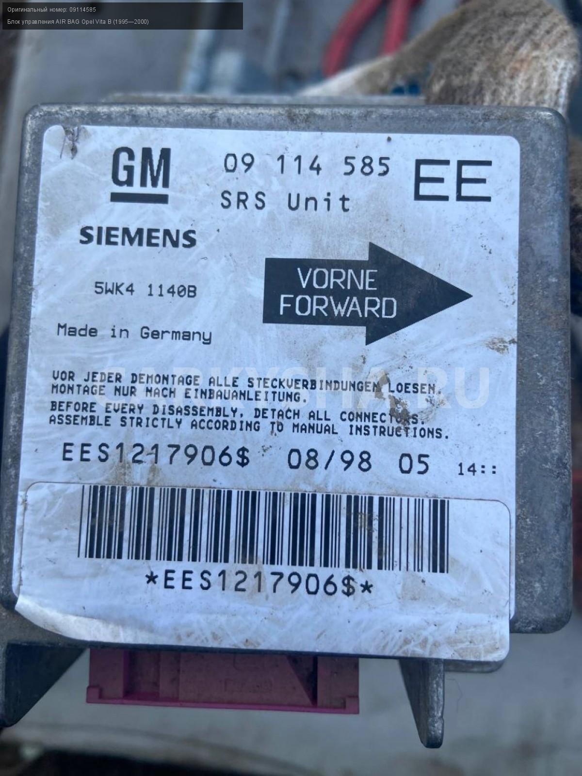 Opel Vita B, Блок AIR BAG.\nАртикул: 5463\n\nОриг. номер: 09114585\nПроизводитель: GENERAL MOTORS\nПримечание:Опель Вита В, блок air bag, б/у. \n\nМарка: Opel\nМодель: Vita B (1995—2000)\nГод выпуска: 1998\nКузов тип: Хетчбэк\nДвигатель номер: X14XE\nМодель двигателя: инжектор\nОбъем: 1.4\nТопливо: Бензин\nКоробка: Автомат\nЦвет: Красный\nСовместимости: Opel Vita B (1995—2000) 1.4 AT (90 л.с.)\nСовместимость: