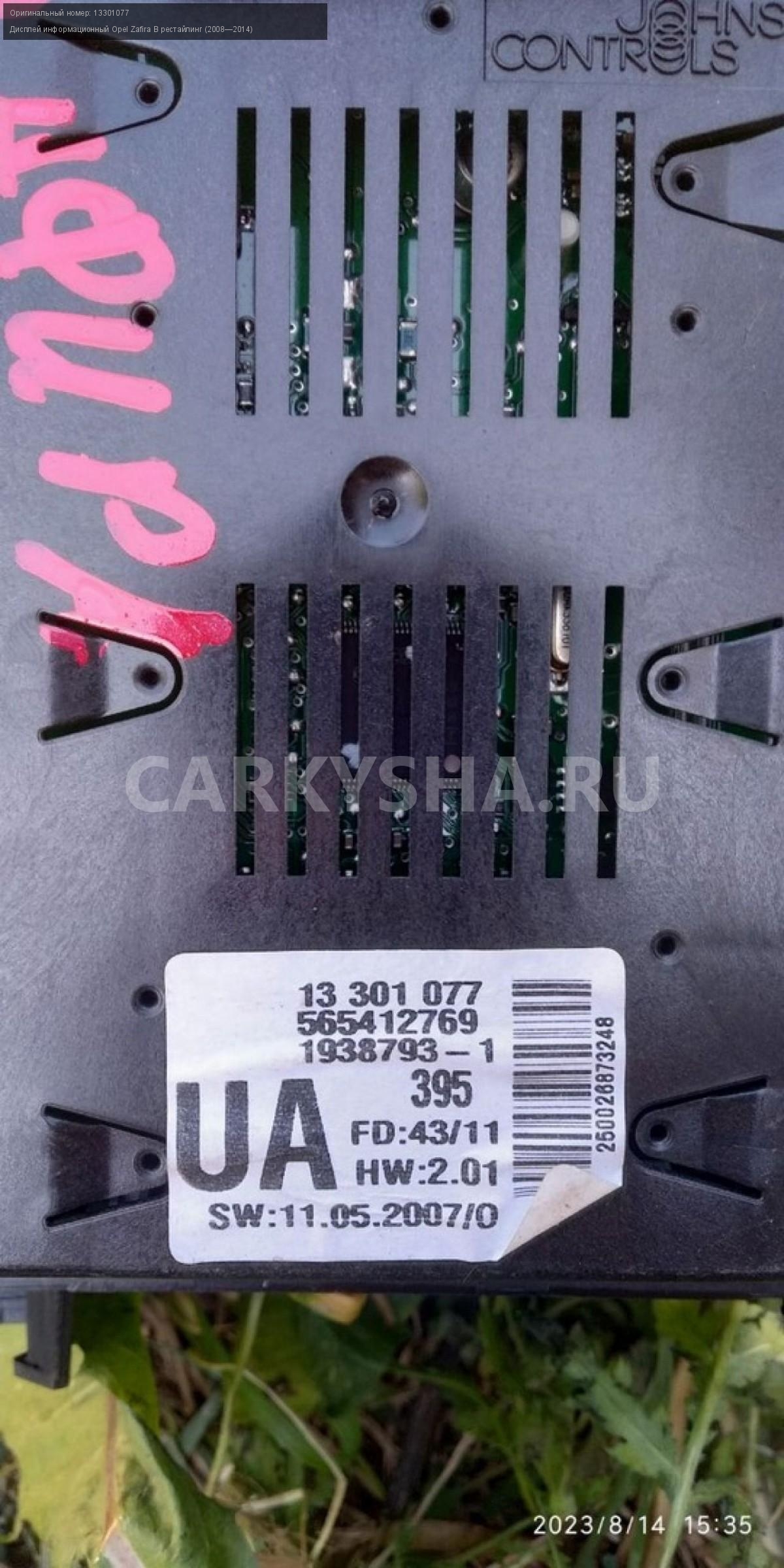 Opel Zafira B рестайлинг, дисплей информационный\nАртикул: 2878\n\nОриг. номер: 13301077\nПроизводитель: JOHNSONCONTROLS\nПримечание:Опель Зафира Б рестайлинг, дисплей информационный, б/у\n\nМарка: Opel\nМодель: Zafira B рестайлинг (2008—2014)\nГод выпуска: 2012\nКузов тип: Минивэн\nДвигатель номер: Z18XER\nМодель двигателя: инжектор\nОбъем: 1.8\nТопливо: Бензин\nКоробка: Механика\nЦвет: Белый\nСовместимости: Opel Zafira B рестайлинг (2008—2014) 1.8 MT (140 л.с.)\nСовместимость: