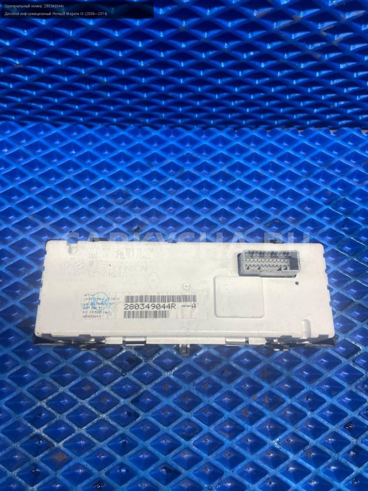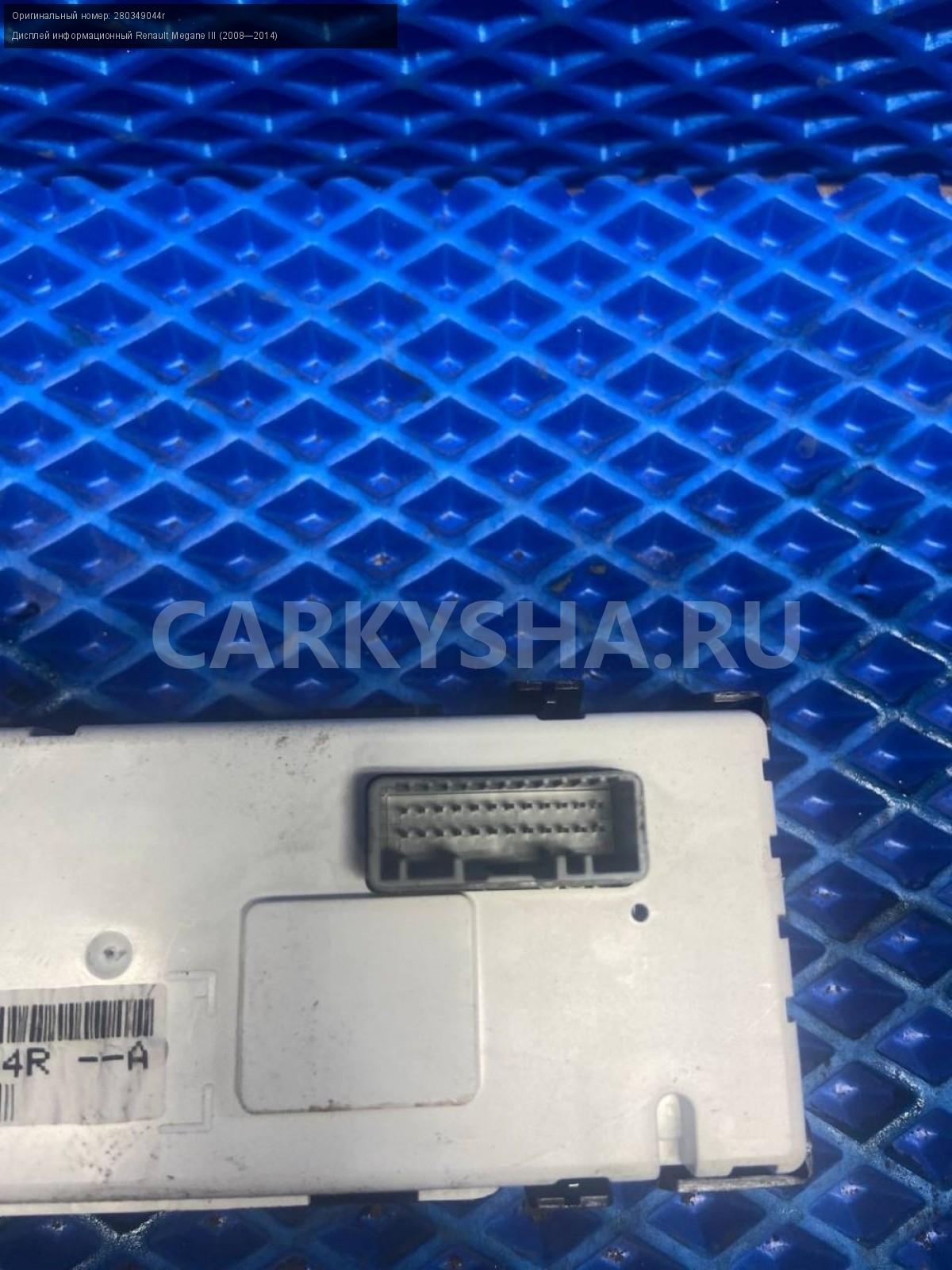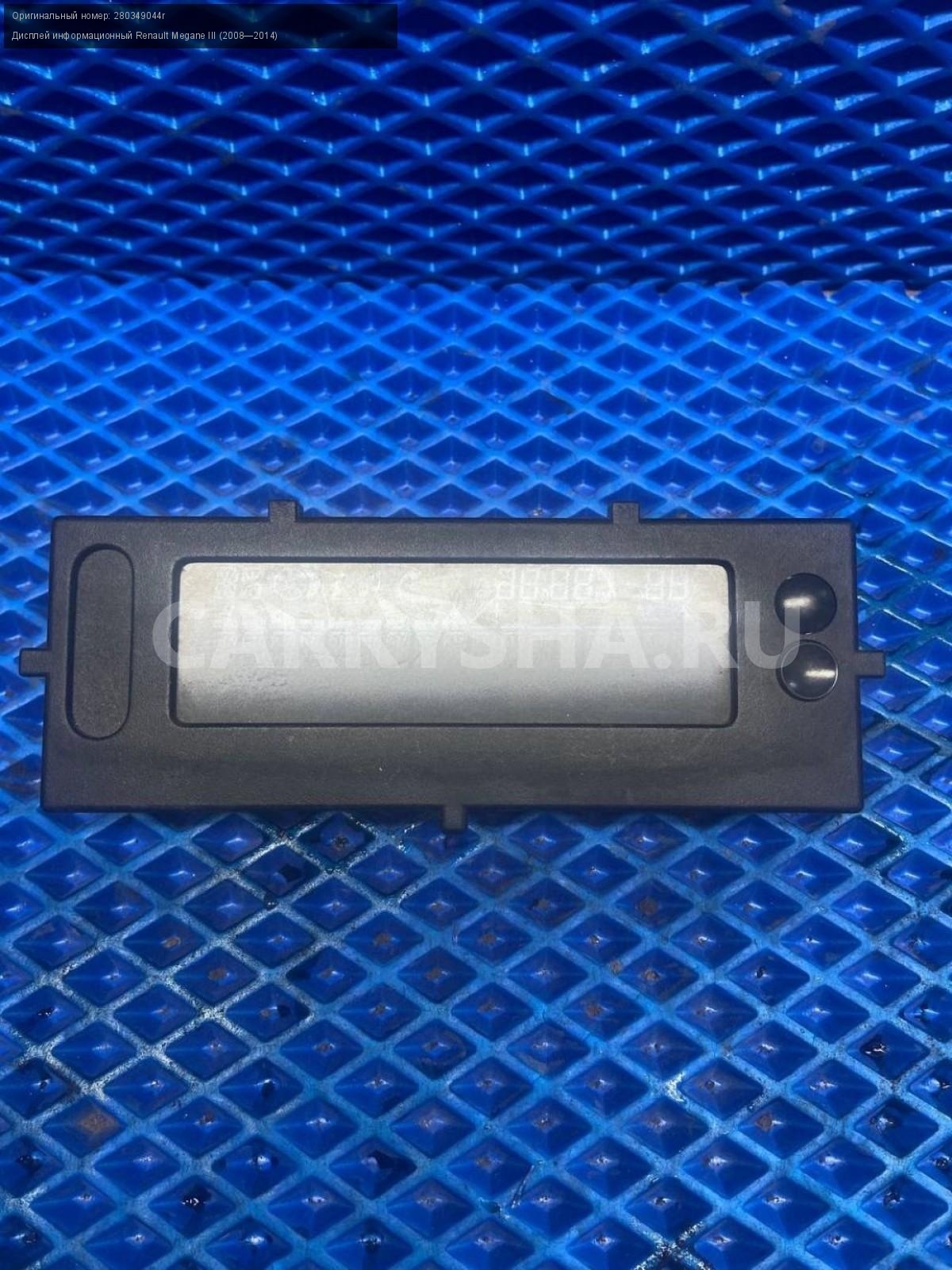 Renault Megane III, дисплей информационный.\nАртикул: 7557\n\nОриг. номер: 280349044r\nПроизводитель: RENAULT\nПримечание:Рено Меган 3, дисплей информационный, б/у. \n\nМарка: Renault\nМодель: Megane III (2008—2014)\nГод выпуска: 2011\nКузов тип: Хетчбэк\nДвигатель номер: K4MV838\nМодель двигателя: инжектор\nОбъем: 1.6\nТопливо: Бензин\nКоробка: Механика\nЦвет: Темно-Серый\nСовместимости: Renault Megane III (2008—2014) 1.6 MT (106 л.с.)\nСовместимость: