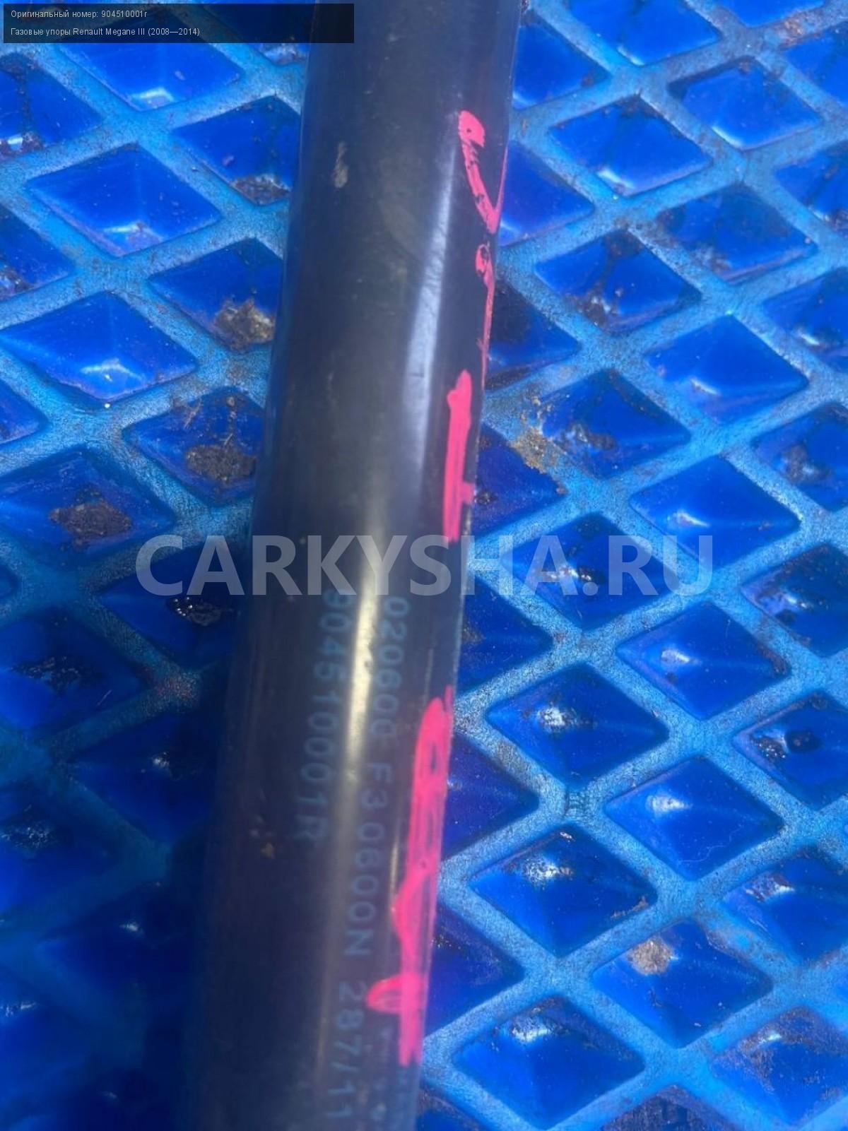 Renault Megane III, газовые упоры крышки багажника\nАртикул: 7674\n\nОриг. номер: 904510001r\nПроизводитель: RENAULT\nПримечание:Рено Меган 3, хэтчбек, газовые упоры крышки багажника, цена за пару, б/у. \n\nМарка: Renault\nМодель: Megane III (2008—2014)\nГод выпуска: 2011\nКузов тип: Хетчбэк\nДвигатель номер: K4MV838\nМодель двигателя: инжектор\nОбъем: 1.6\nТопливо: Бензин\nКоробка: Механика\nЦвет: Темно-Серый\nПраво/Лево: Право/Лево\nСовместимости: Renault Megane III (2008—2014) 1.6 MT (106 л.с.)\nСовместимость: