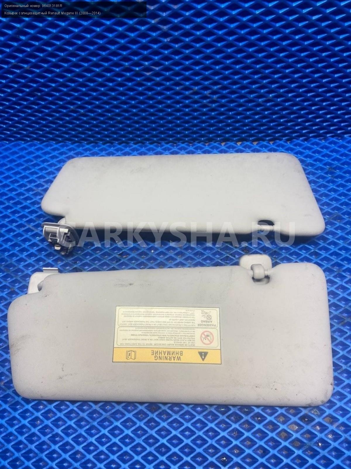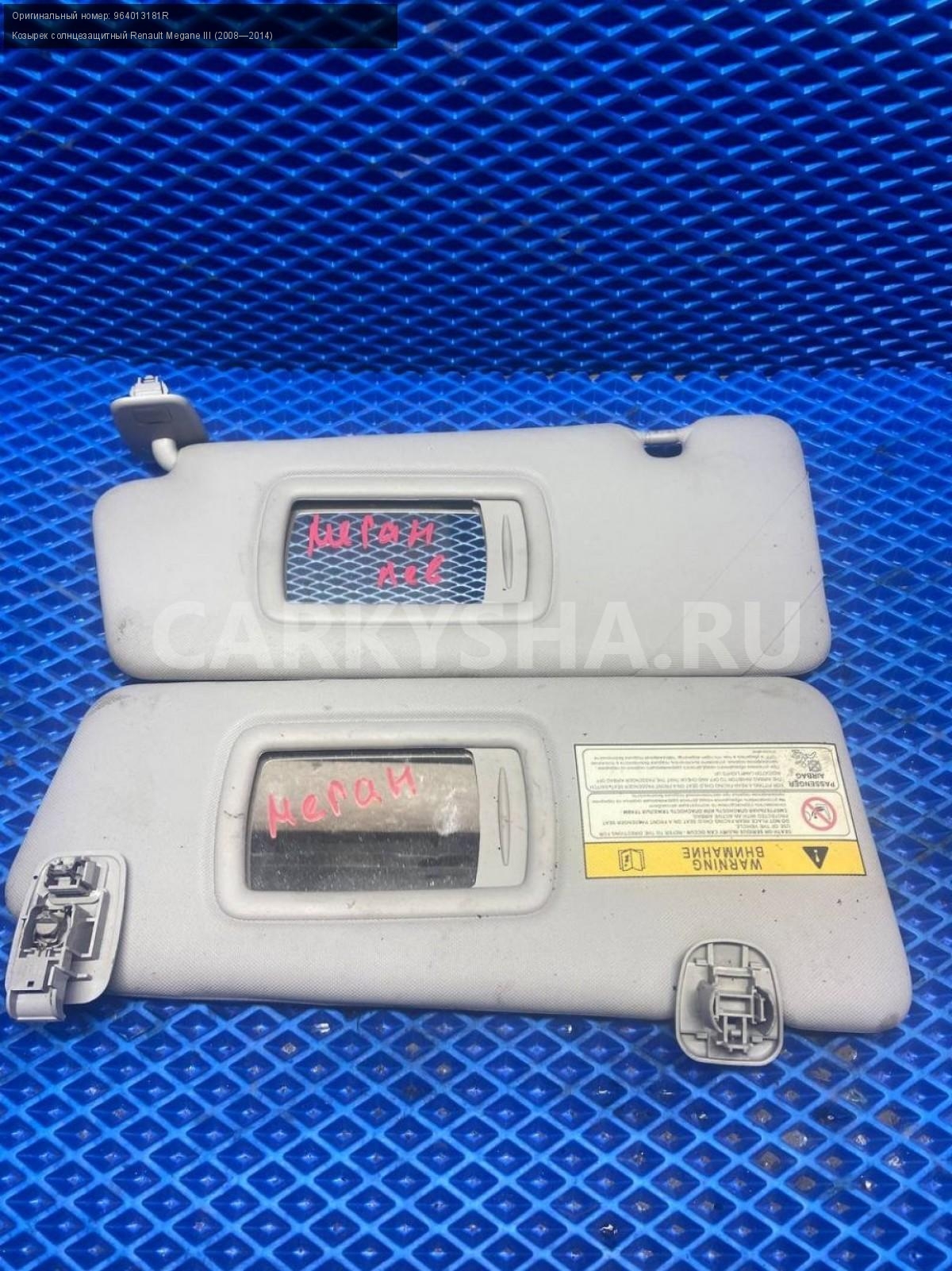 Renault Megane III Козырьки солнцезащитные, пара.\nАртикул: 7585\n\nОриг. номер: 964013181R\nПроизводитель: RENAULT\nПримечание:Рено Меган 3, козырьки солнцезащитные, цена за пару, б/у. \n\nМарка: Renault\nМодель: Megane III (2008—2014)\nГод выпуска: 2011\nКузов тип: Хетчбэк\nДвигатель номер: K4MV838\nМодель двигателя: инжектор\nОбъем: 1.6\nТопливо: Бензин\nКоробка: Механика\nЦвет: Темно-Серый\nПраво/Лево: Право/Лево\nПеред/Зад: Перед\nСовместимости: Renault Megane III (2008—2014) 1.6 MT (106 л.с.)\nСовместимость: