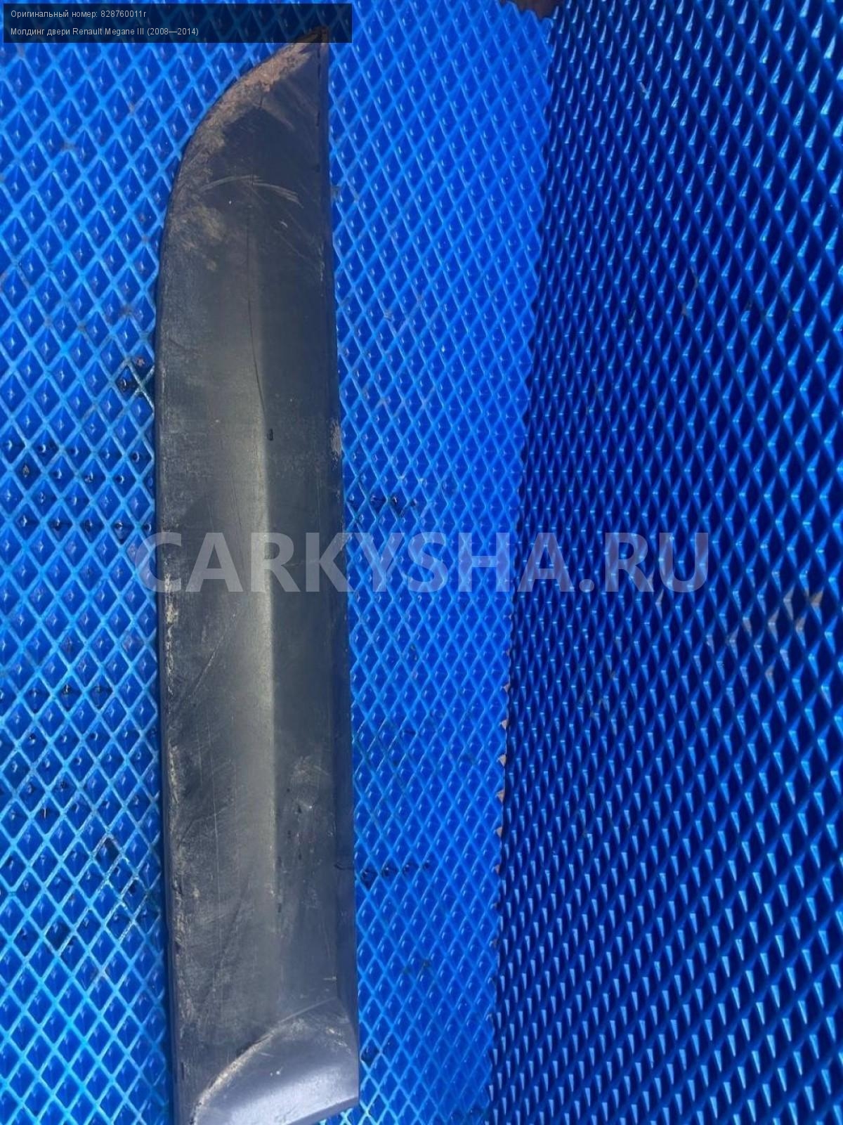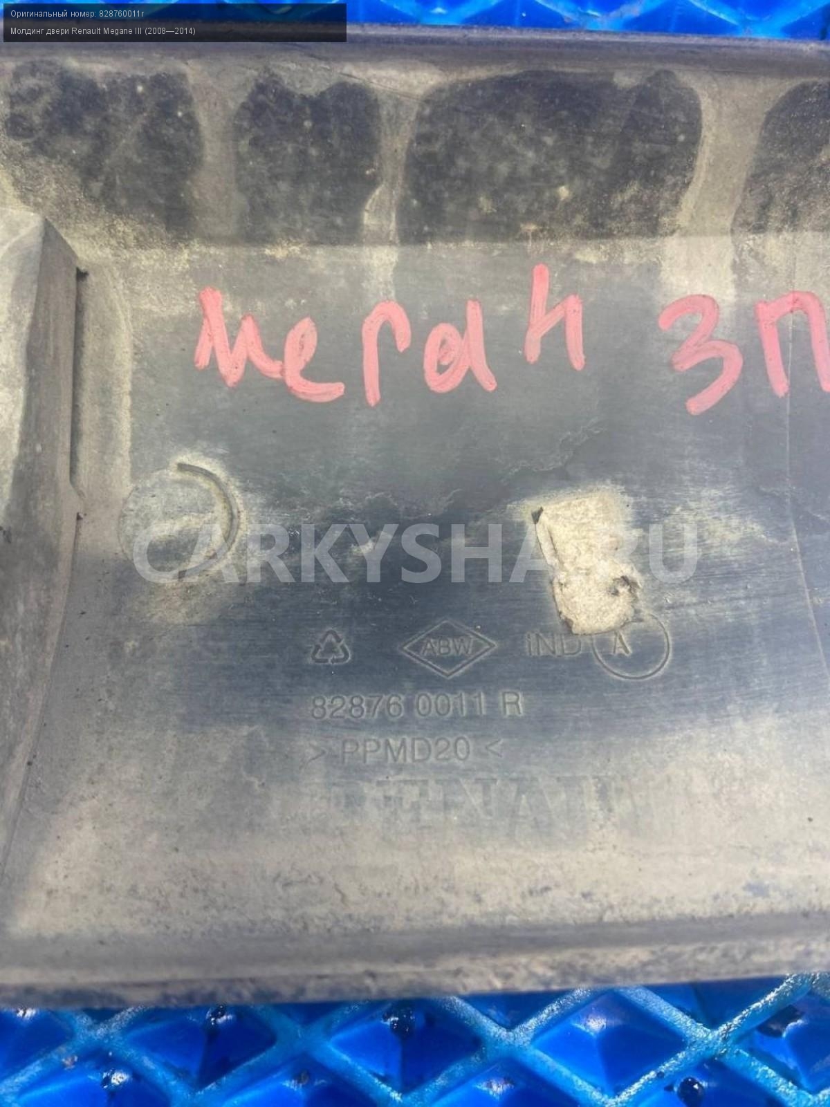 Renault Megane III хэтчбек молдинг двери задн.прав\nАртикул: 7532\n\nОриг. номер: 828760011r\nПроизводитель: RENAULT\nПримечание:Рено Меган 3 хэтчбек, молдинг задней правой двери, б/у. \n\nМарка: Renault\nМодель: Megane III (2008—2014)\nГод выпуска: 2011\nКузов тип: Хетчбэк\nДвигатель номер: K4MV838\nМодель двигателя: инжектор\nОбъем: 1.6\nТопливо: Бензин\nКоробка: Механика\nЦвет: Темно-Серый\nПраво/Лево: Право\nПеред/Зад: Зад\nСовместимости: Renault Megane III (2008—2014) 1.6 MT (106 л.с.)\nСовместимость: