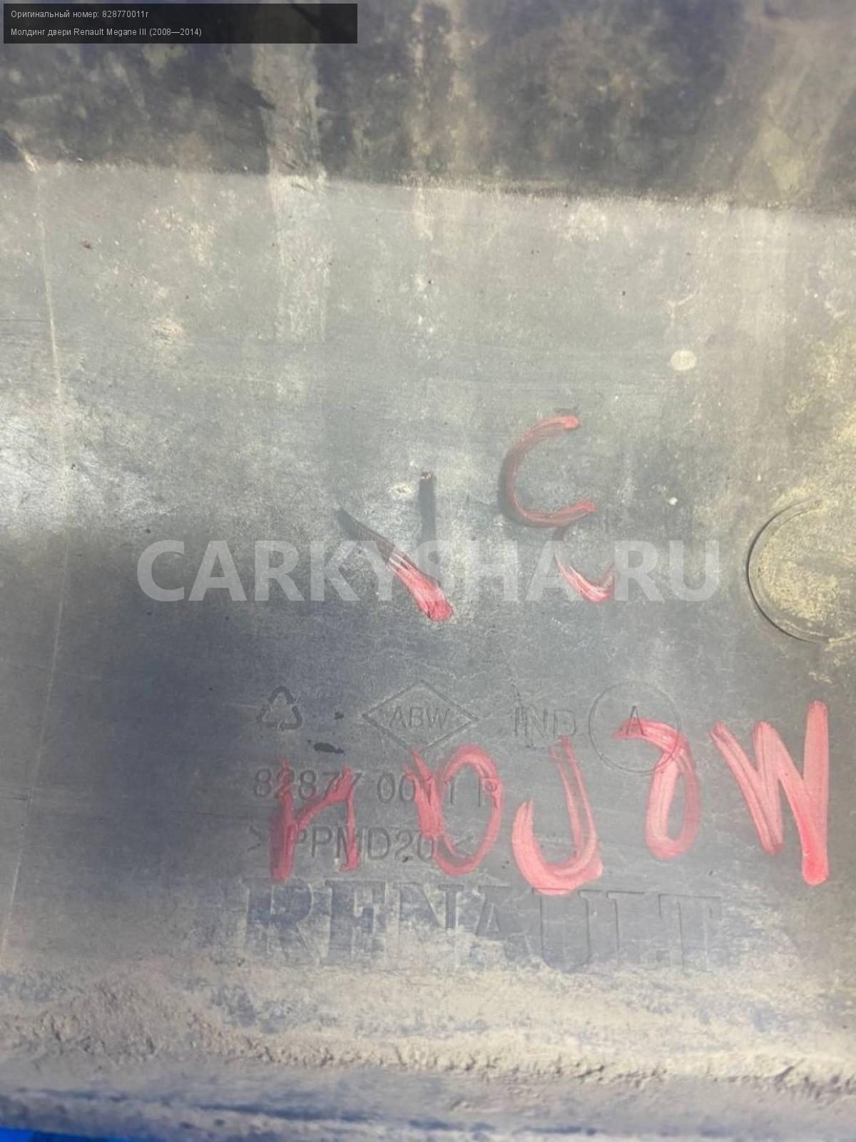 Renault Megane III хэтчбек, молдинг двери задн.лев\nАртикул: 7531\n\nОриг. номер: 828770011r\nПроизводитель: RENAULT\nПримечание:Рено Меган 3 хэтчбек, молдинг двери задней левой, б/у. \n\nМарка: Renault\nМодель: Megane III (2008—2014)\nГод выпуска: 2011\nКузов тип: Хетчбэк\nДвигатель номер: K4MV838\nМодель двигателя: инжектор\nОбъем: 1.6\nТопливо: Бензин\nКоробка: Механика\nЦвет: Темно-Серый\nПраво/Лево: Лево\nПеред/Зад: Зад\nСовместимости: Renault Megane III (2008—2014) 1.6 MT (106 л.с.)\nСовместимость: