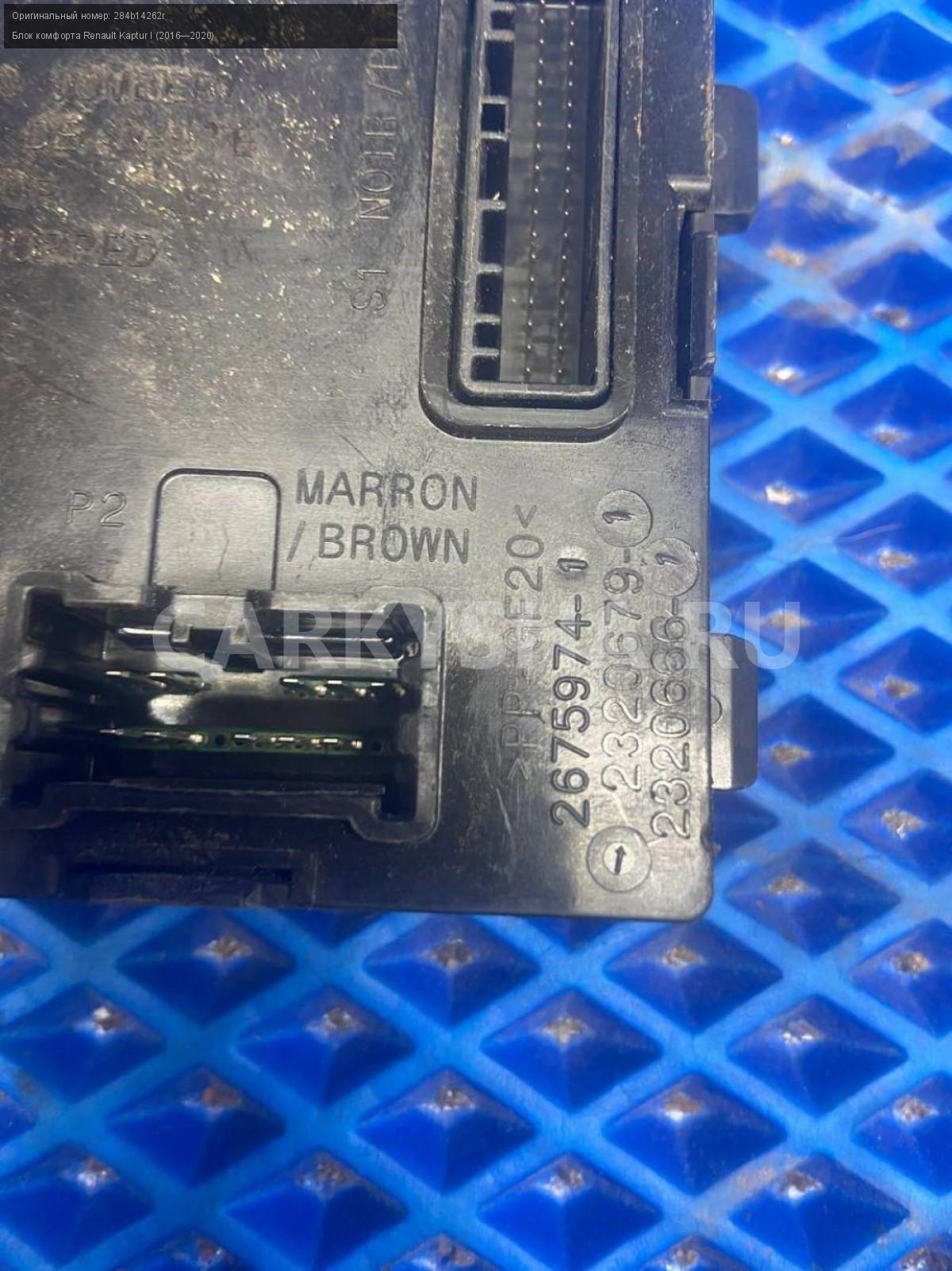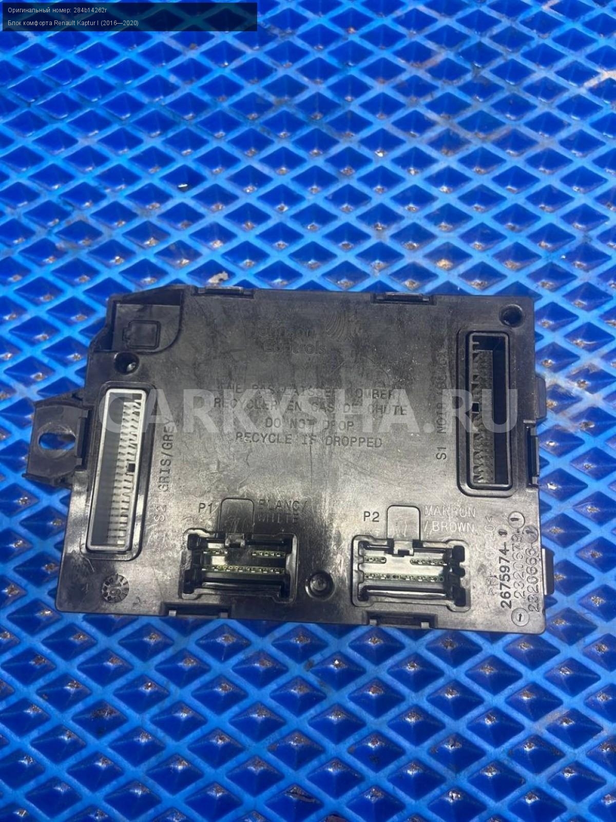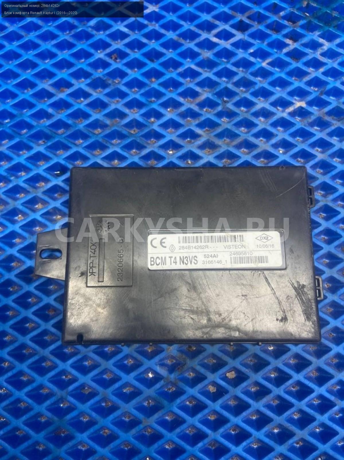 Renault Kaptur, Блок комфорта.\nАртикул: 7755\n\nОриг. номер: 284b14262r\nПроизводитель: RENAULT\nПримечание:Рено Каптюр, блок комфорта, б/у. \n\nМарка: Renault\nМодель: Kaptur I (2016—2020)\nГод выпуска: 2016\nКузов тип: Внедорожник\nДвигатель номер: H4M438\nМодель двигателя: инжектор\nОбъем: 1.6\nТопливо: Бензин\nКоробка: Механика\nЦвет: Белый\nСовместимости: Renault Kaptur I (2016—2020) 1.6 MT (114 л.с.)\nСовместимость: