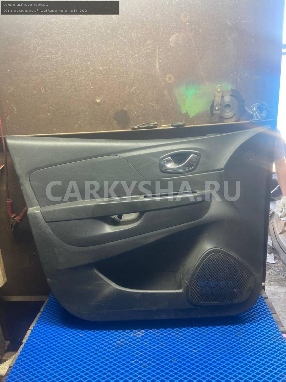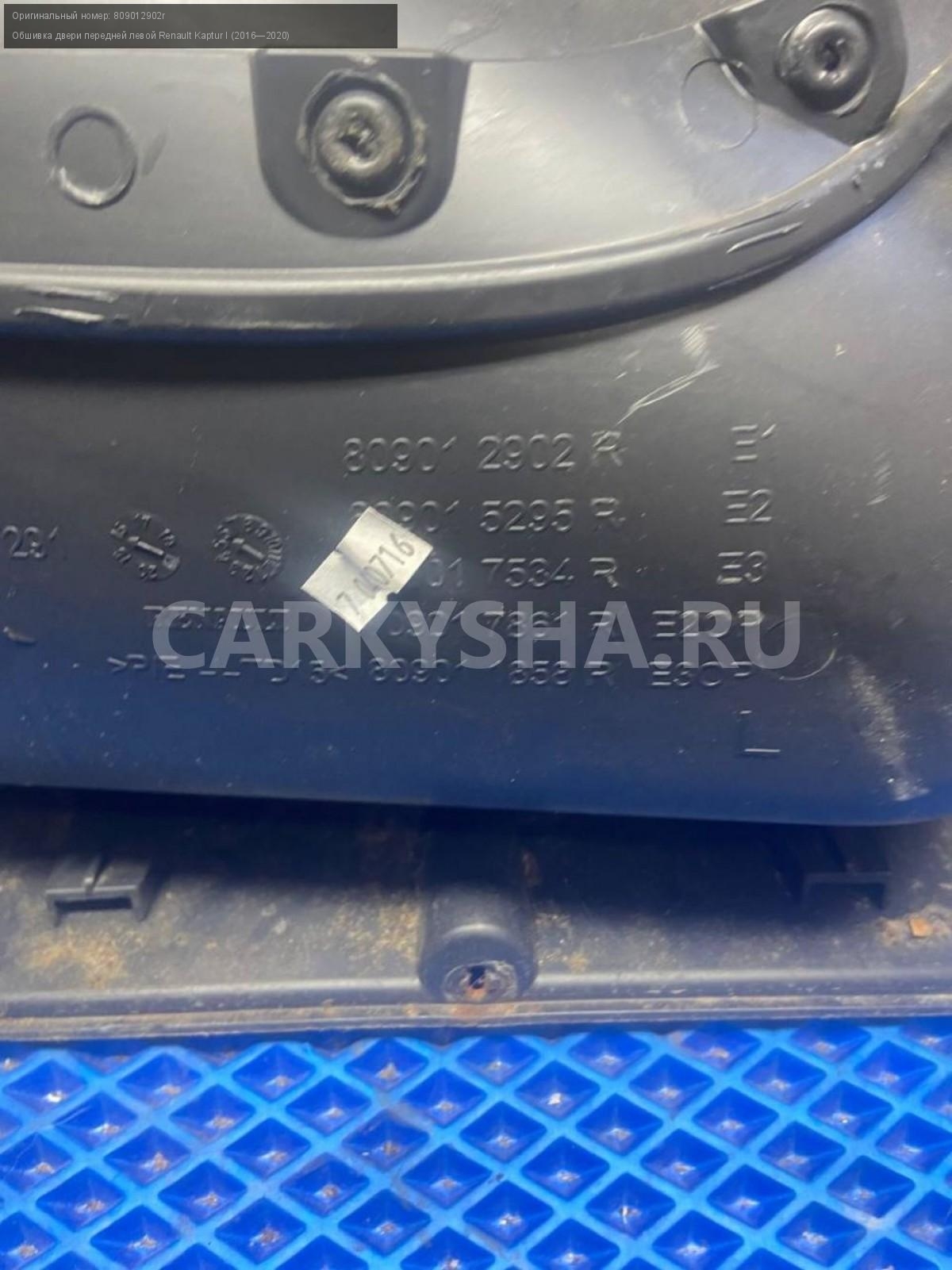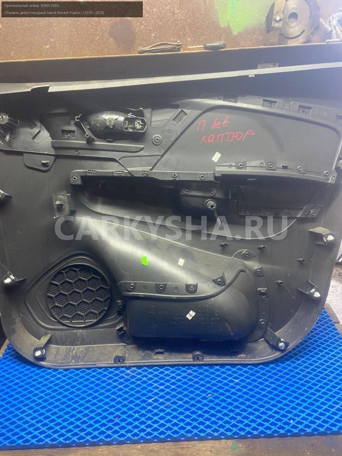 Renault Kaptur, обшивка двери передней левой.\nАртикул: 7753\n\nОриг. номер: 809012902r\nПроизводитель: RENAULT\nПримечание:Рено Каптюр, обшивка двери , карта двери передней левой, б/у. \n\nМарка: Renault\nМодель: Kaptur I (2016—2020)\nГод выпуска: 2016\nКузов тип: Внедорожник\nДвигатель номер: H4M438\nМодель двигателя: инжектор\nОбъем: 1.6\nТопливо: Бензин\nКоробка: Механика\nЦвет: Белый\nСовместимости: Renault Kaptur I (2016—2020) 1.6 MT (114 л.с.)\nСовместимость: