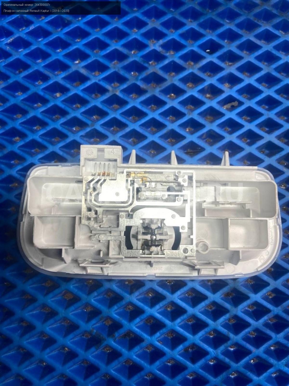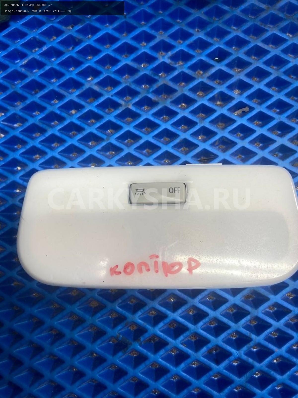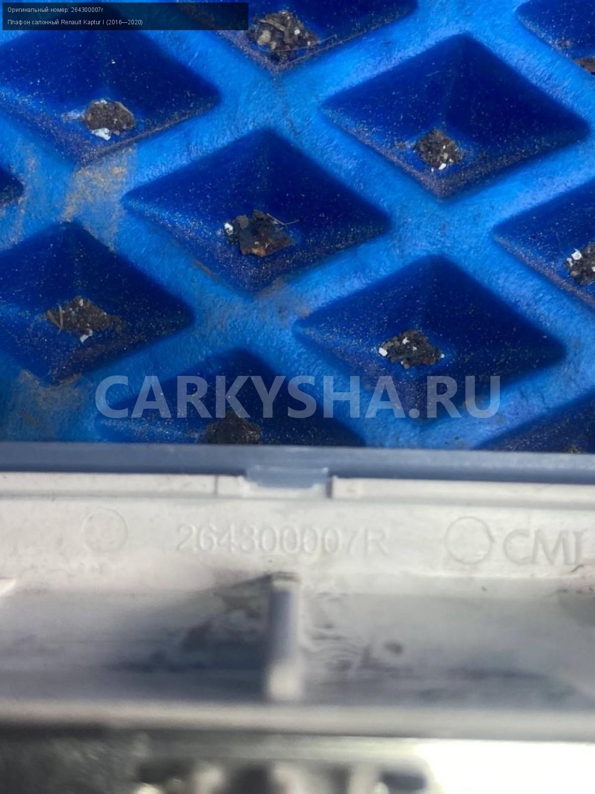 Renault Kaptur, плафон освещения салона задний.\nАртикул: 7946\n\nОриг. номер: 264300007r\nПроизводитель: RENAULT\nПримечание:Рено Каптюр, плафон освещения салона задний, б/у. \n\nМарка: Renault\nМодель: Kaptur I (2016—2020)\nГод выпуска: 2016\nКузов тип: Внедорожник\nДвигатель номер: H4M438\nМодель двигателя: инжектор\nОбъем: 1.6\nТопливо: Бензин\nКоробка: Механика\nЦвет: Белый\nПеред/Зад: Зад\nСовместимости: Renault Kaptur I (2016—2020) 1.6 MT (114 л.с.)\nСовместимость:
