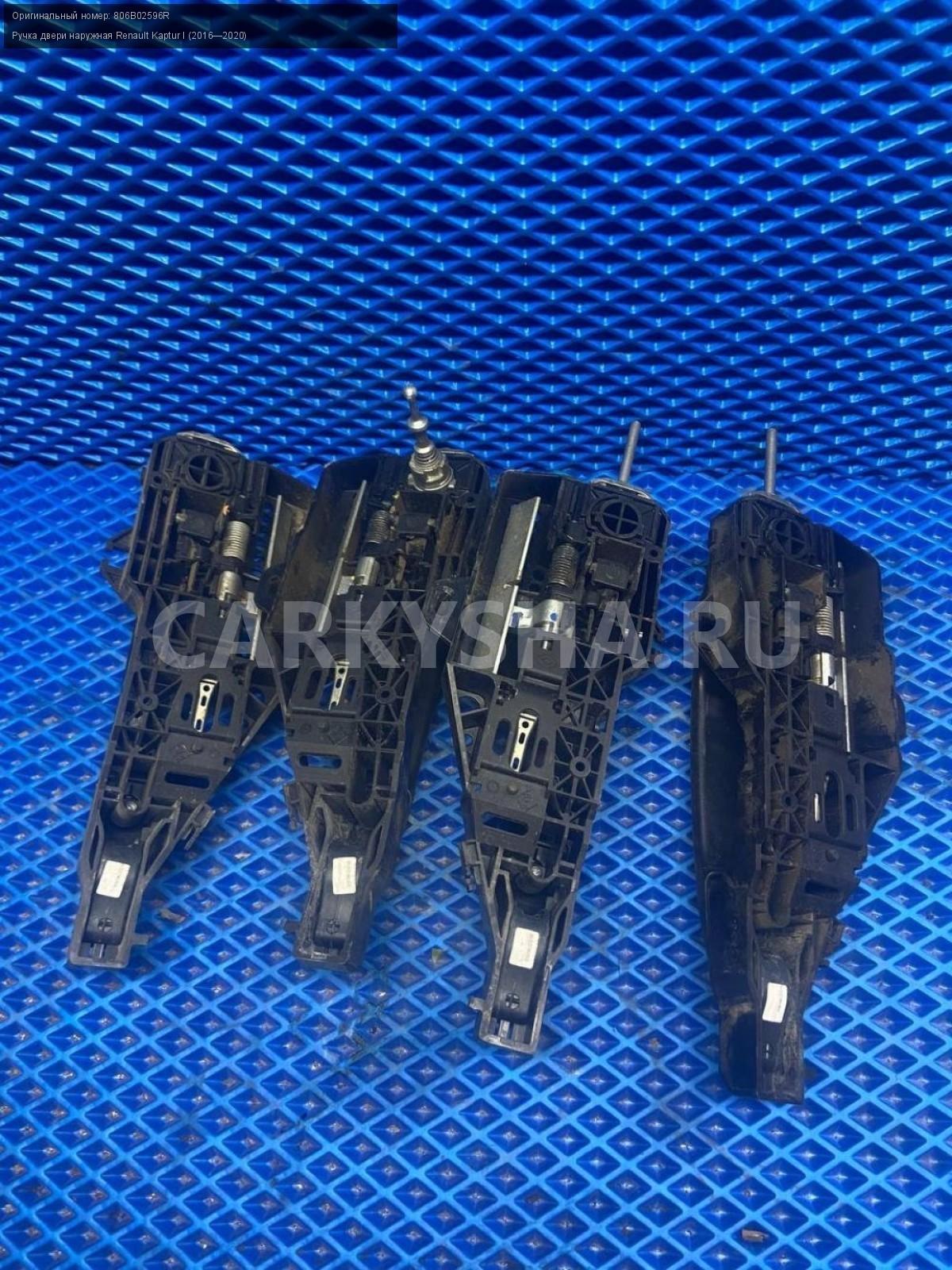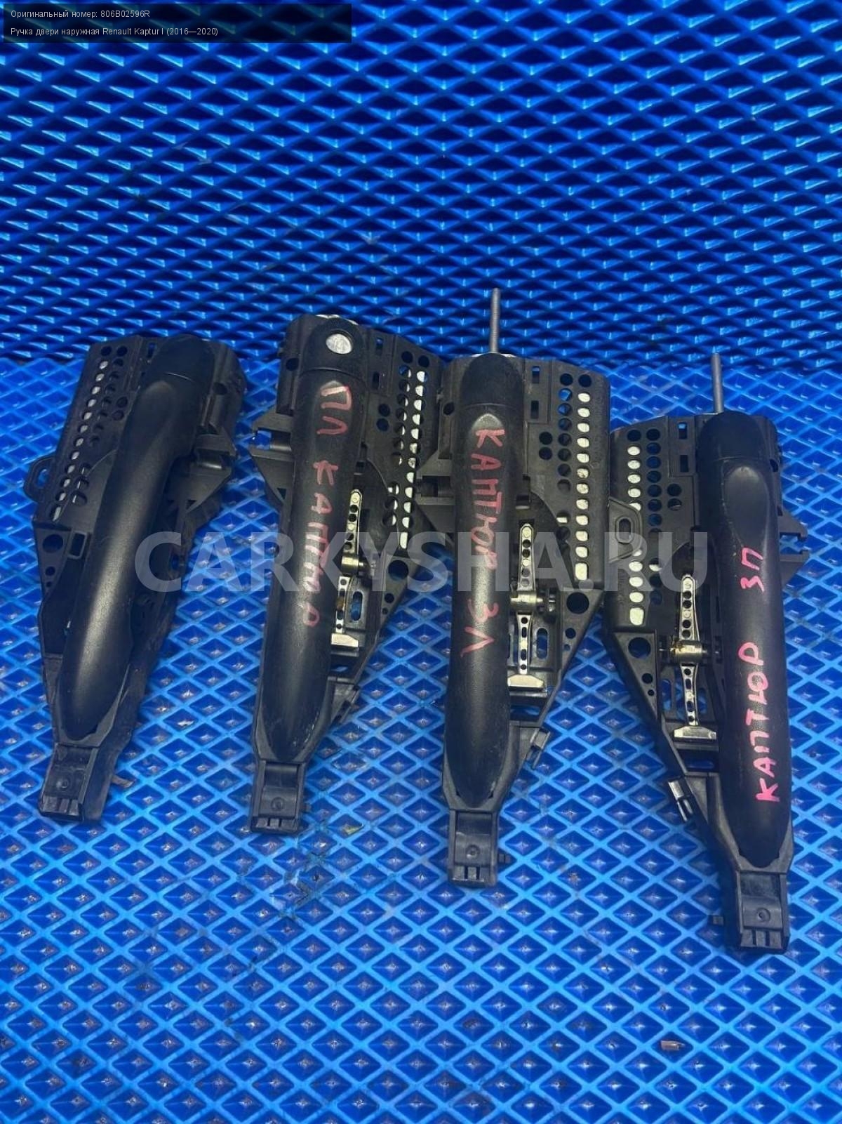 Renault Kaptur, ручки дверей наружные.\nАртикул: 7884\n\nОриг. номер: 806B02596R\nПроизводитель: RENAULT\nПримечание:Рено Каптюр, ручки дверей наружные, цена за штуку, б/у. \n\nМарка: Renault\nМодель: Kaptur I (2016—2020)\nГод выпуска: 2016\nКузов тип: Внедорожник\nДвигатель номер: H4M438\nМодель двигателя: инжектор\nОбъем: 1.6\nТопливо: Бензин\nКоробка: Механика\nЦвет: Белый\nПраво/Лево: Право/Лево\nПеред/Зад: Перед/Зад\nСовместимости: Renault Kaptur I (2016—2020) 1.6 MT (114 л.с.)\nСовместимость: