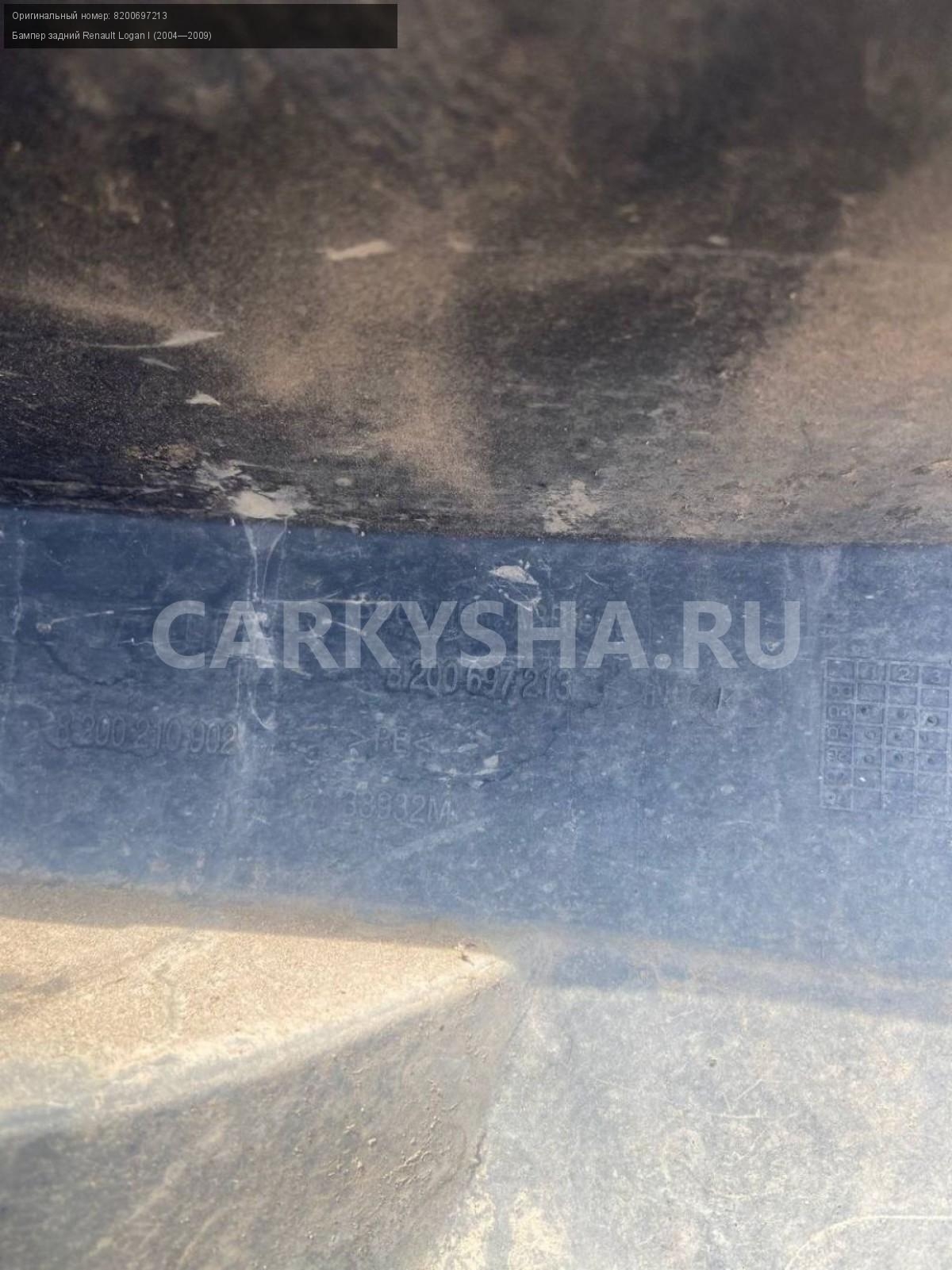 Renault Logan I фаза1, бампер задний.\nАртикул: 8218\n\nОриг. номер: 8200697213\nПроизводитель: RENAULT\nПримечание:Рено Логан 1 фаза 1, бампер задний, б/у. \n\nМарка: Renault\nМодель: Logan I (2004—2009)\nКузов тип: Седан\nДвигатель номер: k7m710\nОбъем: 1.6\nТопливо: Бензин\nКоробка: Механика\nПеред/Зад: Зад\nСовместимости: Renault Logan I (2004—2009) 1.6 MT (87 л.с.)\nСовместимость: