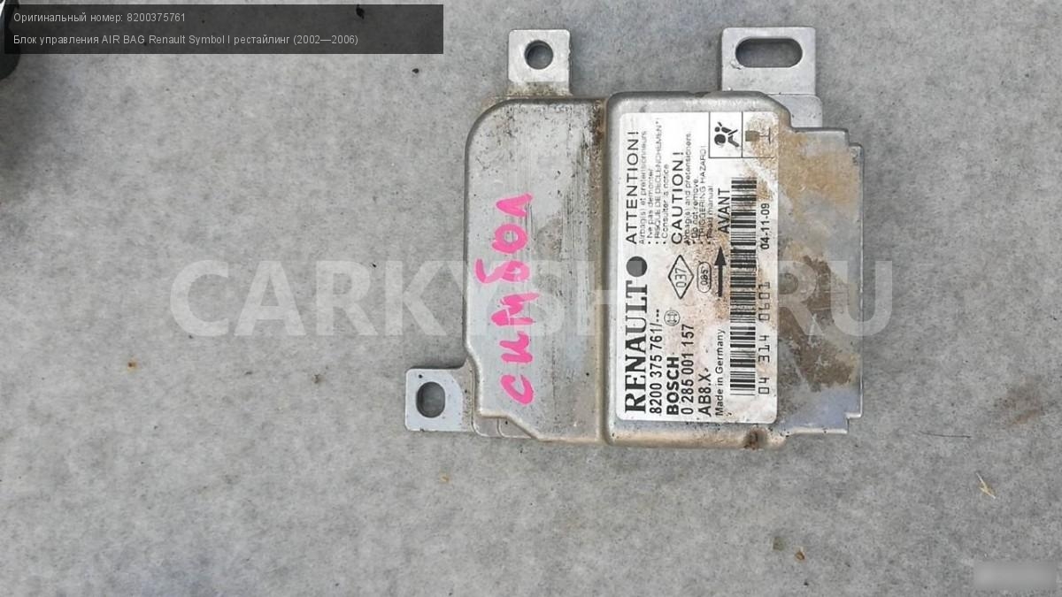 Renault symbol блок управления AIR BAG\nАртикул: 5\n\nОриг. номер: 8200375761\nПроизводитель: RENAULT\nПримечание:Renault symbol блок управления AIR BAG,б/у , а так же множество авто в разборе, работаем с регионами отправка тк, выкуп авто после дтп по всей России, отправка тк осуществляется после 100% оплаты, наложенным платежом не работаем, стоимость доставки не рассчитываем\n\nМарка: Renault\nМодель: Symbol I рестайлинг (2002—2006)\nКузов тип: Седан\nОбъем: 1.4\nТопливо: Бензин\nКоробка: Механика\nСовместимости: Renault Symbol I рестайлинг (2002—2006) 1.4 MT (75 л.с.)\nСовместимость: