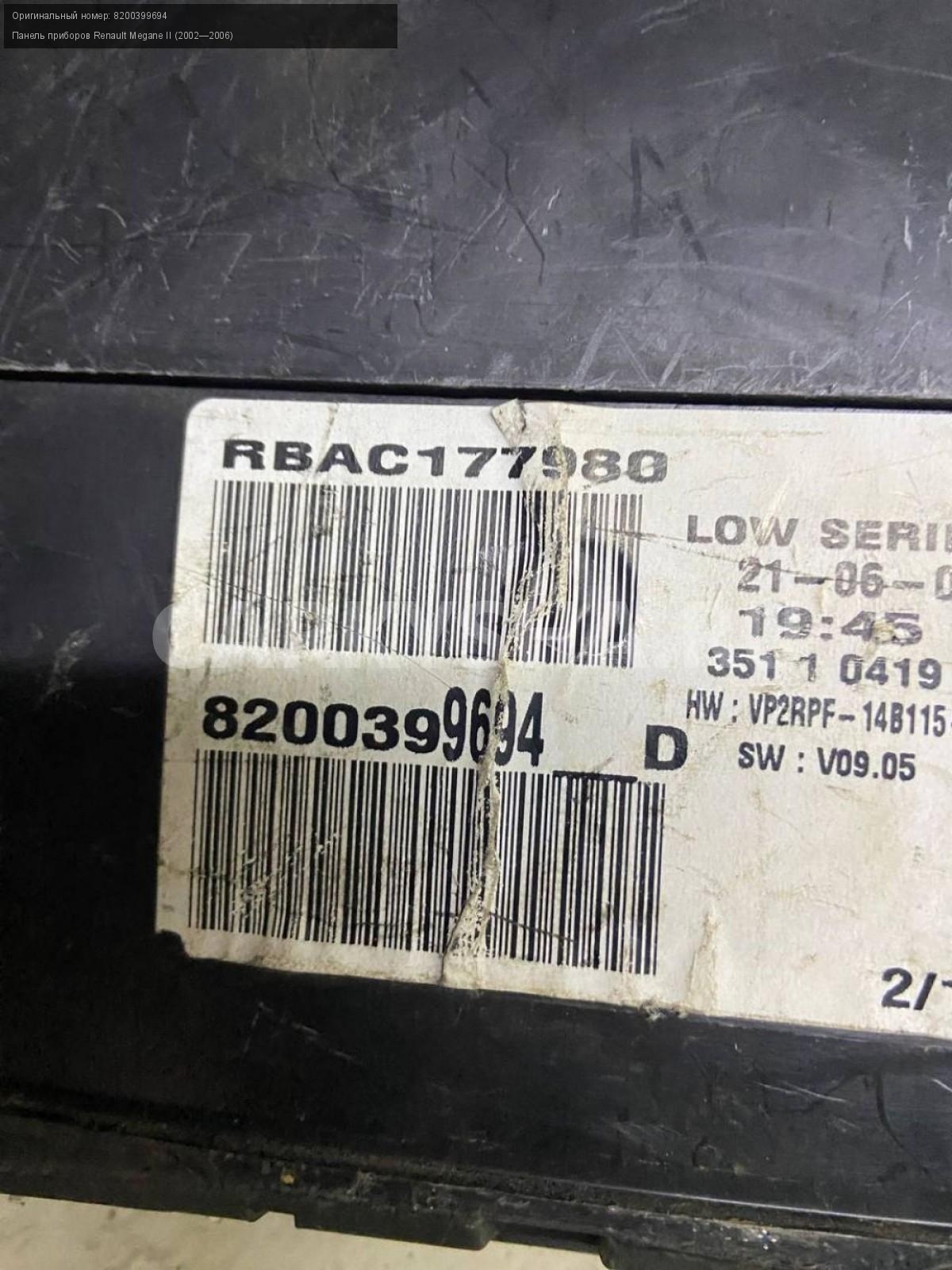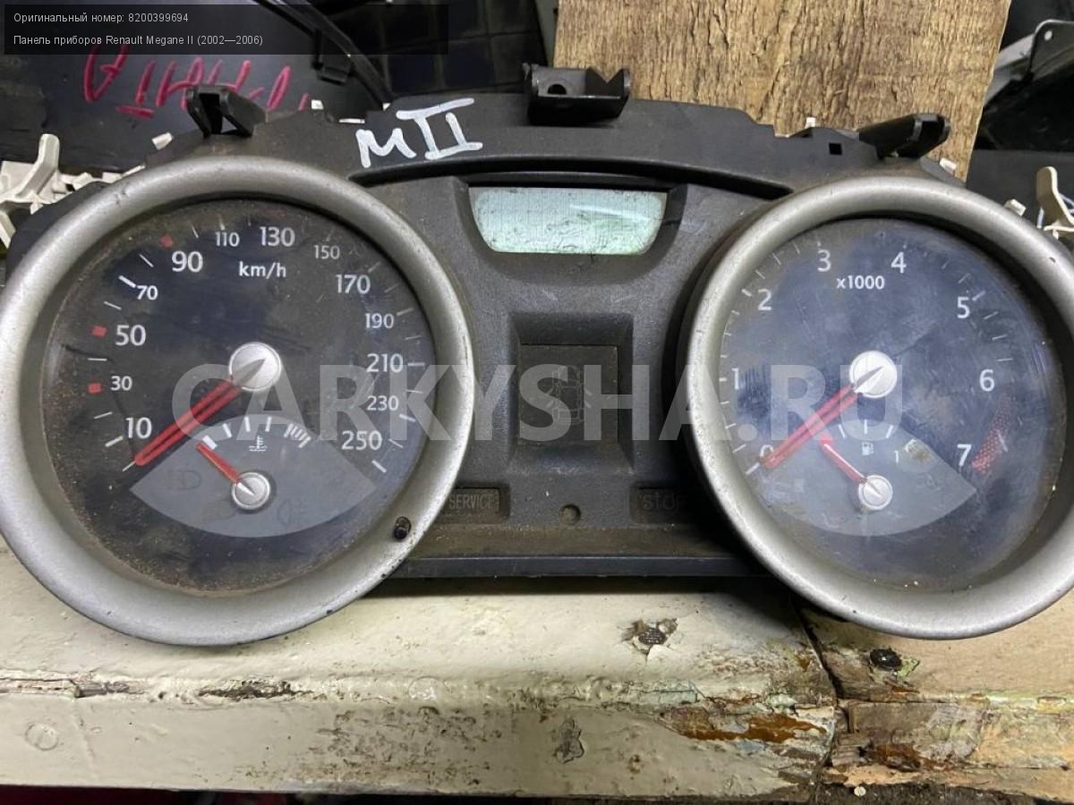 Renault Megane II , 1.6 МКПП, щиток приборов.\nАртикул: 4796\n\nОриг. номер: 8200399694\nПроизводитель: RENAULT\nПримечание:Рено Меган 2, 1.6 МКПП, Щиток приборов , бу. \n\nМарка: Renault\nМодель: Megane II (2002—2006)\nСовместимости: Renault Megane II (2002—2006)\nСовместимость: