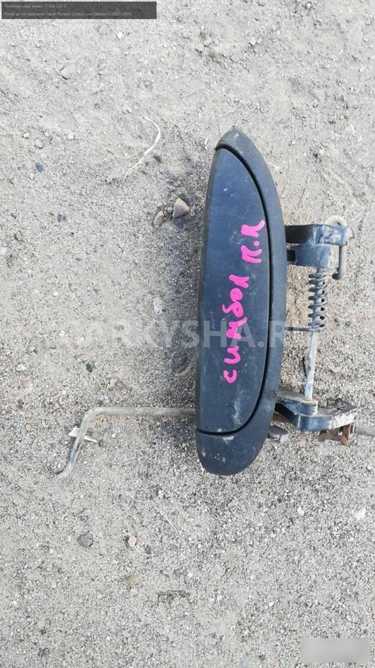 Renault symbol наружная ручка двери левая\nАртикул: 383\n\nОриг. номер: 7700433075\nПроизводитель: RENAULT\nПримечание:Renault symbol наружная ручка двери левая,б/у, а так же множество авто в разборе, работаем с регионами отправка тк, выкуп авто после дтп по всей России, отправка тк осуществляется после 100% оплаты, наложенным платежом не работаем, стоимость доставки не рассчитываем\n\nМарка: Renault\nМодель: Symbol I рестайлинг (2002—2006)\nКузов тип: Седан\nОбъем: 1.4\nТопливо: Бензин\nКоробка: Механика\nСовместимости: Renault Symbol I рестайлинг (2002—2006) 1.4 MT (75 л.с.)\nСовместимость: