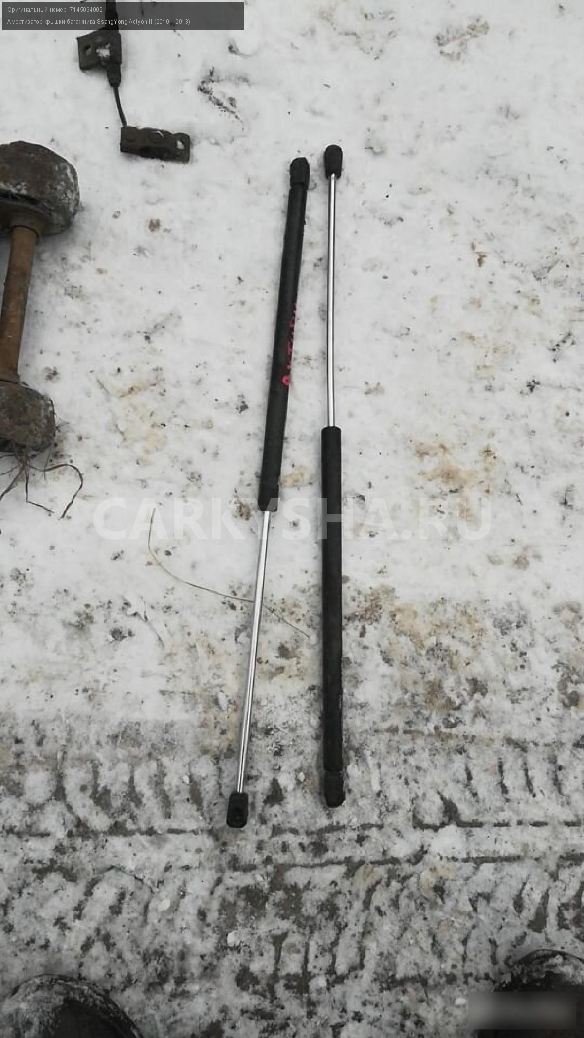 Ssangyong new actyon амортизатор крышки багажника\nАртикул: 1496\n\nОриг. номер: 7145034002\nПроизводитель: SSANG YONG\nПримечание:Ssangyong new actyon амортизатор крышки багажника,цена за пару.НАЛИЧИЕ ЗАПЧАСТИ УТОЧНИТЕ ПО ТЕЛЕФОНУ ИЛИ В СООБЩЕНИЯХ,б/у, а так же множество авто в разборе, работаем с регионами отправка тк, выкуп авто после дтп по всей России, отправка тк осуществляется после 100% оплаты, наложенным платежом не работаем, стоимость доставки не рассчитываем\n\nМарка: SsangYong\nМодель: Actyon II (2010—2013)\nКузов тип: Внедорожник\nОбъем: 2.0\nТопливо: Дизель\nКоробка: Автомат\nСовместимости: SsangYong Actyon II (2010—2013) 2.0 D 4WD AT (149 л.с.)\nСовместимость: