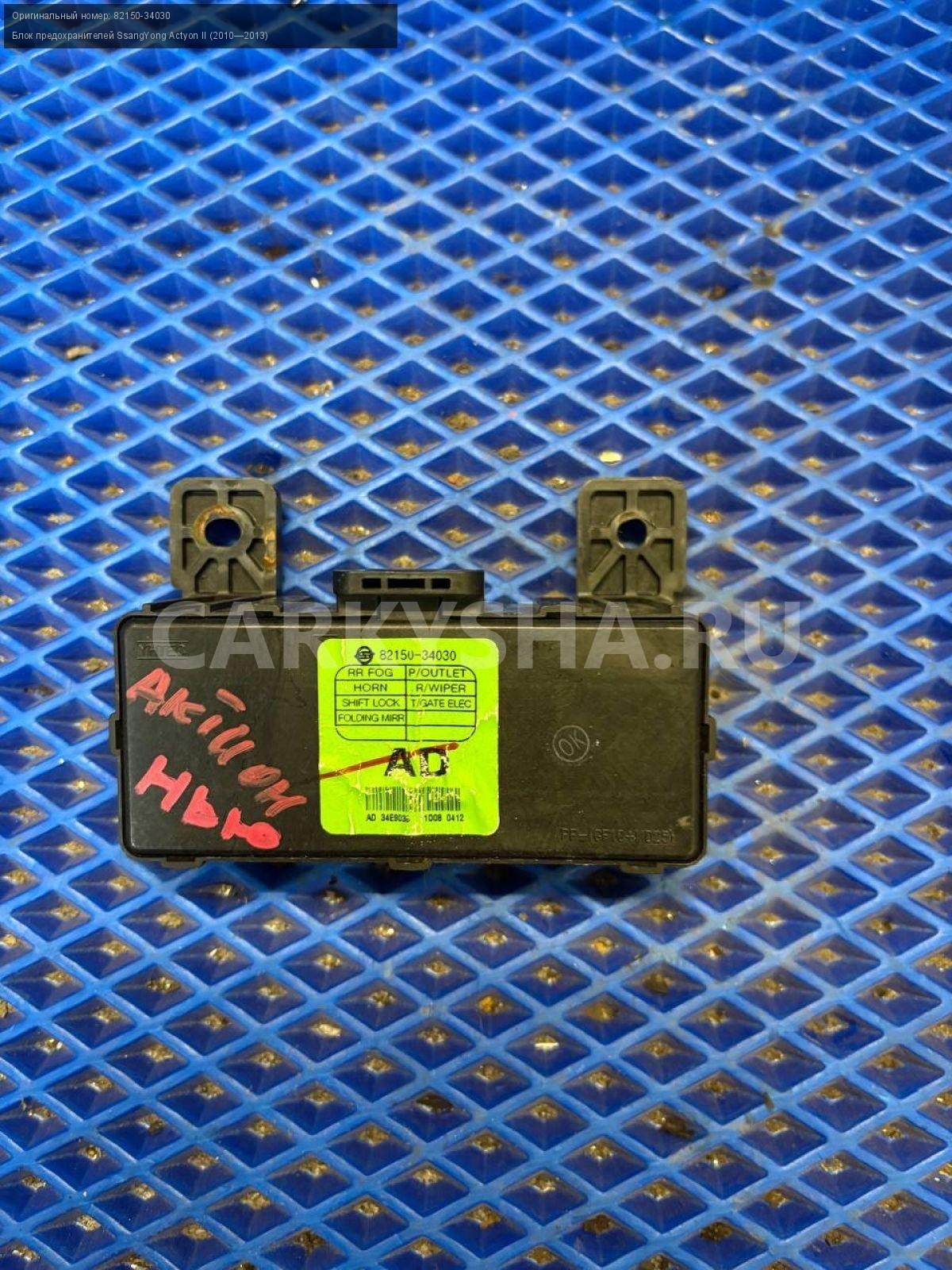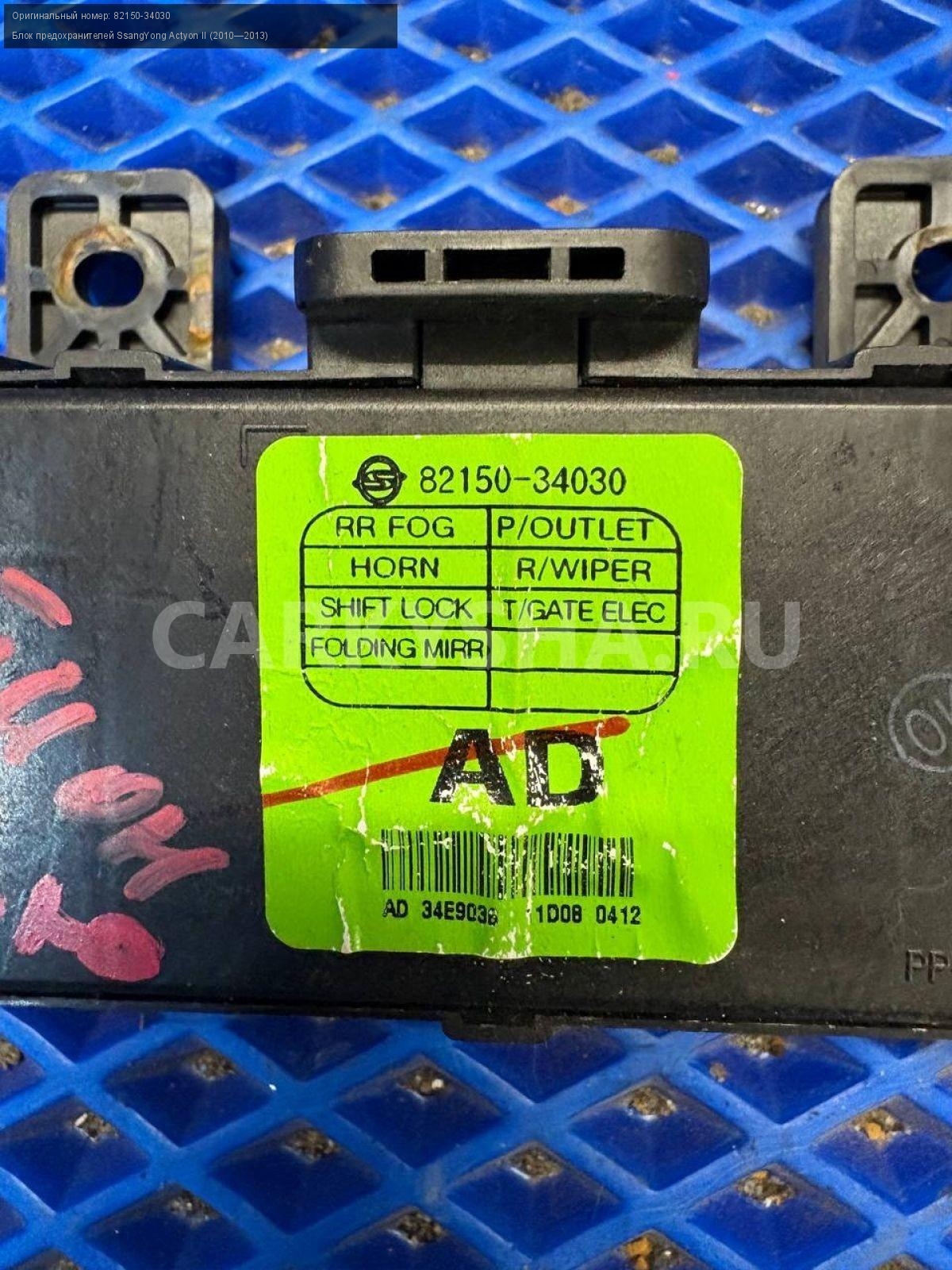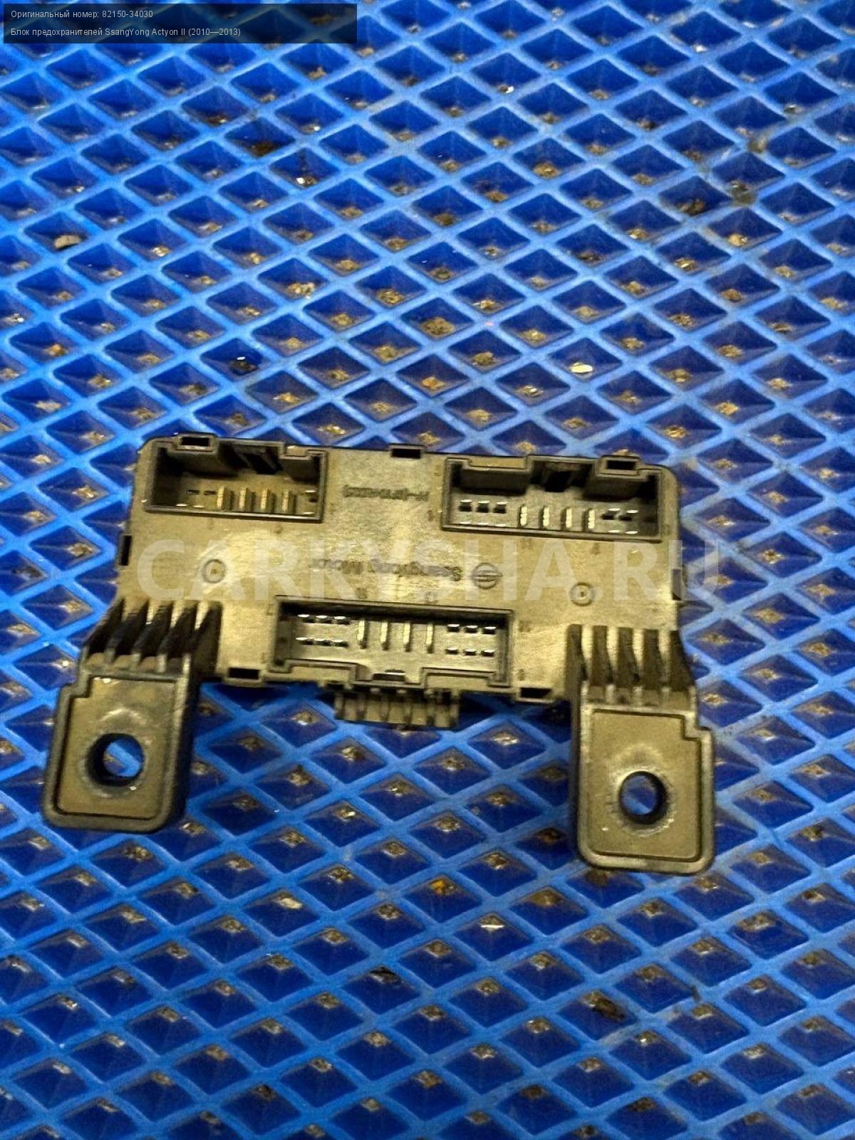 SsangYong Actyon New, блок предохранителей.\nАртикул: 9865\n\nОриг. номер: 82150-34030\nПроизводитель: SSANG YONG\nПримечание:СсангЕнг Актион Нью, блок предохранителей б/у\n\nМарка: SsangYong\nМодель: Actyon II (2010—2013)\nГод выпуска: 2011\nКузов тип: Внедорожник\nДвигатель номер: D20DTF\nМодель двигателя: турбо-дизель\nОбъем: 2.0\nТопливо: Дизель\nКоробка: Автомат\nЦвет: Серебристый\nСовместимости: SsangYong Actyon II (2010—2013) 2.0 D AT (149 л.с.)\nСовместимость: