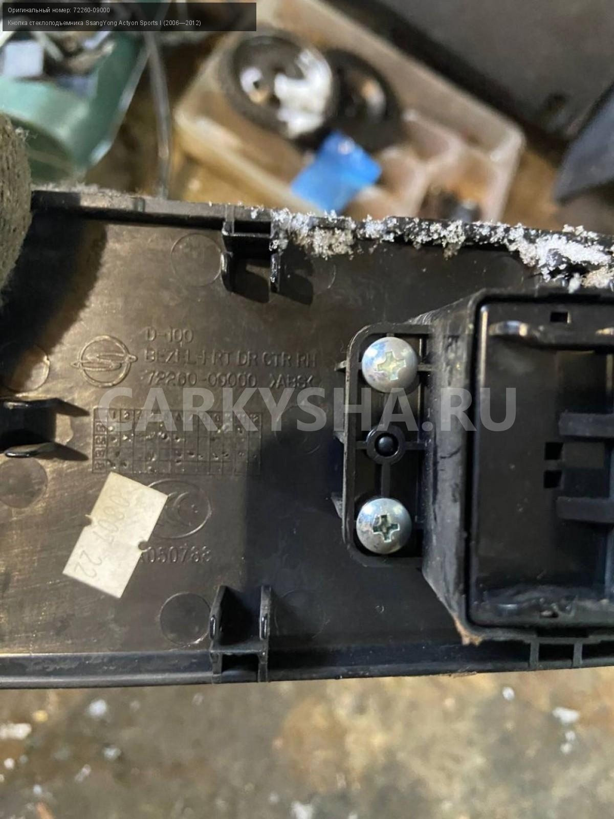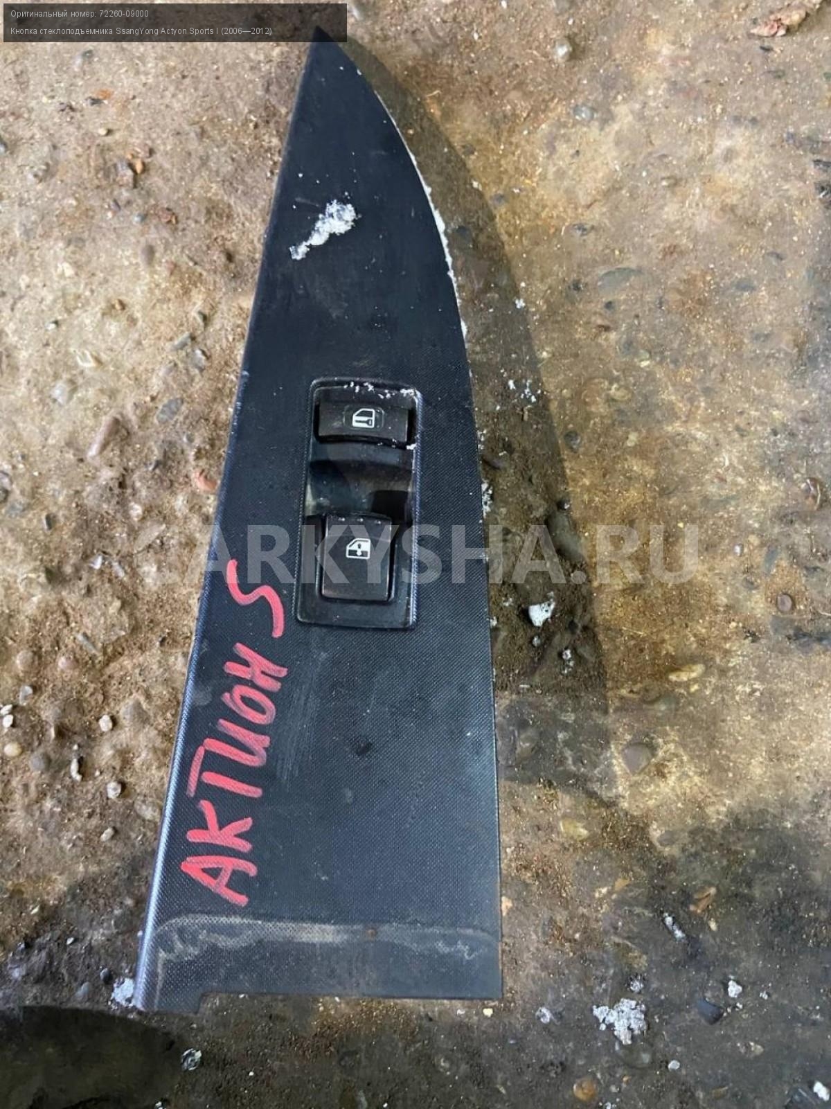 SsangYong Actyon Sports кнопка стеклоподъемника пп\nАртикул: 6757\n\nОриг. номер: 72260-09000\nПроизводитель: SSANG YONG\nПримечание:СсангЕнг Актион Спорт, кнопка стеклоподъемника передняя правая, б/у. \n\nМарка: SsangYong\nМодель: Actyon Sports I (2006—2012)\nГод выпуска: 2008\nКузов тип: Пикап\nДвигатель номер: 664950\nМодель двигателя: турбо-дизель\nОбъем: 2.0\nТопливо: Дизель\nКоробка: Механика\nЦвет: Синий\nПраво/Лево: Право\nПеред/Зад: Перед\nСовместимости: SsangYong Actyon Sports I (2006—2012) 2.0 Xdi 4WD MT (141 л.с.)\nСовместимость: