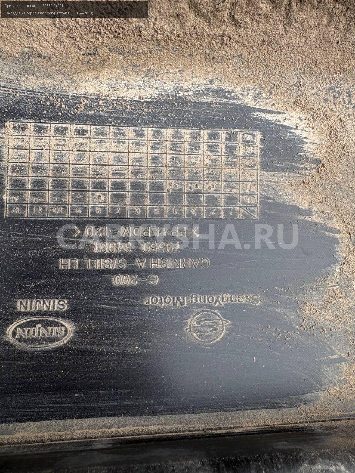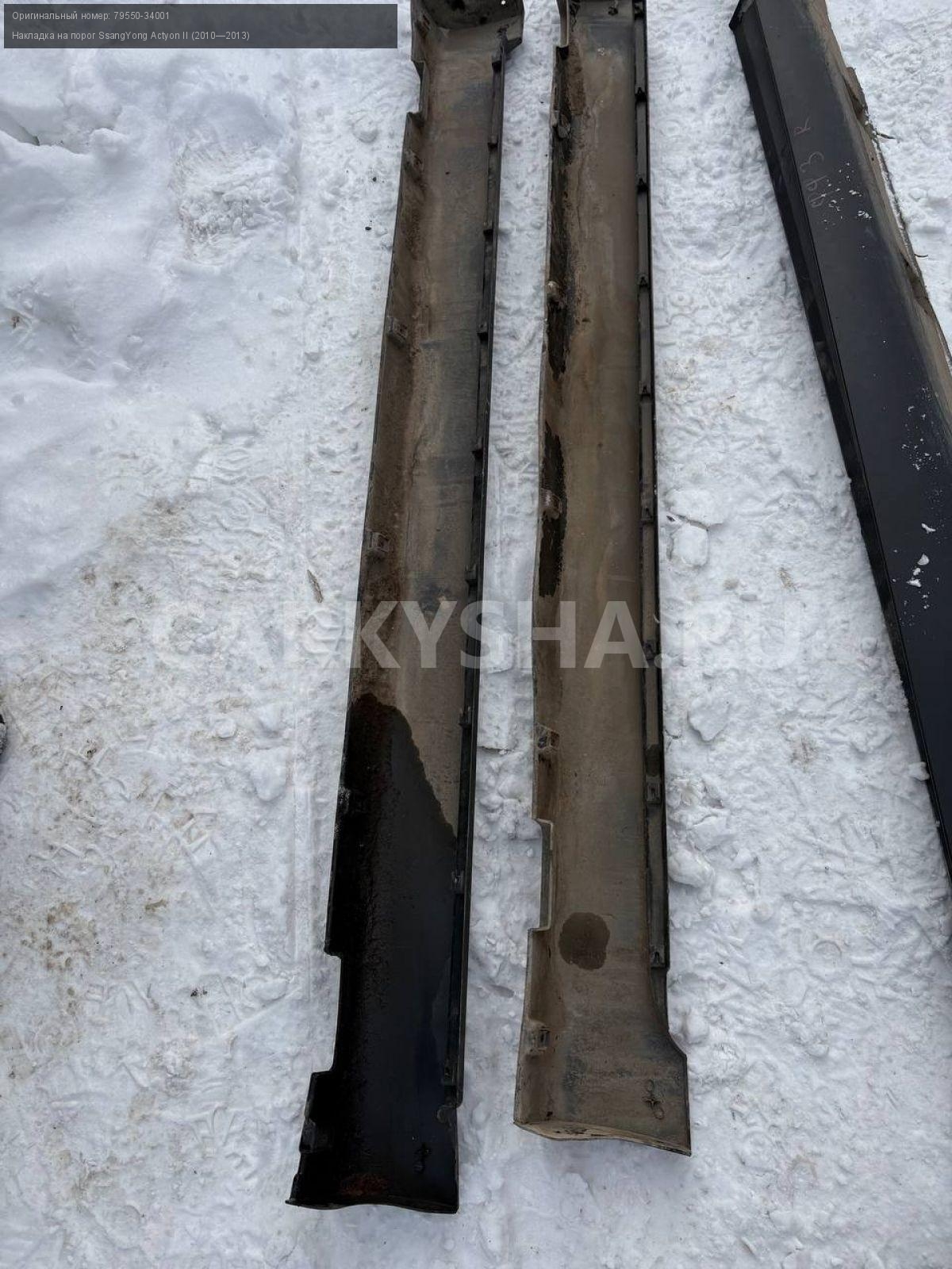 SsangYong Actyon New, накладка порога.\nАртикул: 9887\n\nОриг. номер: 79550-34001\nПроизводитель: SSANG YONG\nПримечание:СсангЕнг Актион Нью, накладки порогов, цена за штуку, б/у. \n\nМарка: SsangYong\nМодель: Actyon II (2010—2013)\nГод выпуска: 2011\nКузов тип: Внедорожник\nДвигатель номер: D20DTF\nМодель двигателя: турбо-дизель\nОбъем: 2.0\nТопливо: Дизель\nКоробка: Автомат\nЦвет: Серебристый\nПраво/Лево: Право/Лево\nСовместимости: SsangYong Actyon II (2010—2013) 2.0 D AT (149 л.с.)\nСовместимость: