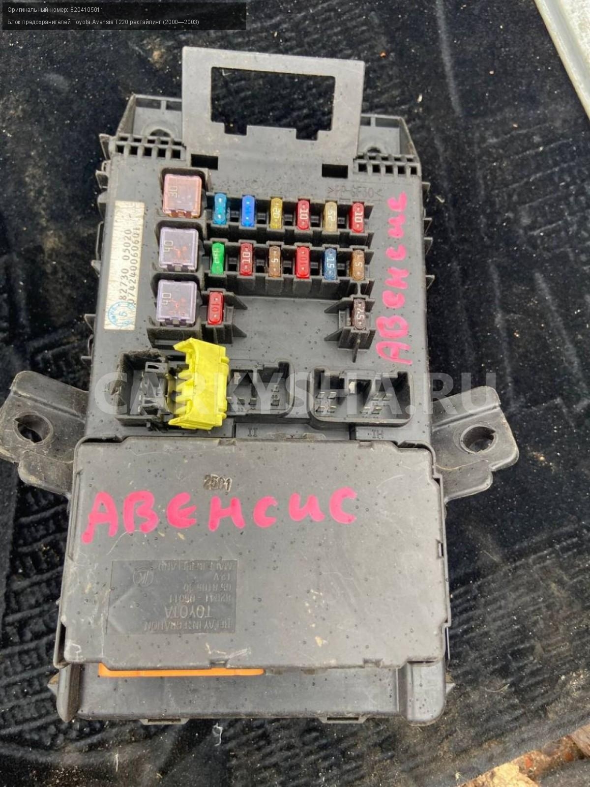 Toyota Avensis T220, блок предохранителей.\nАртикул: 3608\n\nОриг. номер: 8204105011\nПроизводитель: TOYOTA\nПримечание:Тойота Авенсис Т 220, блок предохранителей, б/у. \n\nМарка: Toyota\nМодель: Avensis T220 рестайлинг (2000—2003)\nГод выпуска: 2001\nКузов тип: Седан\nДвигатель номер: 1ZZ-FE\nМодель двигателя: инжектор\nОбъем: 1.8\nТопливо: Бензин\nКоробка: Механика\nЦвет: Синий\nСовместимости: Toyota Avensis T220 рестайлинг (2000—2003) 1.8 MT (129 л.с.)\nСовместимость: