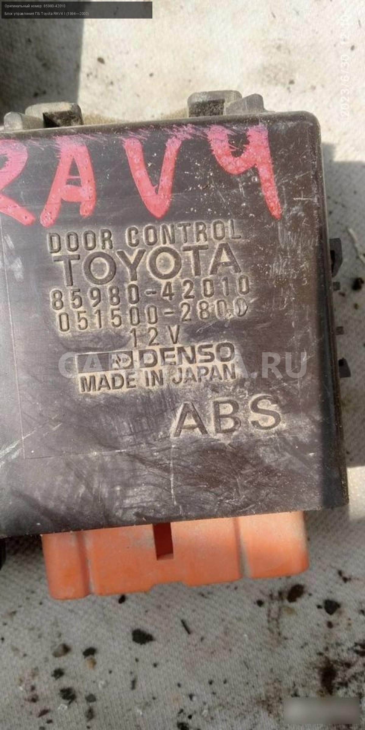 Toyota rav 4 xa10 блок управления\nАртикул: 2442\n\nОриг. номер: 85980-42010\nПроизводитель: Denso\nПримечание:Тойота Рав4 ХА10 1998г левый руль 5 дверей электронный блок управления дверьми 85980-42010 бу, а так же множество автомобилей в разборе, работаем с регионами отправка тк , выкуп авто после ДТП по всей России, отправка тк осуществляется после 100% оплаты, наложенным платежом не работаем стоимость доставки не рассчитываем\n\nМарка: Toyota\nМодель: RAV4 I (1994—2000)\nКузов тип: Внедорожник\nОбъем: 2.0\nТопливо: Бензин\nКоробка: Механика\nСовместимости: Toyota RAV4 I (1994—2000) 2.0 4WD MT (180 л.с.)\nСовместимость: