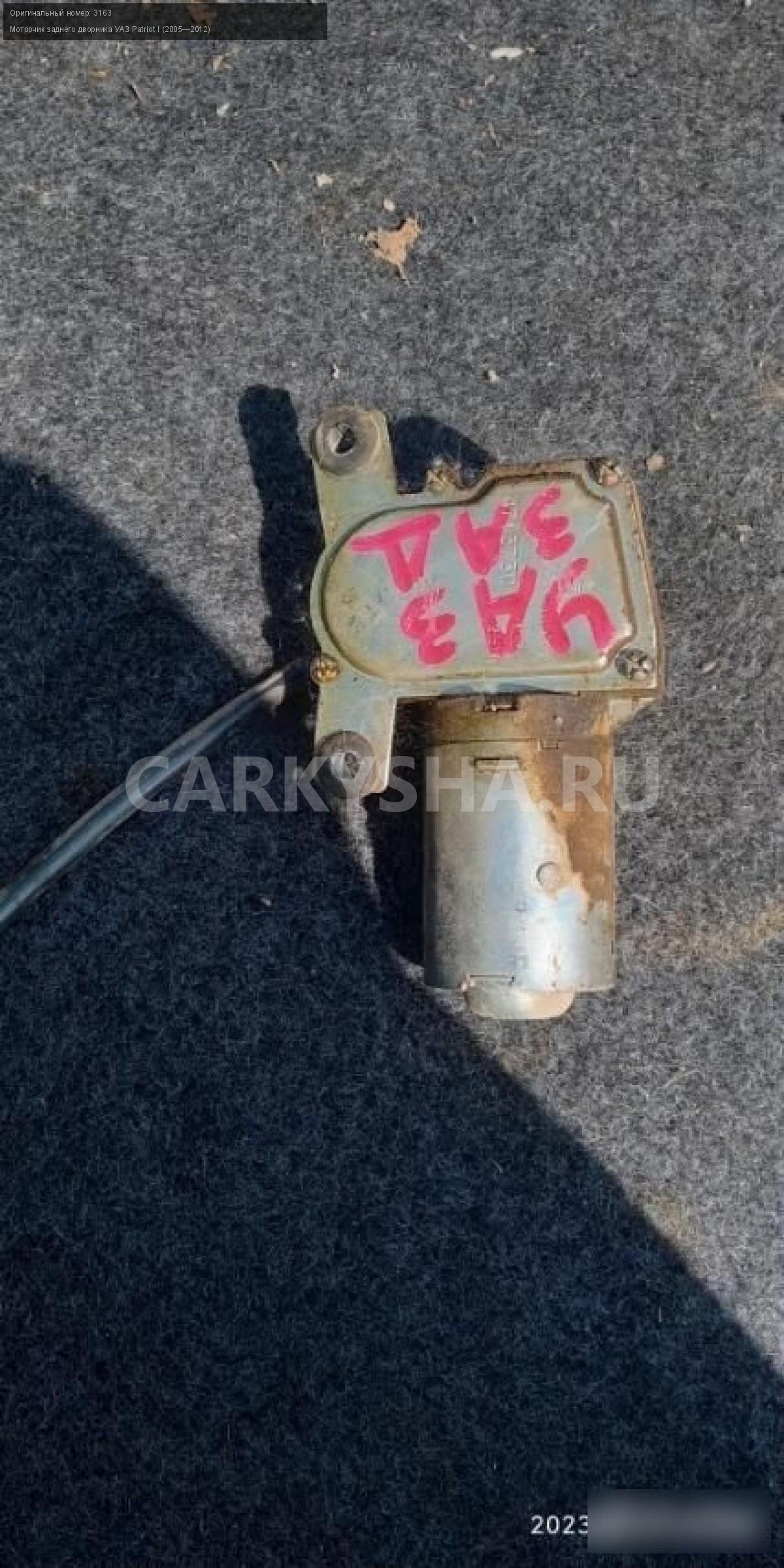 УАЗ патриот моторчик заднего дворника\nАртикул: 1805\n\nОриг. номер: 3163\nПроизводитель: ОАОЗМЗ\nПримечание:УАЗ патриот моторчик заднего дворника.НАЛИЧИЕ ЗАПЧАСТИ УТОЧНИТЕ ПО ТЕЛЕФОНУ ИЛИ В СООБЩЕНИЯХ,б/у, а так же множество авто в разборе, работаем с регионами отправка тк, выкуп авто после дтп по всей России, отправка тк осуществляется после 100% оплаты, наложенным платежом не работаем, стоимость доставки не рассчитываем\n\nМарка: УАЗ\nМодель: Patriot I (2005—2012)\nКузов тип: Внедорожник\nОбъем: 2.7\nТопливо: Бензин\nКоробка: Механика\nСовместимости: УАЗ Patriot I (2005—2012) 2.7 MT (128 л.с.)\nСовместимость: