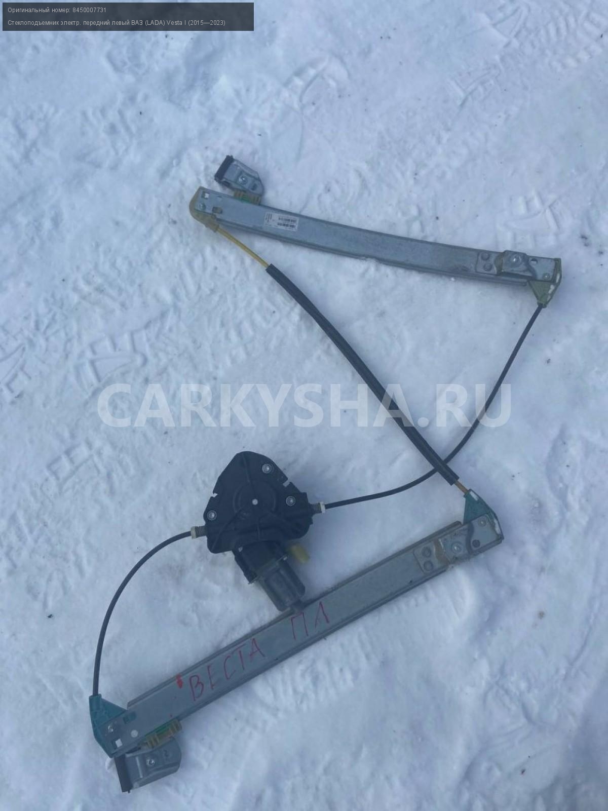 ВАЗ (LADA) Vesta, стеклоподъемник передний левый.\nАртикул: 4253\n\nОриг. номер: 8450007731\nПроизводитель: АвтоВАЗ\nПримечание:Ваз(Лада) Веста, стеклоподъемник передней левой двери, бу. \n\nМарка: ВАЗ (LADA)\nМодель: Vesta I (2015—2023)\nГод выпуска: 2019\nКузов тип: Универсал\nДвигатель номер: 21129\nМодель двигателя: инжектор\nОбъем: 1.6\nТопливо: Бензин\nКоробка: Механика\nЦвет: Серо-Бежевый\nПраво/Лево: Лево\nПеред/Зад: Перед\nСовместимости: ВАЗ (LADA) Vesta I (2015—2023) 1.6 MT (106 л.с.)\nСовместимость: