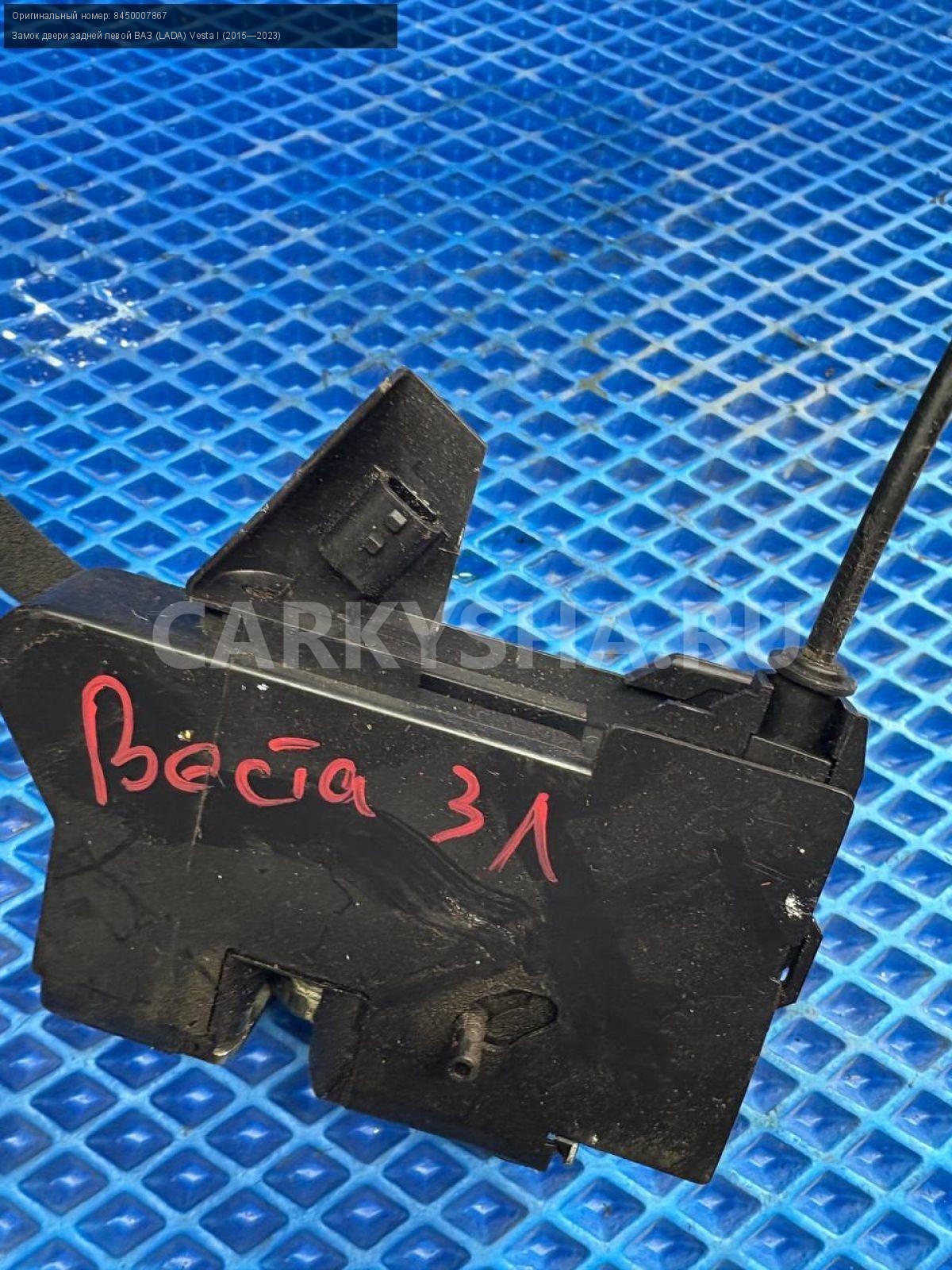 ВАЗ (LADA) Vesta, замок двери задней левой.\nАртикул: 8617\n\nОриг. номер: 8450007867\nПроизводитель: АвтоВАЗ\nПримечание:Ваз Лада Веста, замок двери задней левой, б/у. \n\nМарка: ВАЗ (LADA)\nМодель: Vesta I (2015—2023)\nГод выпуска: 2017\nКузов тип: Седан\nДвигатель номер: 21129\nМодель двигателя: инжектор\nОбъем: 1.6\nТопливо: Бензин\nКоробка: Робот\nЦвет: Белый\nПраво/Лево: Лево\nПеред/Зад: Зад\nСовместимости: ВАЗ (LADA) Vesta I (2015—2023) 1.6 AMT (106 л.с.)\nСовместимость: