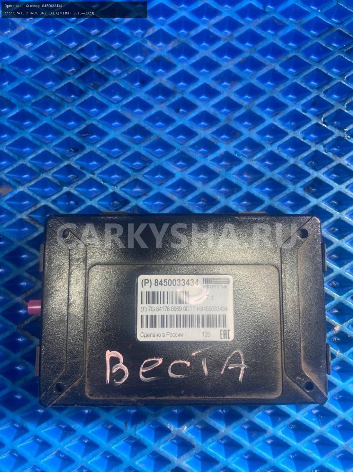 ВАЗ (LADA) Vesta, Блок эра глонасс.\nАртикул: 7606\n\nОриг. номер: 8450033434\nПроизводитель: АвтоВАЗ\nПримечание:Ваз Лада Веста, блок эра глонасс, б/у. \n\nМарка: ВАЗ (LADA)\nМодель: Vesta I (2015—2023)\nГод выпуска: 2019\nКузов тип: Седан\nДвигатель номер: 21129\nМодель двигателя: инжектор\nОбъем: 1.6\nТопливо: Бензин\nКоробка: Механика\nЦвет: Серебристый\nСовместимости: ВАЗ (LADA) Vesta I (2015—2023) 1.6 MT (106 л.с.)\nСовместимость: