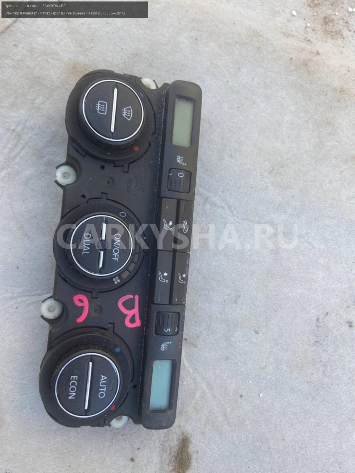 Volkswagen Passat B6, блок управления климатом.\nАртикул: 3490\n\nОриг. номер: 3C0907044BB\nПроизводитель: VOLKSWAGEN\nПримечание:Фольцваген Пассат Б6, блок управления климат контролем, б/у.\n\nМарка: Volkswagen\nМодель: Passat B6 (2005—2010)\nГод выпуска: 2010\nКузов тип: Универсал\nДвигатель номер: Bmp\nМодель двигателя: турбо-дизель\nОбъем: 2.0\nТопливо: Дизель\nКоробка: Робот\nЦвет: Серебристый\nСовместимости: Volkswagen Passat B6 (2005—2010) 2.0 TDI DSG (140 л.с.)\nСовместимость: