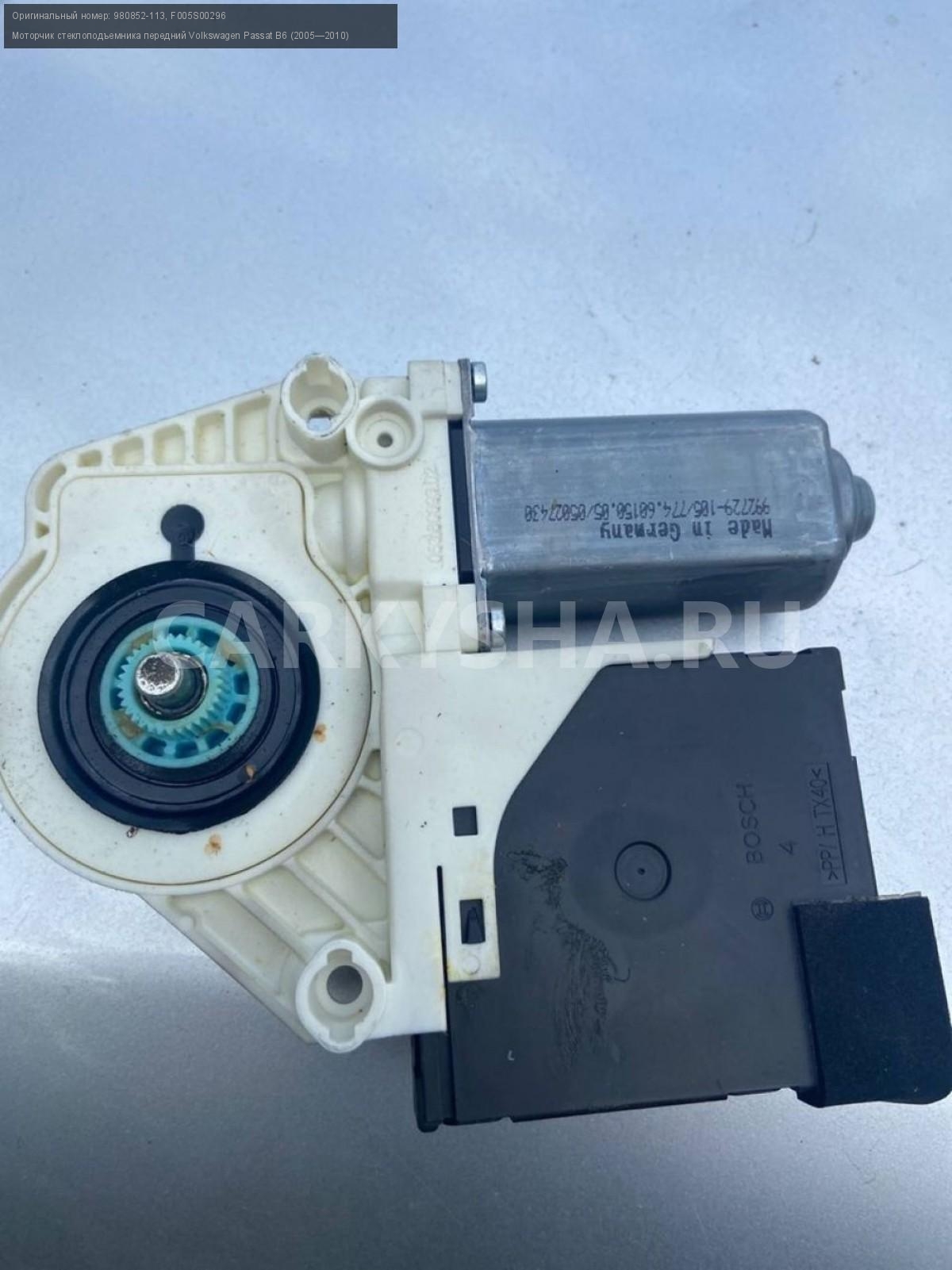 Volkswagen Passat B6, моторчик стеклоподъемника\nАртикул: 3025\n\nОриг. номер: 980852-113\nНомера замен: F005S00296\nПроизводитель: VOLKSWAGEN\nПримечание:Фольцваген Пассат Б6, моторчик стеклоподъёмника передний правый, б/у\n\nМарка: Volkswagen\nМодель: Passat B6 (2005—2010)\nГод выпуска: 2010\nКузов тип: Универсал\nДвигатель номер: Bmp\nМодель двигателя: турбо-дизель\nОбъем: 2.0\nТопливо: Дизель\nКоробка: Робот\nЦвет: Серебристый\nПраво/Лево: Право\nПеред/Зад: Перед\nСовместимости: Volkswagen Passat B6 (2005—2010) 2.0 TDI DSG (140 л.с.)\nСовместимость: