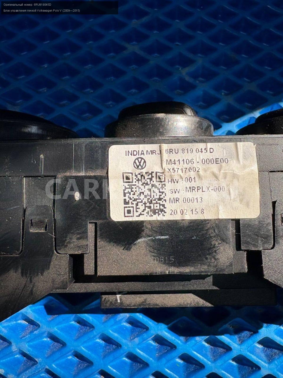 Volkswagen Polo V, блок управления печкой\nАртикул: 8441\n\nОриг. номер: 6RU819045D\nПроизводитель: VAG\nПримечание:Фольцваген Поло 5, блок управления печкой , отопителем, без кондиционера, б/у. \n\nМарка: Volkswagen\nМодель: Polo V (2009—2015)\nГод выпуска: 2015\nКузов тип: Седан\nДвигатель номер: CFNB\nОбъем: 1.6\nТопливо: Бензин\nКоробка: Механика\nЦвет: Серебристо-желтый\nСовместимости: Volkswagen Polo V (2009—2015) 1.6 MPI MT (85 л.с.)\nСовместимость: