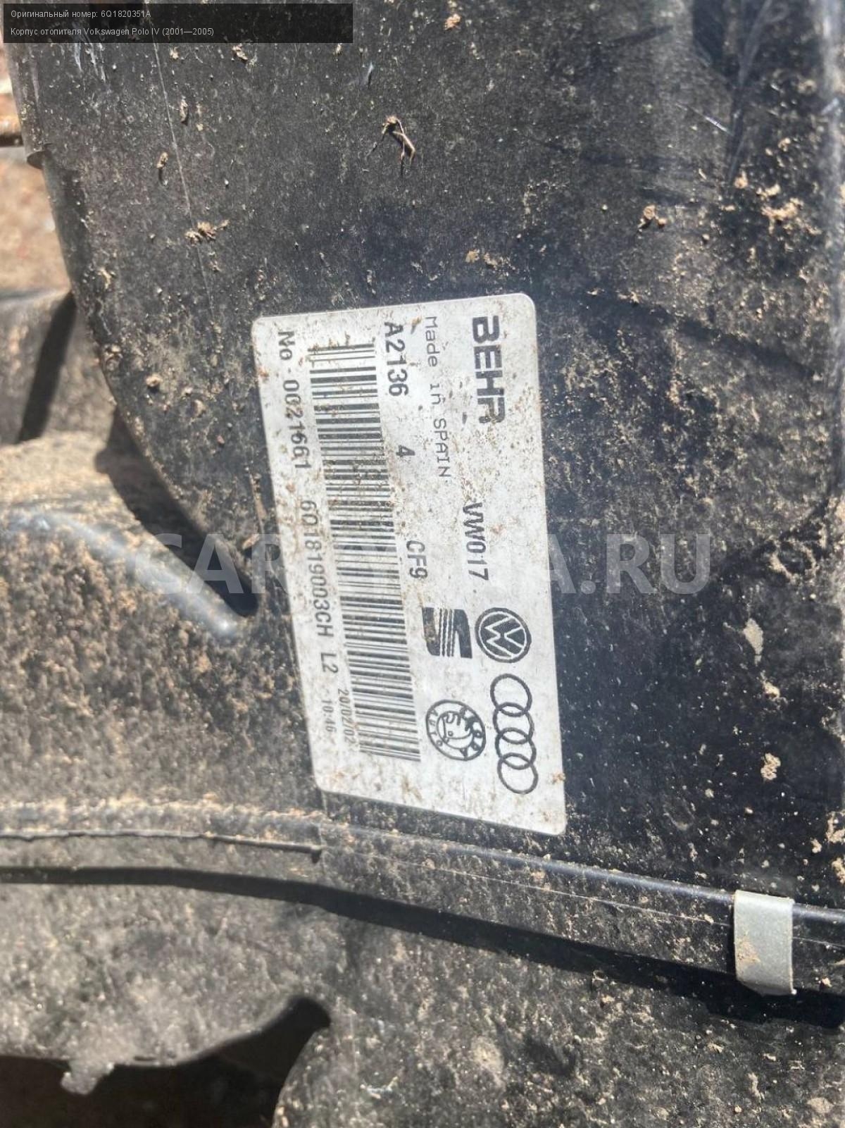 Volkswagen Polo IV , корпус отопителя.\nАртикул: 5377\n\nОриг. номер: 6Q1820351A\nПроизводитель: VAG\nПримечание:Фольцваген Поло 4, корпус отопителя без кондиционера, комплектность на фото, бу. \n\nМарка: Volkswagen\nМодель: Polo IV (2001—2005)\nГод выпуска: 2002\nКузов тип: Хетчбэк\nДвигатель номер: BBY\nМодель двигателя: инжектор\nОбъем: 1.4\nТопливо: Бензин\nКоробка: Автомат\nЦвет: Синий\nСовместимости: Volkswagen Polo IV (2001—2005) 1.4 AT (75 л.с.)\nСовместимость: