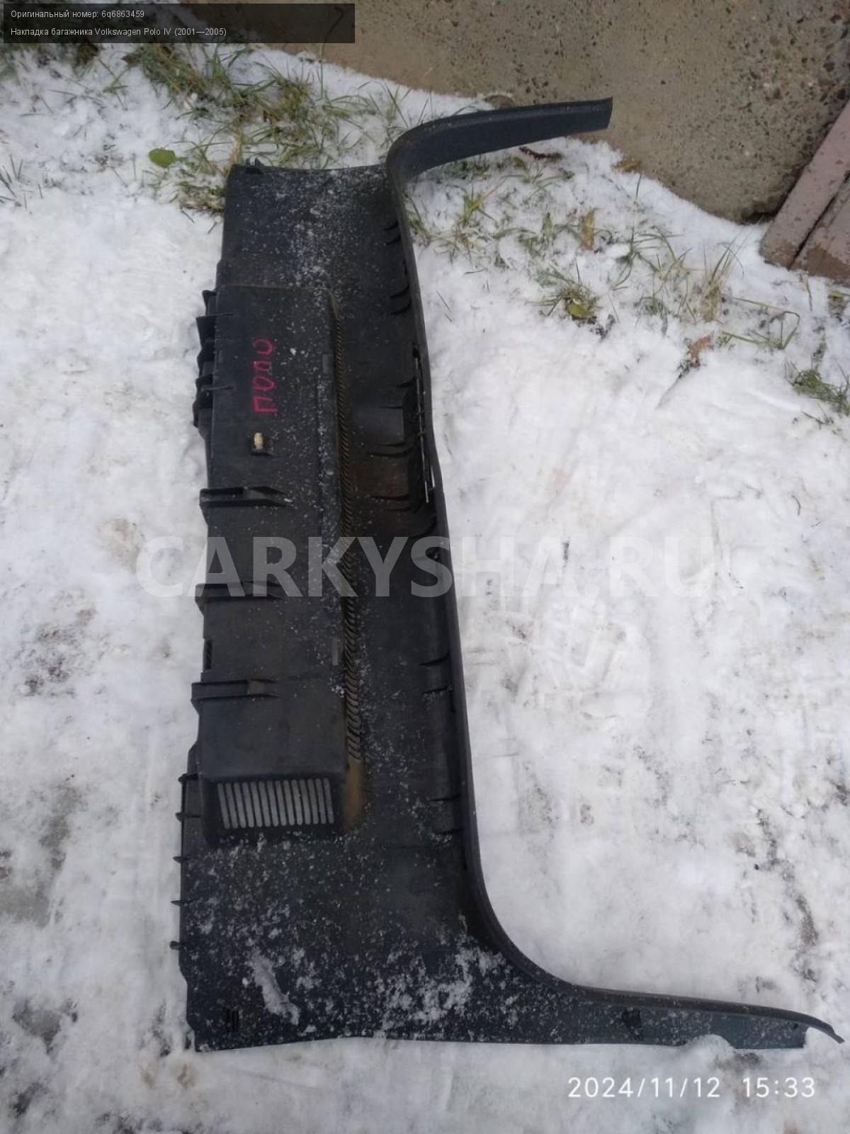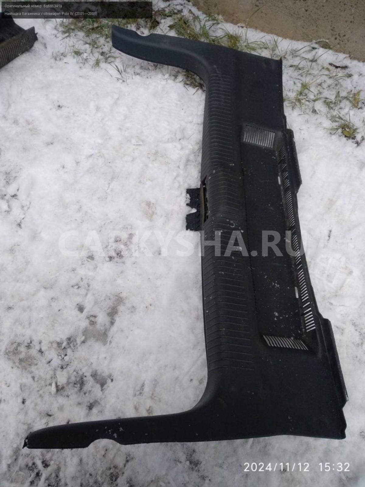 Volkswagen Polo IV хэтч, замковая панель багажника\nАртикул: 6265\n\nОриг. номер: 6q6863459\nПроизводитель: VAG\nПримечание:Фольцваген Поло 4 хэтчбек, замковая панель багажника, (накладка багажника), б/у. \n\nМарка: Volkswagen\nМодель: Polo IV (2001—2005)\nГод выпуска: 2002\nКузов тип: Хетчбэк\nДвигатель номер: BBY\nМодель двигателя: инжектор\nОбъем: 1.4\nТопливо: Бензин\nКоробка: Автомат\nЦвет: Синий\nСовместимости: Volkswagen Polo IV (2001—2005) 1.4 AT (75 л.с.)\nСовместимость: