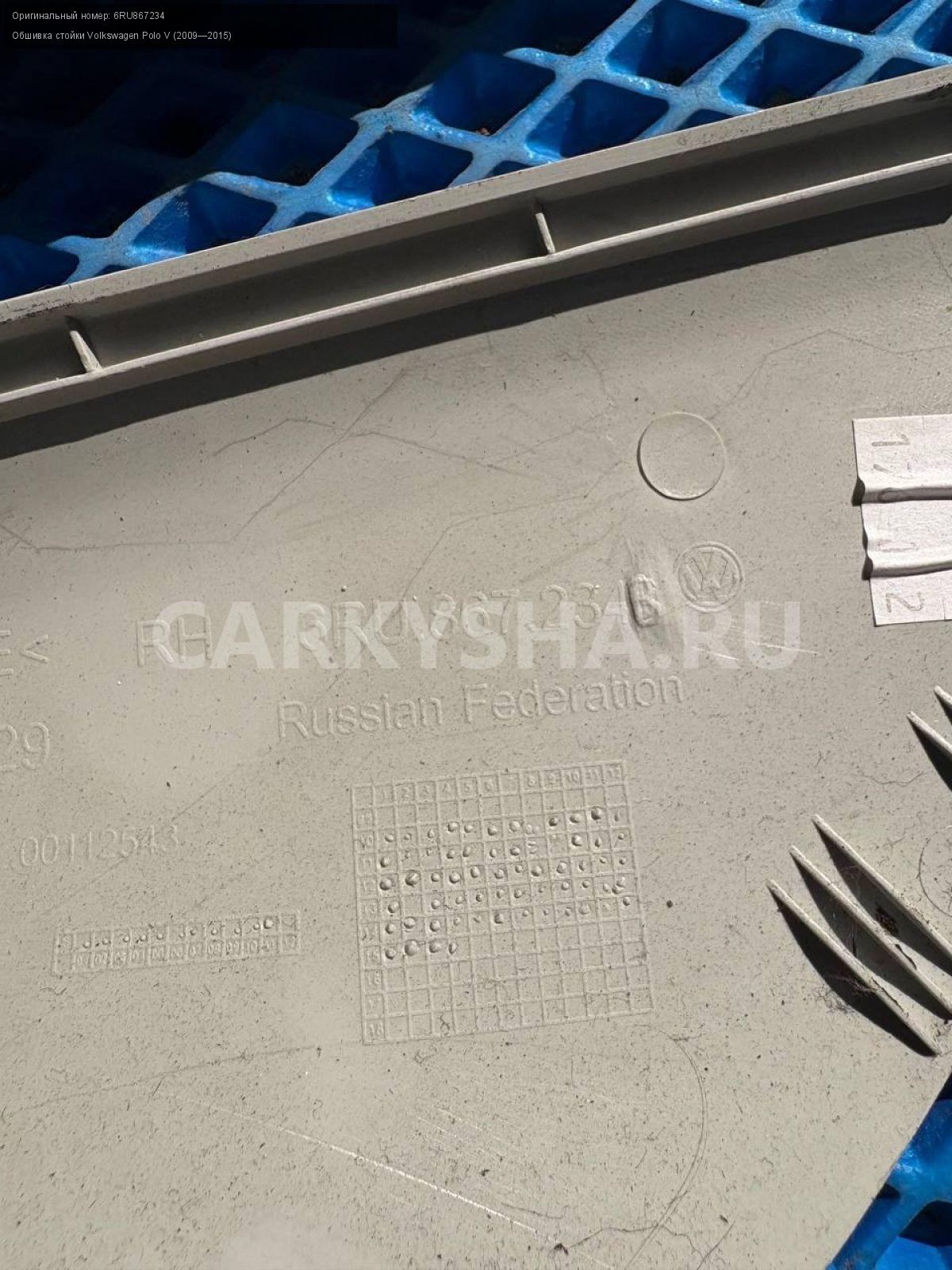 Volkswagen Polo V, обшивка стойки лобового стекла.\nАртикул: 8465\n\nОриг. номер: 6RU867234\nПроизводитель: VAG\nПримечание:Фольксваген Поло 5, обшивка стойки лобового стекла, цена за пару, б/у. \n\nМарка: Volkswagen\nМодель: Polo V (2009—2015)\nГод выпуска: 2015\nКузов тип: Седан\nДвигатель номер: CFNB\nОбъем: 1.6\nТопливо: Бензин\nКоробка: Механика\nЦвет: Серебристо-желтый\nПраво/Лево: Право/Лево\nПеред/Зад: Перед\nСовместимости: Volkswagen Polo V (2009—2015) 1.6 MPI MT (85 л.с.)\nСовместимость: