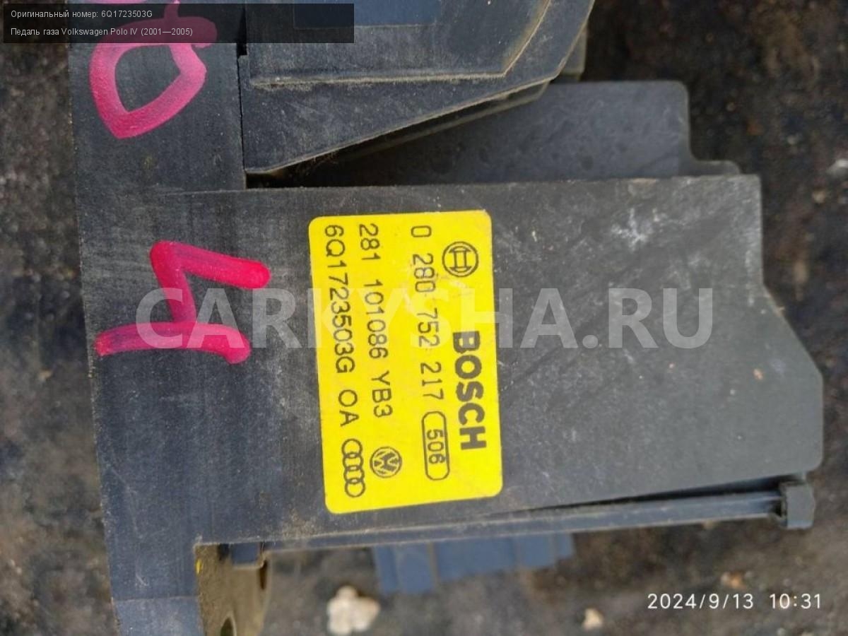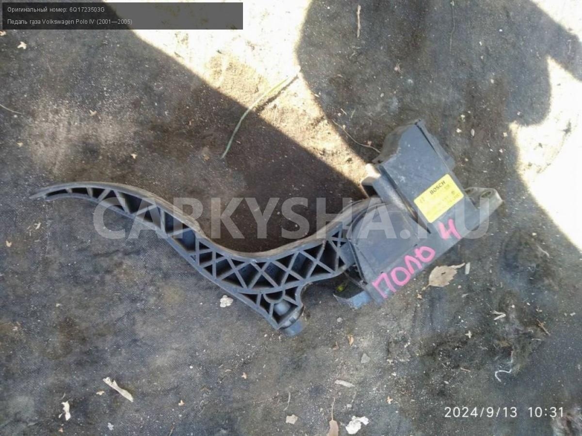 Volkswagen Polo IV , педаль газа.\nАртикул: 5717\n\nОриг. номер: 6Q1723503G\nПроизводитель: Bosch\nПримечание:Фольцваген Поло 4, педаль газа, б/у. \n\nМарка: Volkswagen\nМодель: Polo IV (2001—2005)\nГод выпуска: 2002\nКузов тип: Хетчбэк\nДвигатель номер: BBY\nМодель двигателя: инжектор\nОбъем: 1.4\nТопливо: Бензин\nКоробка: Автомат\nЦвет: Синий\nСовместимости: Volkswagen Polo IV (2001—2005) 1.4 AT (75 л.с.)\nСовместимость: