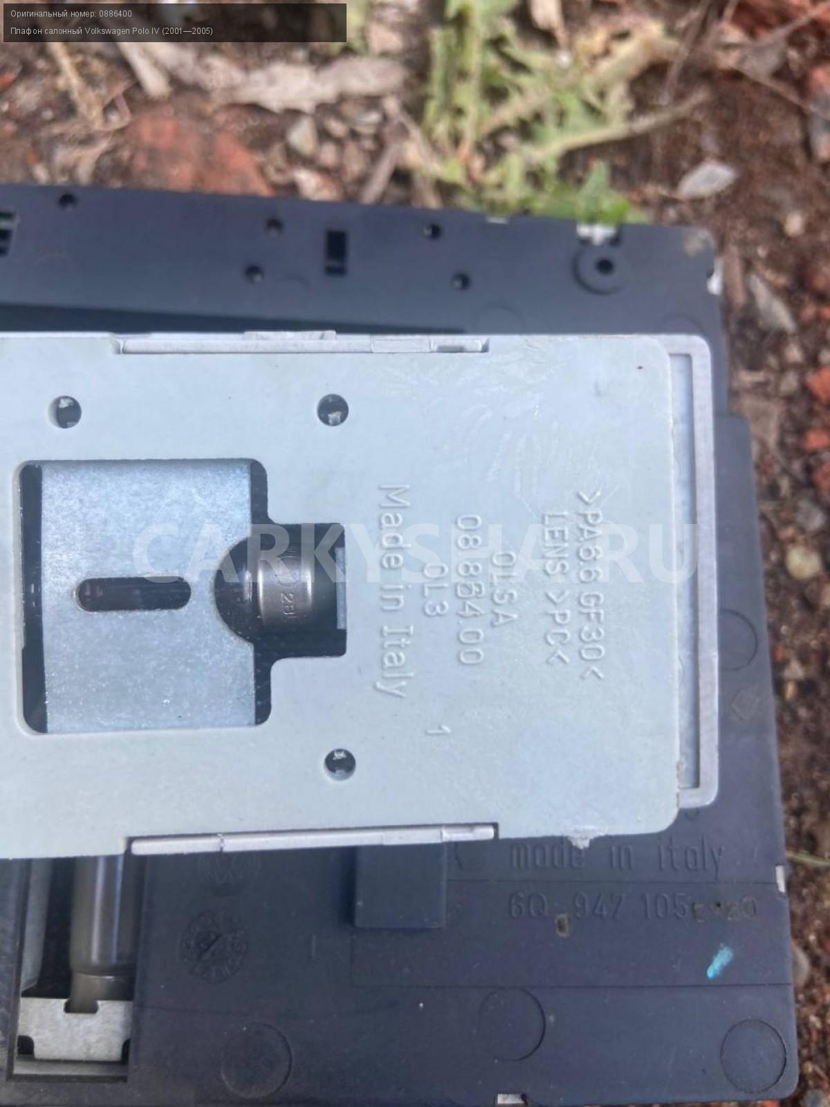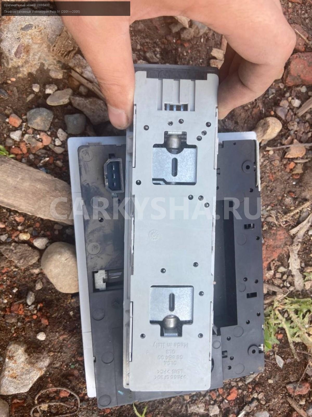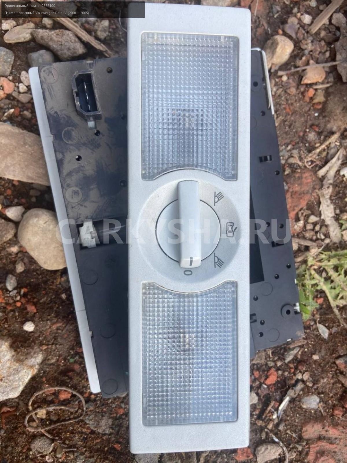 Volkswagen Polo IV , плафон освещения салона.\nАртикул: 5380\n\nОриг. номер: 0886400\nПроизводитель: VAG\nПримечание:Фольцваген Поло 4 , плафон освещения салона, б/у. \n\nМарка: Volkswagen\nМодель: Polo IV (2001—2005)\nГод выпуска: 2002\nКузов тип: Хетчбэк\nДвигатель номер: BBY\nМодель двигателя: инжектор\nОбъем: 1.4\nТопливо: Бензин\nКоробка: Автомат\nЦвет: Синий\nСовместимости: Volkswagen Polo IV (2001—2005) 1.4 AT (75 л.с.)\nСовместимость: