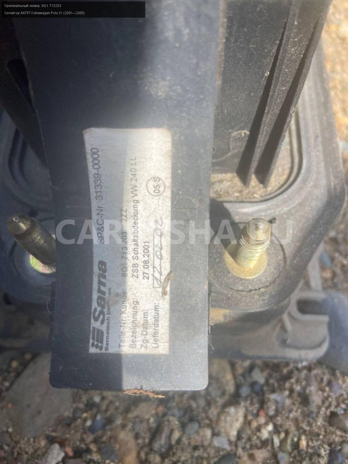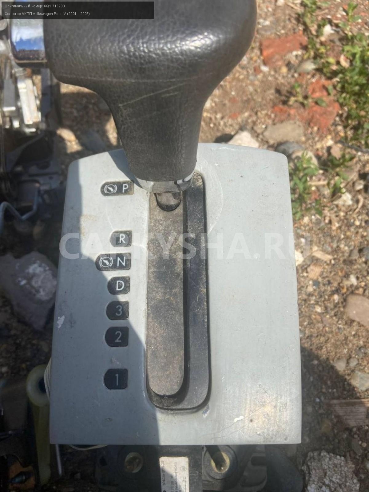 Volkswagen Polo IV , селектор акпп.\nАртикул: 5374\n\nОриг. номер: 6Q1 713203\nПроизводитель: VAG\nПримечание:Фольцваген Поло 4, селектор акпп, б/у. \n\nМарка: Volkswagen\nМодель: Polo IV (2001—2005)\nГод выпуска: 2002\nКузов тип: Хетчбэк\nДвигатель номер: BBY\nМодель двигателя: инжектор\nОбъем: 1.4\nТопливо: Бензин\nКоробка: Автомат\nЦвет: Синий\nСовместимости: Volkswagen Polo IV (2001—2005) 1.4 AT (75 л.с.)\nСовместимость: