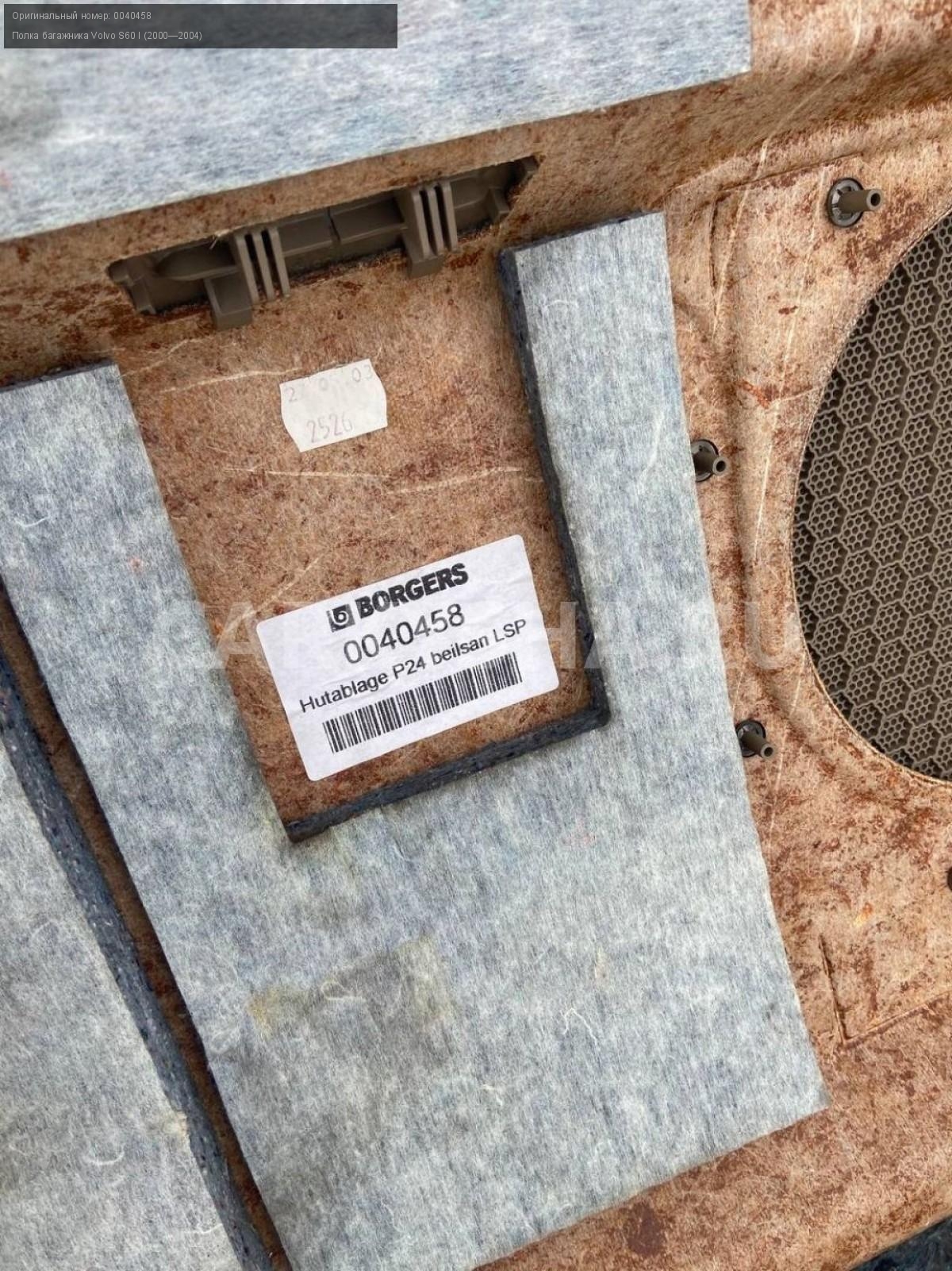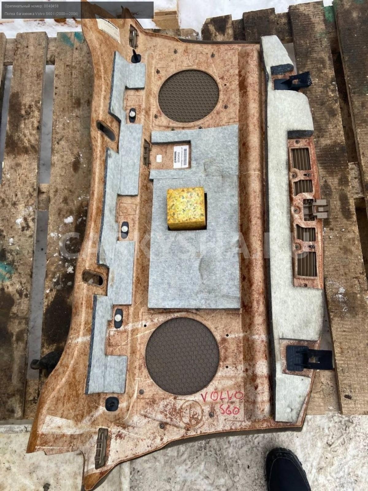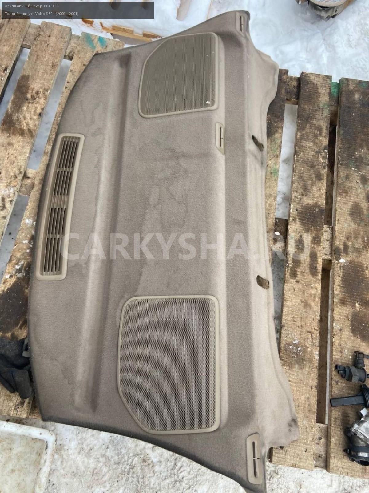 Volvo S60, полка багажника.\nАртикул: 6935\n\nОриг. номер: 0040458\nПроизводитель: VOLVO\nПримечание:Вольво S60, полка багажника, б/у. \n\nМарка: Volvo\nМодель: S60 I (2000—2004)\nГод выпуска: 2003\nКузов тип: Седан\nДвигатель номер: B5244S\nМодель двигателя: инжектор\nОбъем: 2.4\nТопливо: Бензин\nКоробка: Автомат\nЦвет: Черный\nСовместимости: Volvo S60 I (2000—2004) 2.4 AT (170 л.с.)\nСовместимость: