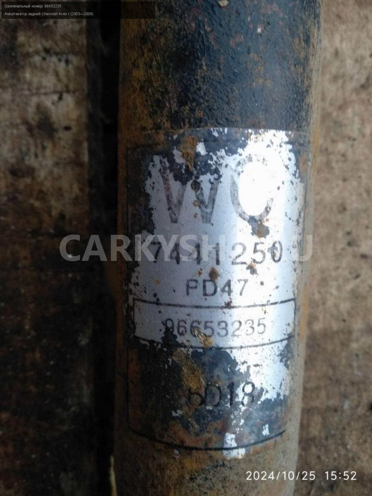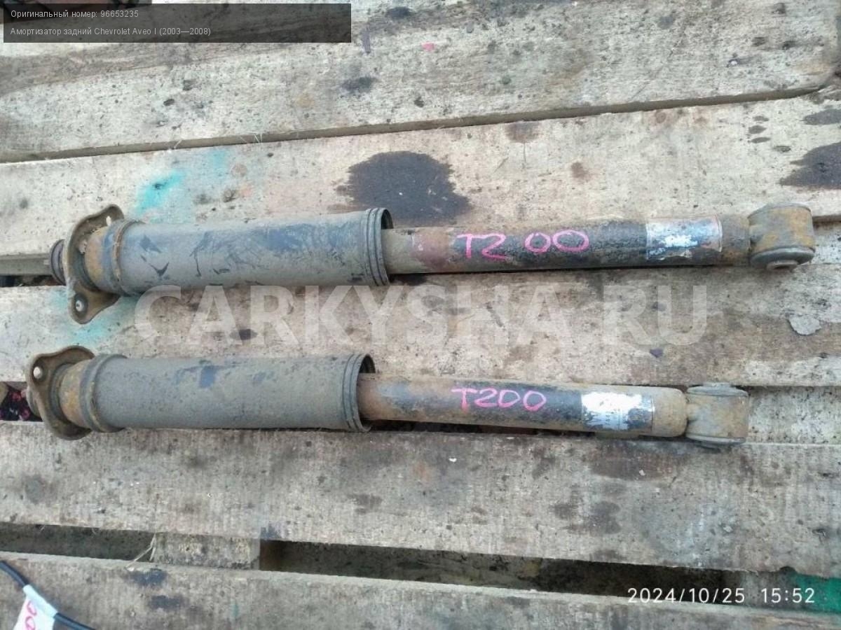 Chevrolet Aveo T200 хэтчбек, амортизаторы задние.\nАртикул: 6094\n\nОриг. номер: 96653235\nПроизводитель: GENERAL MOTORS\nПримечание:Шевроле Авео Т200 хэтчбек, амортизаторы задние, цена за пару, б/у. \n\nМарка: Chevrolet\nМодель: Aveo I (2003—2008)\nГод выпуска: 2007\nКузов тип: Хетчбэк\nДвигатель номер: B12S1\nМодель двигателя: инжектор\nОбъем: 1.2\nТопливо: Бензин\nКоробка: Механика\nЦвет: Темно-серый\nПраво/Лево: Право/Лево\nПеред/Зад: Зад\nСовместимости: Chevrolet Aveo I (2003—2008) 1.2 MT (72 л.с.)\nСовместимость: