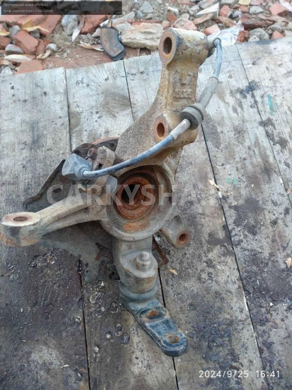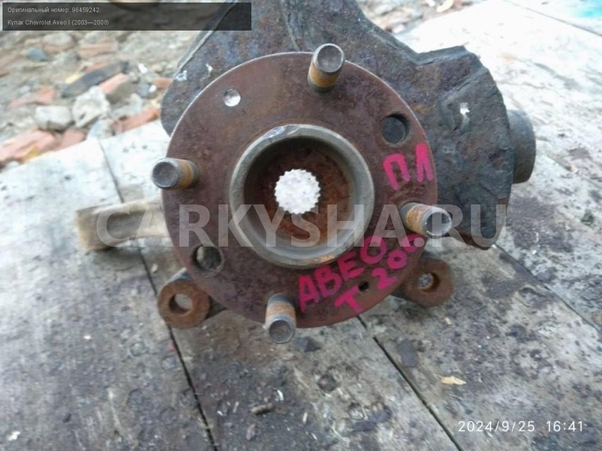 Chevrolet Aveo Т200, кулак поворотный левый передн\nАртикул: 5759\n\nОриг. номер: 96459242\nПроизводитель: GENERAL MOTORS\nПримечание:Шевроле Авео Т200, кулак поворотный передний левый, б/у. \n\nМарка: Chevrolet\nМодель: Aveo I (2003—2008)\nГод выпуска: 2007\nКузов тип: Хетчбэк\nДвигатель номер: B12S1\nМодель двигателя: инжектор\nОбъем: 1.2\nТопливо: Бензин\nКоробка: Механика\nЦвет: Темно-серый\nПраво/Лево: Лево\nПеред/Зад: Перед\nСовместимости: Chevrolet Aveo I (2003—2008) 1.2 MT (72 л.с.)\nСовместимость:
