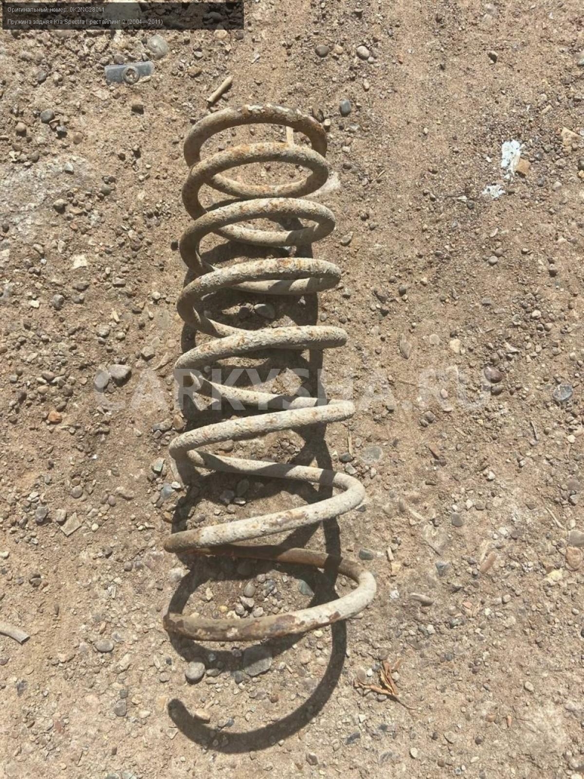 Kia Spectra I рестайлинг 2, пружина задняя\nАртикул: 2778\n\nОриг. номер: 0K2NC28011\nПроизводитель: Hyundai-KIA\nПримечание:Киа Спектра 1 рестайлинг2, пружина задняя, б/у\n\nМарка: Kia\nМодель: Spectra I рестайлинг 2 (2004—2011)\nГод выпуска: 2007\nКузов номер: XWKFB227270059114\nКузов тип: Седан\nДвигатель номер: S6D\nМодель двигателя: инжектор\nОбъем: 1.6\nТопливо: Бензин\nКоробка: Механика\nЦвет: Серый/ Алмазное серебро\nПеред/Зад: Зад\nСовместимости: Kia Spectra I рестайлинг 2 (2004—2011) 1.6 MT (101 л.с.)\nСовместимость: