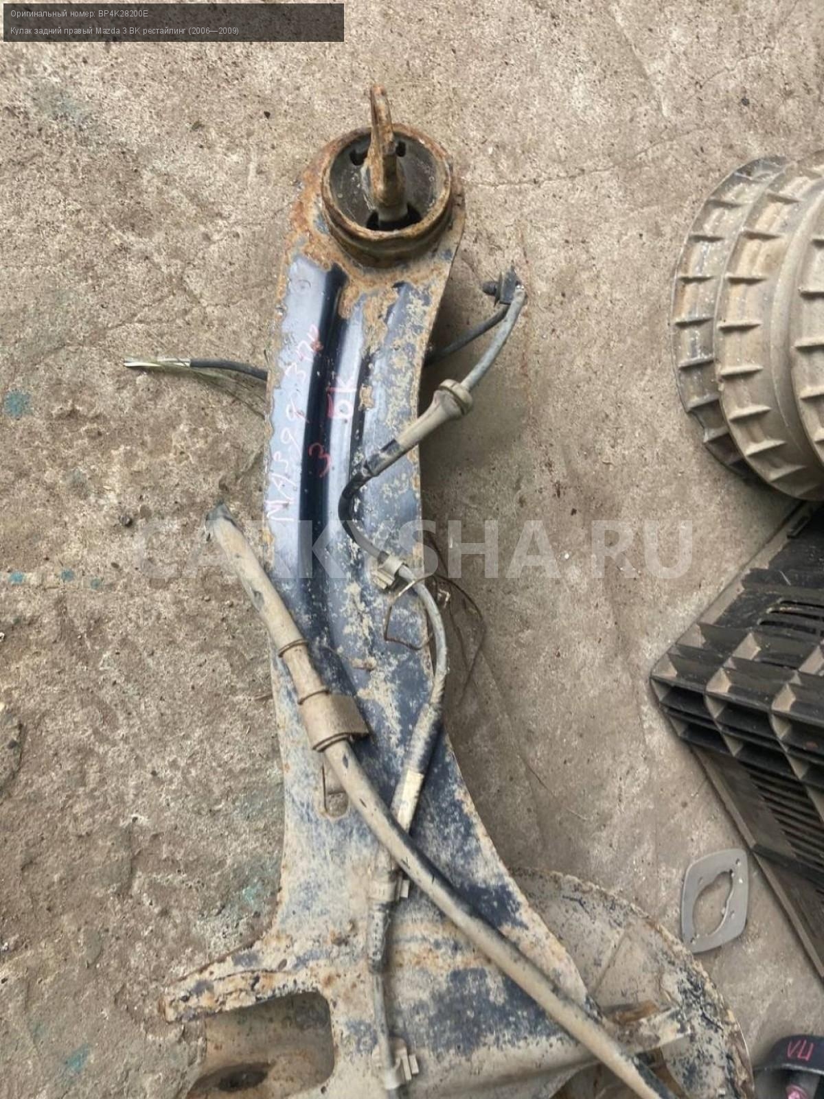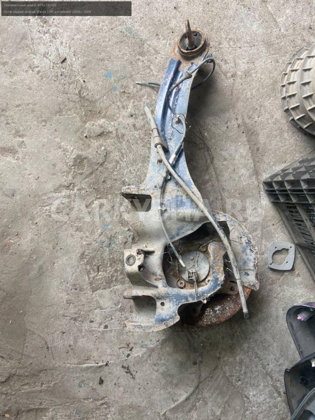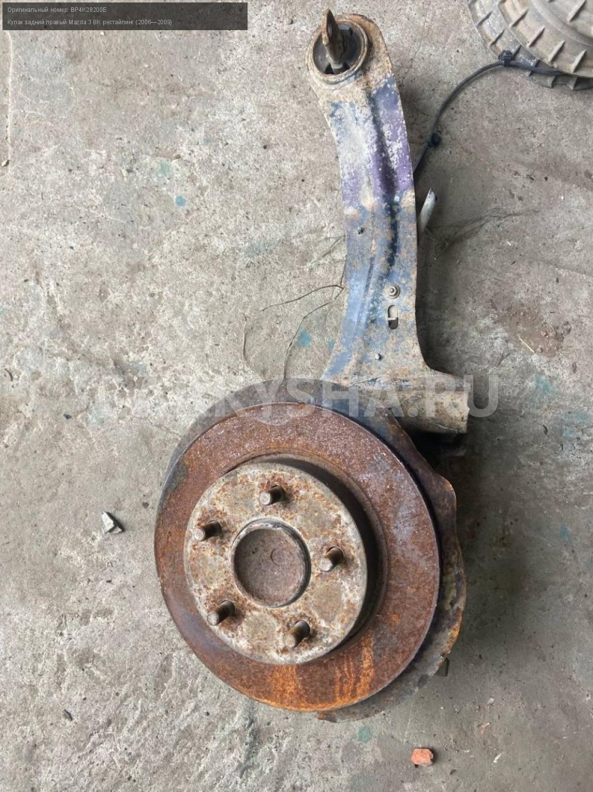 Mazda 3 BK, кулак поворотный задний правый с рычаг\nАртикул: 8386\n\nОриг. номер: BP4K28200E\nПроизводитель: MAZDA\nПримечание:Мазда 3ВК, кулак поворотный задний правый с рычагом в сборе, как на фото, б/у. \n\nМарка: Mazda\nМодель: 3 BK рестайлинг (2006—2009)\nГод выпуска: 2007\nКузов тип: Хетчбэк\nДвигатель номер: Z6\nМодель двигателя: инжектор\nОбъем: 1.6\nТопливо: Бензин\nКоробка: Автомат\nЦвет: 34N\nПраво/Лево: Право\nПеред/Зад: Зад\nСовместимости: Mazda 3 BK рестайлинг (2006—2009) 1.6 AT (105 л.с.)\nСовместимость: